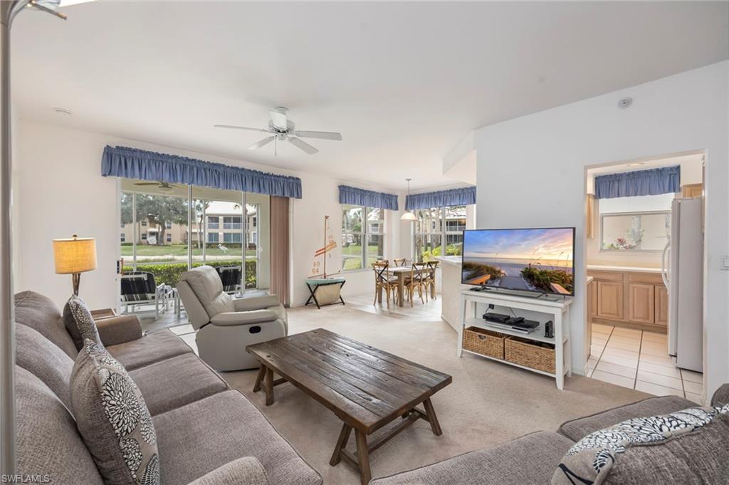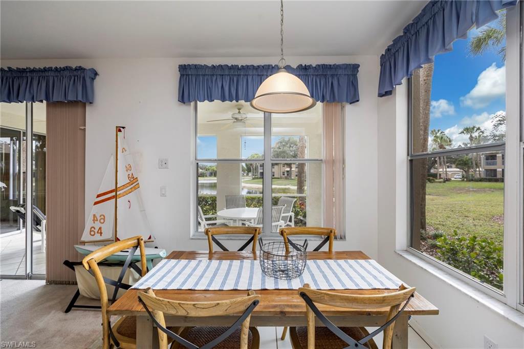 Welcome to this beautiful waterfront 3-bedroom, 2-bath first-floor coach home in the sought-after Lakemont Cove at Pelican Landing, offering one of the best long lake views in the community. This end-unit features a spacious open floor plan with high ceilings, abundant natural light, and a seamless open-concept layout. Highlights include a stylish kitchen with solid white countertops, natural wood cabinetry, and a newer A/C. The spacious primary suite and living room open to a screened lanai with serene water views and storm protection, ideal for relaxing or entertaining. The home is being sold turnkey, with the exception of two paintings and the sailboats, and features quality furnishings and tasteful coastal decor throughout. Additional features a rare two-car garage, large driveway with guest parking, a large front yard with shade trees and refreshing breezes. Pelican Landing offers an unmatched resort lifestyle with a private 34-acre Gulf-front beach island, boat shuttle, tennis, pickleball, fitness center, marina, kayak park, and optional golf at The Nest. Ideally located west of US-41 and minutes from Coconut Point, Mercato, and premier dining and shopping, this is a rare opportunity to own a lakefront home that perfectly blends luxury, comfort, and lifestyle.