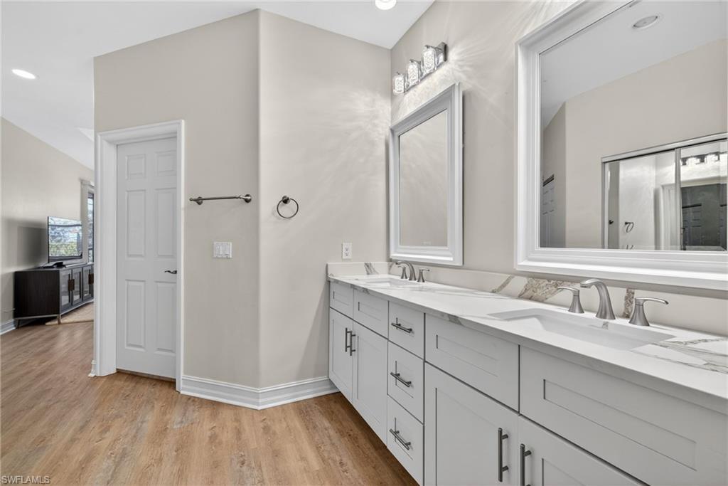 Sensational and fully renovated, this second-floor carriage home in Pelican Sound is the coastal retreat you’ve been waiting for! Thoughtfully updated throughout, this residence showcases a bright, open great-room floor plan and designer touches at every turn. The stunning new kitchen features quartz countertops, LG stainless steel appliances, soft-close cabinetry, and an elegant glass tile backsplash. The spacious primary suite offers a tray ceiling, private lanai access, and a beautifully renovated bath complete with quartz counters, dual sinks, and a walk-in shower with a frameless glass door. Guests will enjoy their own updated bath with quartz counters and modern finishes. Luxury vinyl wood-look flooring flows seamlessly throughout the home, complemented by crown molding and upgraded designer fans and lighting. Additional features include a new tankless water heater and a/c, 2018, and an attached two-car garage with durable racetrack plastic flooring. Take in the amazing Florida sunsets on the private lanai, just a few steps away from the neighborhood pool. Move-in ready and impeccably styled—this carriage home is the perfect blend of comfort, luxury, and coastal charm. If you are looking for an active lifestyle look no further: 27 holes of Championship golf, 14 pickleball, 8 tennis and 6 bocce courts. State of the art fitness center that is professionally staffed. Pelican Sound is nestled up to the Estero River with access to the Gulf. The community offers dry boat storage, kayaks, canoes and paddle boarding, along with a shuttle boat to Lovers Key State Beach Park. Minutes from RSW International airport and surrounded by fabulous shopping and restaurants. Start Living The Dream!