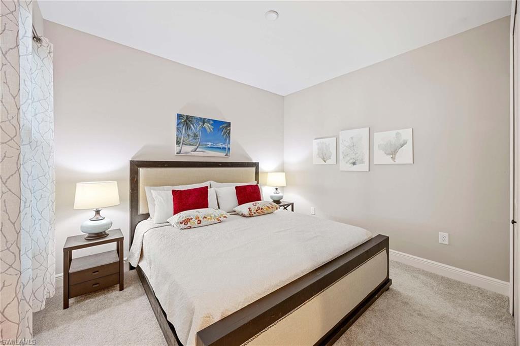 Located in Marquesa Isles, this two-bedroom plus den residence blends timeless design with modern upgrades. The foyer opens to 9-foot ceilings, 8-foot doors and 24-by-12-inch ceramic tile flooring in the main living areas. Glass French doors lead to an 11-by-12-foot den, suitable for a home office, reading space or guest accommodations. The open kitchen features an oversized quartz island, G.E. stainless steel appliances, designer tile backsplash, 42-inch cabinetry with crown molding and under-cabinet lighting. The 16-by-17-foot great room includes a coffered ceiling with crown molding and southern exposure lake views. The primary suite includes a walk-in closet, additional closet, and an en-suite bath with dual sinks and an oversized, designer-tiled shower. The screened lanai spans 14-by-10 feet with a 10-foot extension and sunshade, overlooking the lake. Additional features include impact pocket sliding doors, plush bedroom carpeting, custom window treatments, Smart Hub integration with Z-wave devices, Hotwire fiber-optic service, and an 18-by-20-foot garage with epoxy floor, insulated door and attic insulation. Marquesa Isles amenities include a clubhouse, resort-style pool and hot tub, dog park and landscaped grounds, all within a gated community close to Naples shopping, golf and beaches.