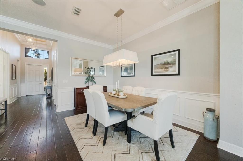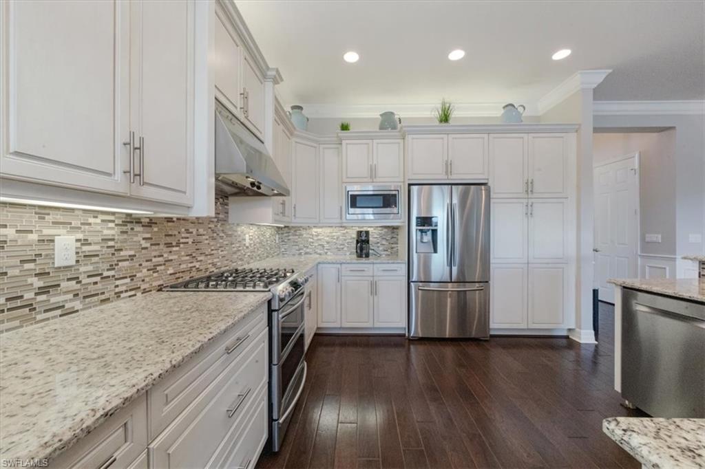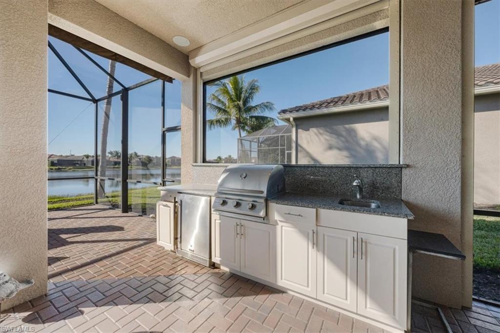 "Live life beautifully in Southwest Florida" in an exceptional four-bedroom, three-bathroom home. Situated on a larger lot with southern exposure and an expansive side yard, this residence stands out for its extensive custom upgrades, thoughtful design, and rare features not commonly found in the community. One of the home’s most desirable highlights is the gas kitchen, an exceptional and rarely available feature in Marbella Isles. Powered by a 120-gallon buried propane tank, the kitchen is outfitted with upgraded Samsung refrigerator, gas stove and oven, Bosch dishwasher, soft-close cabinetry, and pantry pull-outs—ideal for both everyday living and entertaining. Built with peace of mind, the home features hurricane-impact windows and sliding glass doors throughout, along with two roll-down hurricane shutters on the lanai. The front entry has been redesigned with step removal for a seamless, accessible approach. Curb appeal is enhanced by an expanded driveway and walkway, with professionally installed exterior lighting. Outdoor living is a highlight, featuring an extended lanai and pool enclosure, custom summer kitchen with refrigerator and sink, motorized lanai awning, integrated lanai cage lighting, and a Bose digital speaker system, creating a perfect space to relax or entertain year-round. Inside, the home showcases refined finishes including custom chandeliers and ceiling fans, additional pendant lighting in the foyer and kitchen, crown molding with integrated lighting throughout, decorative moldings in select rooms, and custom living room built-in cabinetry. The primary suite bathroom has been beautifully upgraded with a reconfigured shower, side-mounted faucets, premium fixtures, built-in seating, custom frameless glass enclosure, quartz countertops (2023), designer lighting (2024), beadboard detailing, and updated faucets. Storage is exceptional with five professionally designed custom closets, custom cabinetry with integrated wine refrigerator, a fully customized laundry room, and a garage featuring epoxy flooring and custom cabinetry. Additional storage is available via pull-down attic stairs with reinforced plywood flooring. Window treatments include custom drapery, tailored valances, Hunter Douglas designer shades, blinds, and shutters throughout. Additional features include a smart thermostat, Blink security system, Bose interior speakers, and an enhanced I-Flow air conditioning system. Residents of Marbella Isles enjoy a full-service clubhouse, oversized resort-style pool, tennis and pickleball courts, fitness center, card and game rooms, and a half-court basketball & volleyball court. Ideally located just 25 minutes from SW FL's International Airport, 10 minutes to local beaches and Mercato shopping & dining district, & 15 minutes to downtown Naples, 13867 Luna Drive offers a rare opportunity to own a meticulously upgraded home with a true gas kitchen in one of Naples’ most desirable communities.