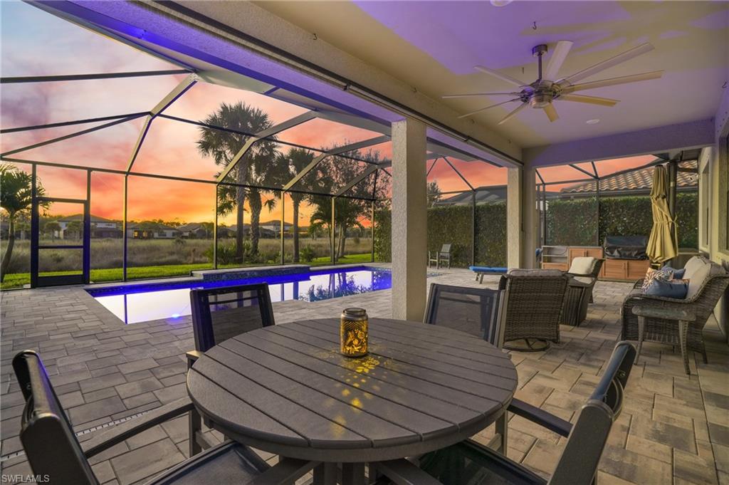 Located in the gated, resort-style community of The Place at Corkscrew, this inviting two-story home offers peaceful marsh views, west-facing sunset exposure, and well-designed indoor and outdoor living spaces. Built by Pulte Homes, the Citrus Grove floorplan provides 2,859 square feet of living space with four bedrooms, a first-floor den, an upstairs loft, and 2.5 bathrooms. The primary suite is located on the main level, while three additional bedrooms and a spacious loft upstairs offer flexibility for guests, work-from-home needs, or everyday living. A 2-car garage with a 4-foot extension adds extra storage. The interior features wood-look laminate flooring in the main living areas, white cabinetry, quartz countertops, and tray ceilings in the great room, den, loft, and primary suite. Additional highlights include a custom fireplace and TV feature wall, impact-glass front door insert, glass-enclosed primary shower, mini-split climate control in the garage, and a dedicated attic storage room. Outdoor living is easy to enjoy year-round with a custom saltwater pool featuring a lagoon-style finish, sheer descent waterfalls, LED lighting, a modular outdoor kitchen, and a covered lanai overlooking the marsh. The west-facing orientation creates a comfortable outdoor setting with beautiful sunset views. Residents enjoy a wide range of amenities, including a resort-style pool with waterslide and spa, indoor dining options, café, bourbon bar, outdoor bar, large fitness center with childwatch services, movement studio, tennis, pickleball, bocce, basketball, playground, dog park, spa services, and two manned guard gates staffed 24/7. Fencing is permitted. Conveniently located near I-75, approximately 20 minutes from Southwest Florida International Airport, and close to Miromar Outlets, Gulf Coast Town Center, and Coconut Point, this home offers a comfortable lifestyle in one of Southwest Florida’s most desirable communities.