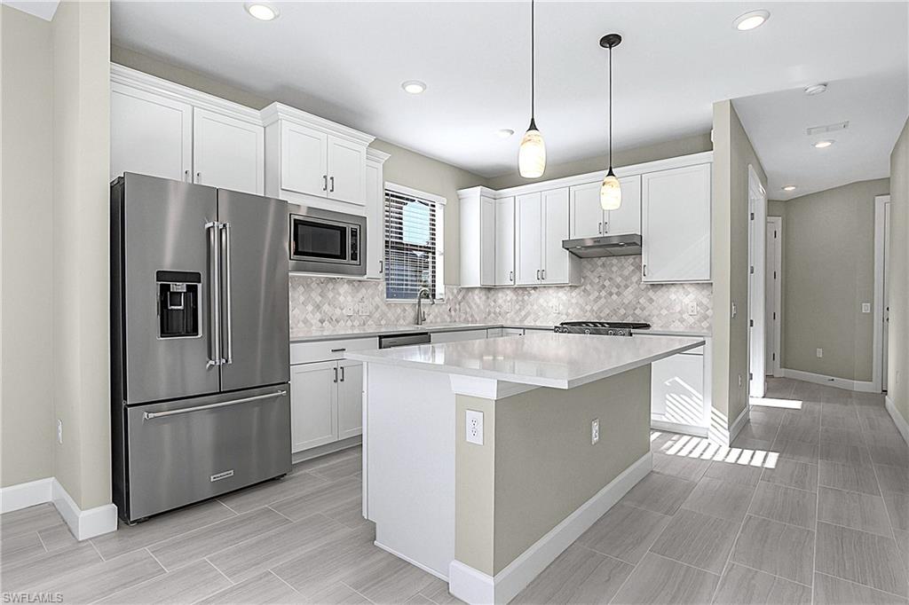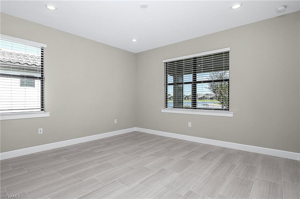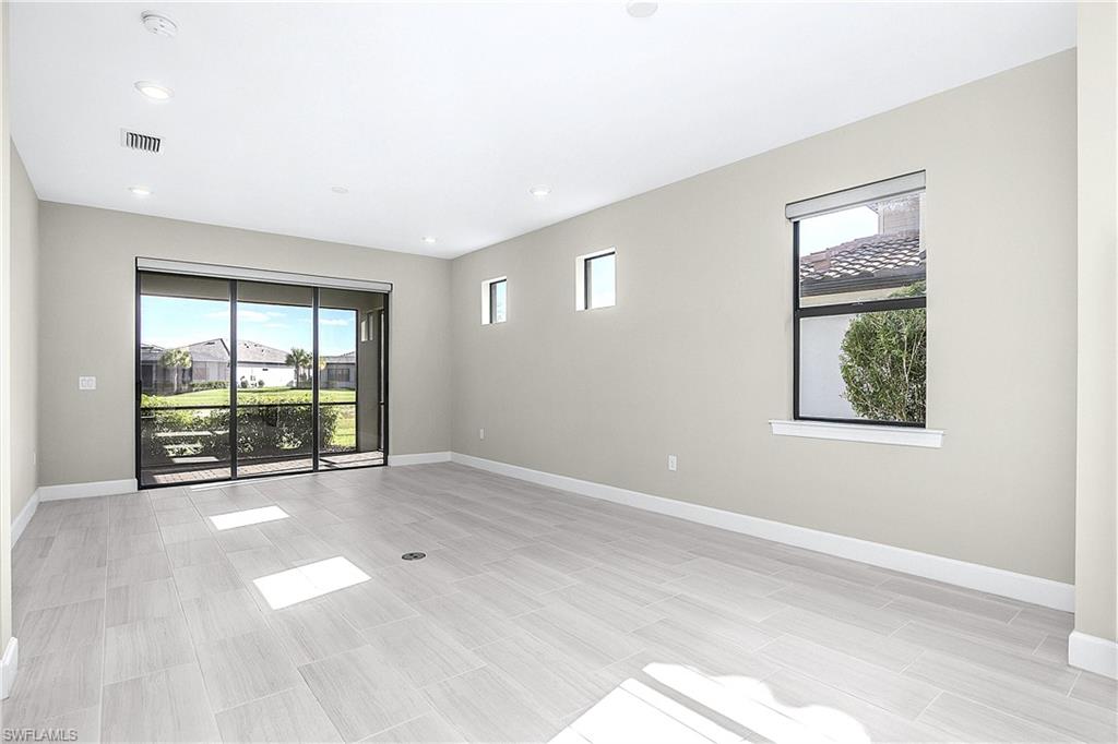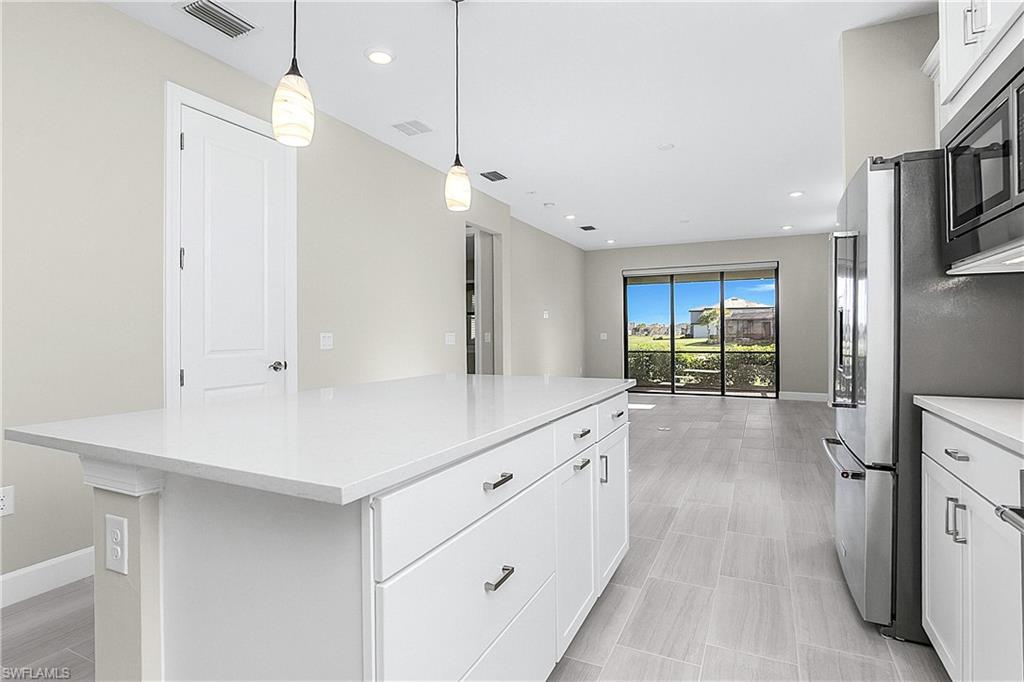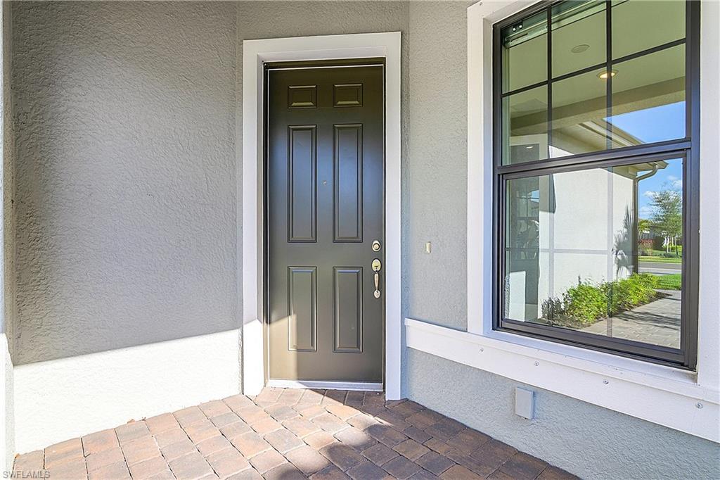 MOVE IN RIGHT AWAY AND ENJOY THIS SEASON! HIGHLY DESIRABLE LAKEFRONT HOME WITH SOUTHERLY REAR EXPOSURE IN VERDANA VILLAGE. This “Contour” model by Pulte offers 2 Bedrooms + Den, 2 Baths, 2 Car Garage w/4' EXTENSION, 1,405sf living area. ULTRA QUIET REAR LANAI... the back of the home faces away from Corkscrew Road (NO ROAD NOISE HERE)! This home is located in FLOOD ZONE X (No flood insurance required if financing). The heart of the home offers OPEN CONCEPT LIVING, ideal for everyday comfort and entertaining. Sliding glass door opens to a massive, EXTENDED COVERED LANAI (30’ x 10’) creating a seamless indoor/outdoor living space. Relax on your lanai while taking in those SPARKLING WATER VIEWS. The OVERSIZED HOMESITE provides EXTRA GREEN SPACE on the both sides of the home and a SPACIOUS BACKYARD. Easy to add a fence for your fur babies to run around and/or install your dream oasis with a custom-built POOL/SPA. Inside, you’ll find a CHEF’S KITCHEN equipped with a NATURAL GAS RANGE and UPGRADED KITCHEN-AID STAINLESS STEEL APPLIANCES. The WHITE cabinetry, CARRARA STYLE QUARTZ countertops, Marble Arabesque Backsplash, and UNDERCABINET LIGHTING create a timeless look. The kitchen island and the pantry provide additional storage. The 12 x 24 PORCELAIN PLANK TILE flooring flows throughout the home (NO CARPET!). Greatroom features motorized window treatments and recessed lighting. The Primary Suite with large windows overlooks the TRANQUIL LAKE. The Primary Bath showcases QUARTZ Countertops, dual sinks, an OVERSIZED ENCLOSED SHOWER, private water closet and linen closet along with a LARGE WALK IN CLOSET. The Secondary Bedroom offers a spacious getaway for guests to relax. The Secondary Bathroom showcases QUARTZ countertops and a Tub/Shower with HEAVY GLASS ENCLOSURE. The Den overlooks the front porch and features glass accented double doors. The Laundry is equipped with washer and dryer. Garage is complete with a HEAVY FLAKE EPOXY FLOOR. Verdana Village residents enjoy an unbeatable amenity package including indoor/outdoor pickleball & tennis, indoor basketball, bocce ball, clubhouse, dog park, resort-style pool & spa, fitness, movement studio, playground w/sun shade, a full-service restaurant, craft beer lounge, cafe and indoor/outdoor patio bar. Additional satellite amenity campuses with pools/lap lanes and fitness centers are found in each village. Adjacent to Verdana Village is a new Publix grocery store, Dunkin’ Donuts, Nail salon, Hair Salon, UPS Store, Italian Restaurant and more. Across the street is a fire station with full EMS services. For GOLF ENTHUSIASTS, the highly rated Jack Nicklaus designed OLD CORKSCREW GOLF CLUB is open to the public and located just 1.5 miles away. Conveniently located just 25 MINUTES TO SOUTHWEST FLORIDA INTERNATIONAL AIRPORT, 15 MINUTES TO AMAZING SHOPPING at MIROMAR OUTLETS AND GULF COAST TOWN CENTER, and only 30-45 MINUTES TO BONITA BEACH.