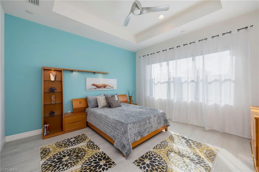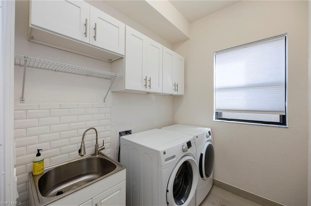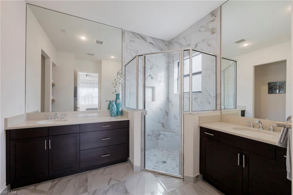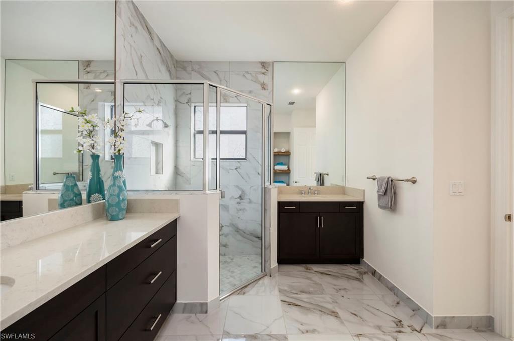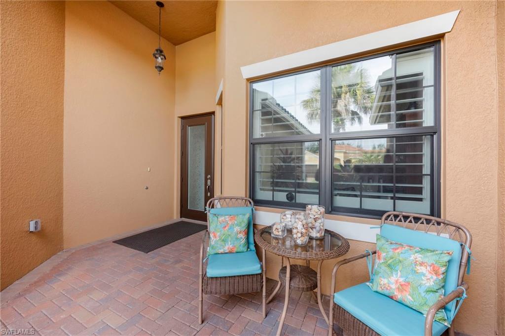 "Live Life Beautifully In Southwest Florida" at this beautifully upgraded residence in Marbella Isles. This home’s southern exposure and tranquil lake view create a light-filled setting and provide the perfect backdrop for everyday living and outdoor enjoyment. Inside, the home features modern wood-look porcelain tile flooring throughout the main living areas, complemented by contemporary ceiling fans and window treatments with shades throughout, including plantation shutters on the front window and Vertiglides on the sliding doors for privacy and light control. The kitchen—originally designed as the GL Homes model kitchen—serves as a true focal point, offering both style and function. Upgrades include lower cabinetry redesigned with drawers instead of doors, an additional wall cabinet for extra storage, and a cabinet-style pantry conversion. The kitchen is complete with a modern KitchenAid hood with integrated lighting, KitchenAid refrigerator, GE cooktop with standalone oven and microwave, an upgraded large porcelain sink, and a layout ideal for both daily living and entertaining. Significant mechanical and system upgrades provide peace of mind, including a high-efficiency 3.5-ton air conditioning system installed in 2022, featuring UV light technology to combat mold and allergens, an air ionization cleaning unit with transferable warranty. Additional improvements include a whole-house water filtration system and reverse osmosis for the kitchen sink and refrigerator. The primary bathroom has been upgraded with modern marble-look porcelain tile flooring and shower walls, creating a clean, spa-like retreat. Additional interior features include laundry room wall cabinetry, a laundry sink with tiled backsplash, upgraded sliding door rollers, and the home being pre-wired for an audio system. Outdoor living is enhanced by an extended paved lanai overlooking the lake, wired for a ceiling fan and equipped with two additional overhead lighting connections, making it an ideal space to enjoy the southern exposure and peaceful water views. Storm and utility preparedness are addressed with hurricane impact windows at the front of the home, accordion shutters for side windows and sliders, an exterior power hookup for a backup generator, and a transfer switch installed in the breaker panel. Residents of Marbella Isles enjoy an impressive array of amenities, including a resort-style pool, kiddie pool with slides, clubhouse with kitchen, community room, card and game rooms, fitness center, and a half-court basketball and volleyball court. Ideally located just 25 minutes from SW FL's International Airport, 10 minutes to local beaches and the Mercato shopping and dining district, and 15 minutes to Olde Naples “Downtown,” this home offers exceptional value, natural light, and lifestyle in one of Naples’ most desirable communities.