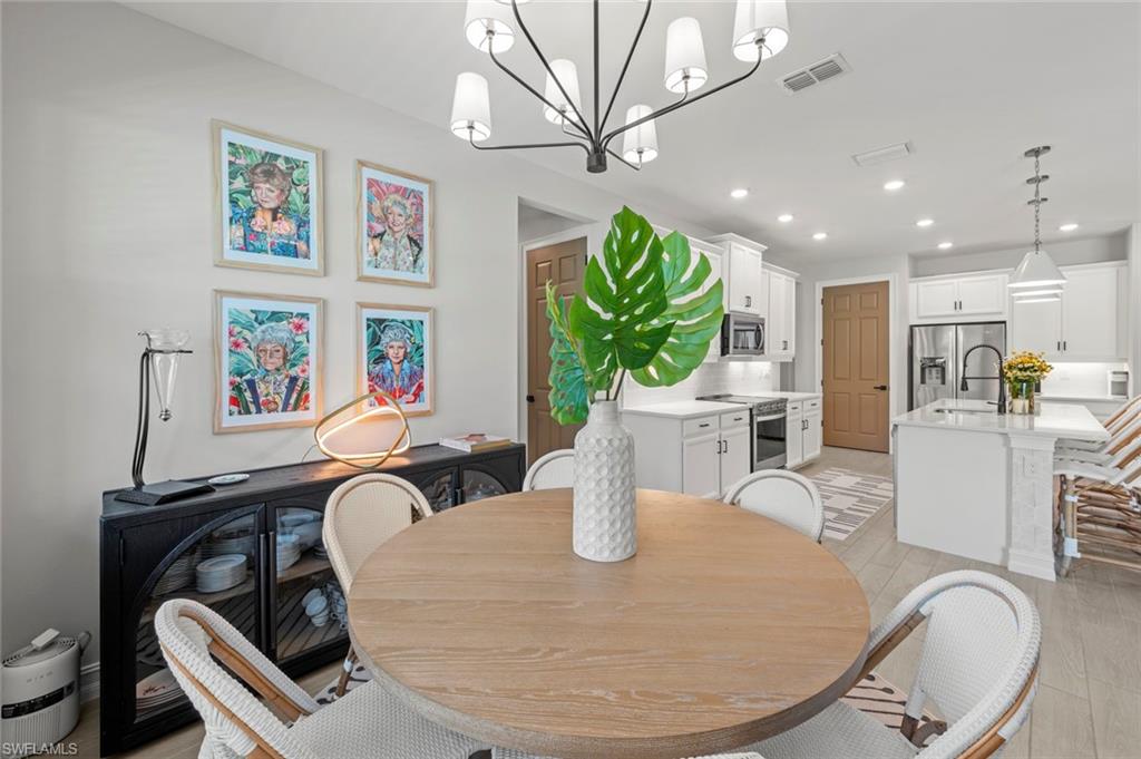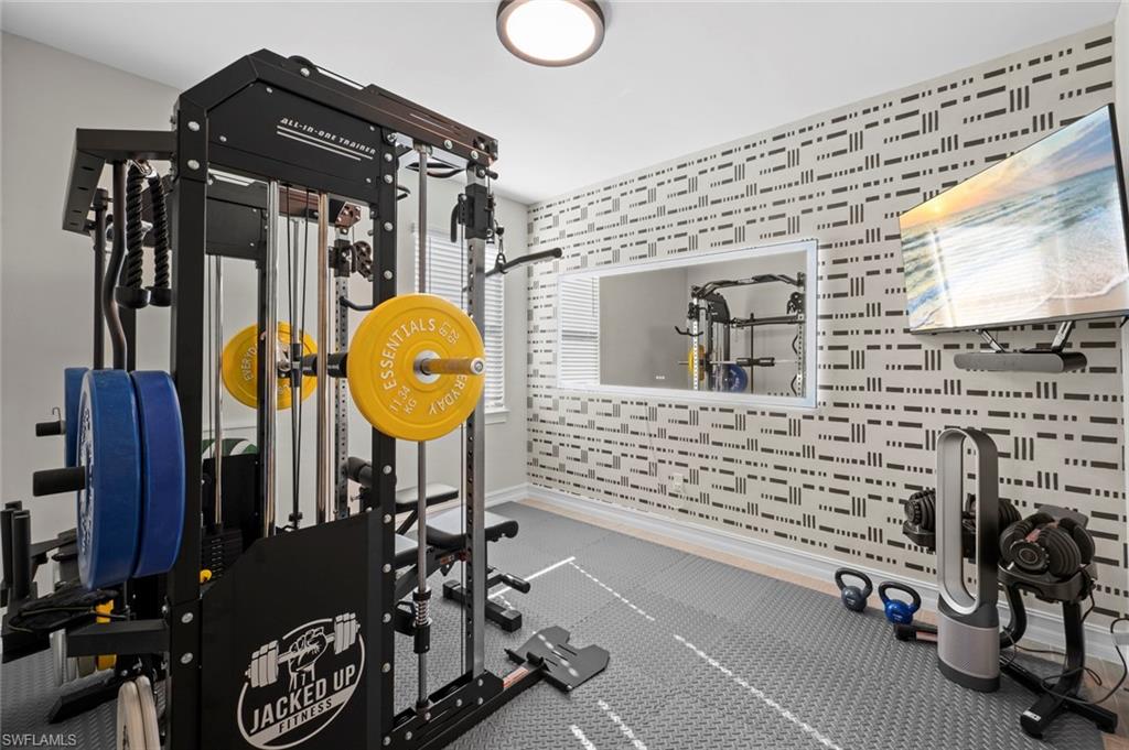 Discover high-end Florida living in this rare 2023-built hideaway, perfectly positioned on a desirable corner lot just minutes from Downtown Bonita Springs, Coconut Point, and Barefoot Beach. This beautifully upgraded non-HOA residence offers 4 spacious bedrooms plus a den, 3 full bathrooms, and a coveted 3-car garage, a true rarity in this location. Step inside to an expansive open-concept layout featuring stylish hardwood-look tile flooring throughout, designer lighting, and elevated finishes curated from Arhaus and Crate & Barrel. Impact-resistant windows, doors, and panoramic sliders provide peace of mind, while the home’s elevation places it outside of a flood zone. The true showstopper is the private outdoor retreat, designed for exceptional entertaining. Enjoy a heated saltwater pool and spa operated by a Pentair smart control system, surrounded by mature landscaping and privacy fencing creating a serene, resort-style escape rarely found in Southwest Florida. The space is complete with an outdoor ceiling fan, wall-mounted TV, and flat-top grill, ideal for effortless alfresco dining. An in-home gym adds even more versatility to this thoughtfully designed property. This home delivers luxury, privacy, and the ultimate Florida lifestyle without the HOA restrictions. Far from cookie-cutter, this one-of-a-kind gem is a rare opportunity in Bonita Springs. Schedule your private showing today and experience a home that truly stands apart.