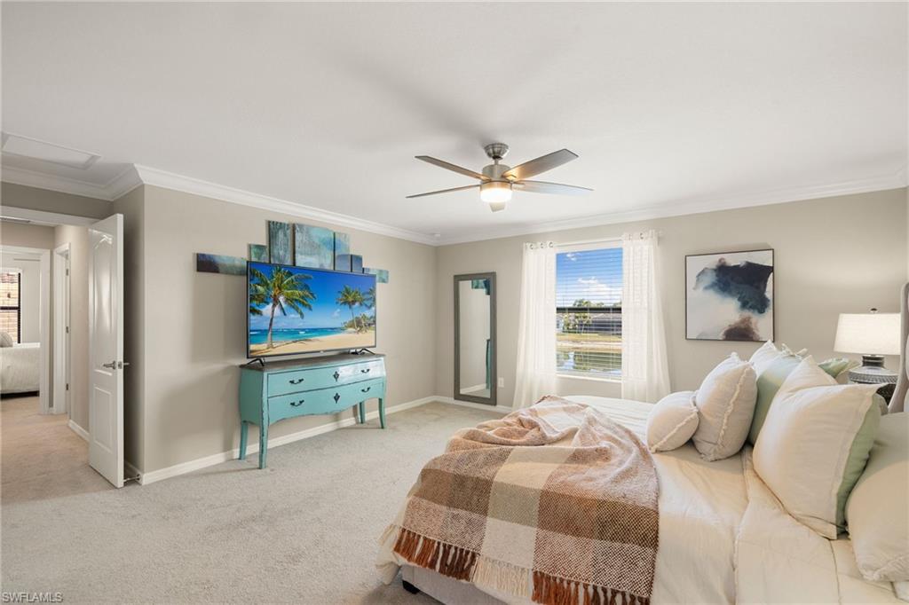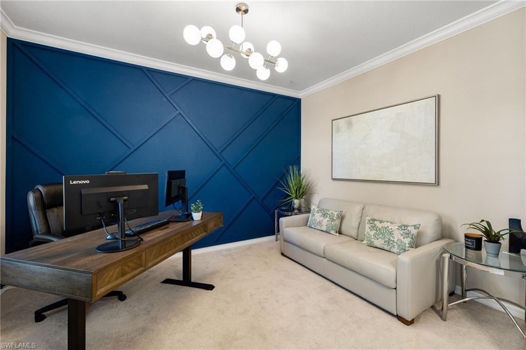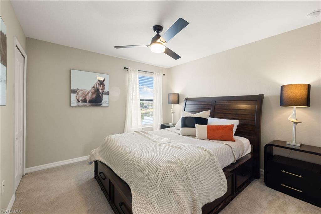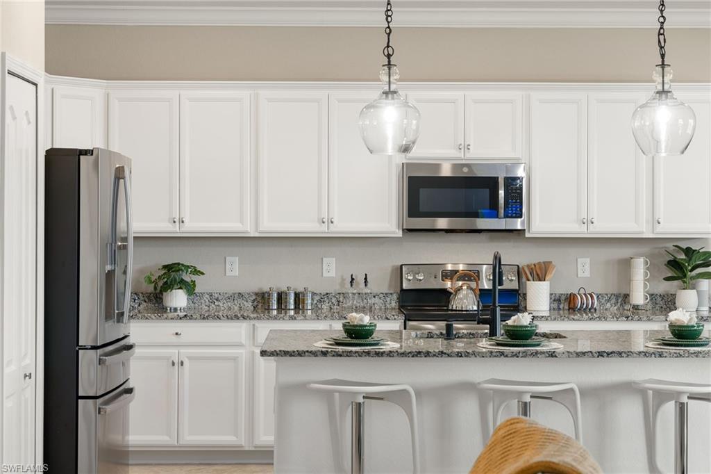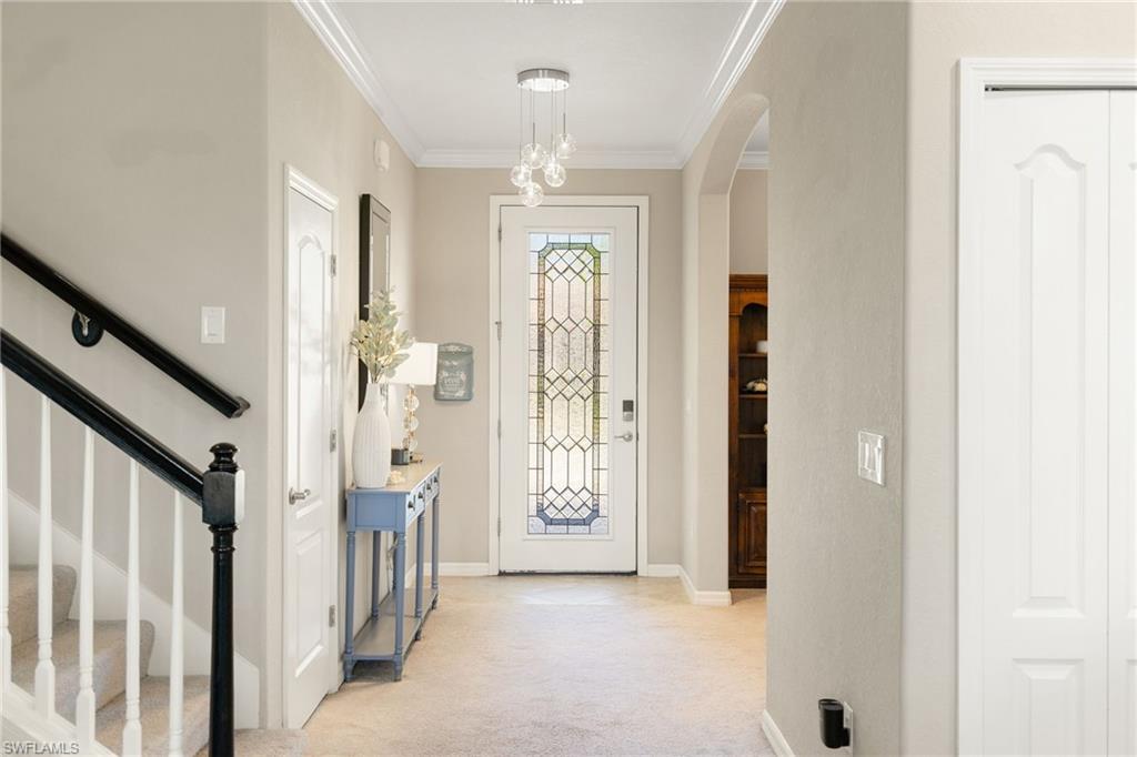 Enjoy Luxury North Naples Living in Amenity-Rich Bent Creek Preserve! Ideally located in the heart of North Naples, this exceptional two-story home offers the perfect blend of luxury, space, and convenience within one of the area’s most sought-after gated communities. Close to top-rated schools, premier shopping and dining, Interstate 75, and Naples’ renowned Gulf beaches, the location delivers both accessibility and privacy. Built in 2019, the home features four bedrooms plus a den, a spacious loft currently used as a media room, and three full bathrooms. The striking brick-accent façade and inviting entry set the tone, highlighted by a front door with a stained-glass-look insert that allows natural light to filter inside. The driveway has been expanded to accommodate generous three-car parking, offering added functionality beyond the typical two-car setup. The open-concept living and dining areas flow seamlessly into a beautifully designed kitchen featuring white cabinetry, darker granite countertops, and a large granite island with seating—perfect for entertaining and everyday living. Pendant lighting and stainless steel appliances complete the modern, polished look. The den/office showcases a stunning blue accent wall, creating a stylish and functional workspace. Upstairs, the versatile loft provides additional living space ideal for relaxing or gathering. The primary suite offers a spa-like bath with a separate soaking tub and shower. A separate in-residence laundry room adds everyday convenience. Enjoy peaceful lake views from the cozy lanai—an ideal spot for morning coffee or evening relaxation. Bent Creek Preserve offers resort-style amenities for all ages, including a lakeside clubhouse with event space, fitness center with steam room and showers, billiard room, resort pool and spa, tennis and pickleball courts, bocce ball, half-court basketball, and a playground. This home captures the best of North Naples living—spacious, refined, and perfectly located.
