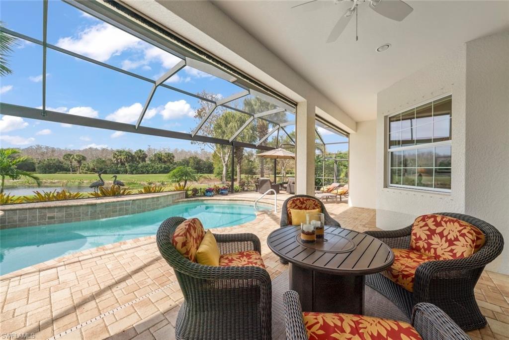 IMMEDIATE GOLF AVAILABLE. Enjoy the best of Naples golf and country club living with this light-filled, TURNKEY furnished residence in TwinEagles Golf & Country Club, where championship golf, natural beauty, and an active lifestyle come together seamlessly. Perfectly positioned to capture SPECTACULAR SUNSET VIEWS overlooking the golf course, lake, and surrounding preserves, this home offers an exceptional indoor-outdoor living experience that defines Southwest Florida living. Outdoor living truly shines with an oversized screened-in lanai enhanced by a NEW PICTURE SCREEN, new retractable shade screens, new outdoor fan and lighting, and a new outdoor TV, creating the perfect setting to relax, dine, or host family and friends while enjoying tranquil views. The thoughtfully designed floor plan features three bedrooms plus a den and two-and-a-half baths, highlighted by soaring ceilings and abundant natural light throughout. The spacious kitchen is well-appointed with stainless steel appliances, a new Bosch refrigerator, updated backsplash, and ample cabinetry, opening comfortably to the main living areas—ideal for both everyday living and entertaining. The primary bathroom offers a spa-like retreat, featuring a soaking tub, walk-in shower, and dual vanities designed for comfort and relaxation. Recent improvements include landscape renovations, a new AC unit, new tankless water heater, new EV charger, and updated lighting inside and out, ensuring comfort, efficiency, and peace of mind. TwinEagles residents enjoy a premier lifestyle with two championship golf courses, resort-style amenities, and the rare convenience of OWNING YOUR OWN GOLF CART within the community. With immediate golf available and a home that blends comfort, elegance, and location, this is a standout opportunity to experience one of Naples’ most sought-after golf communities.