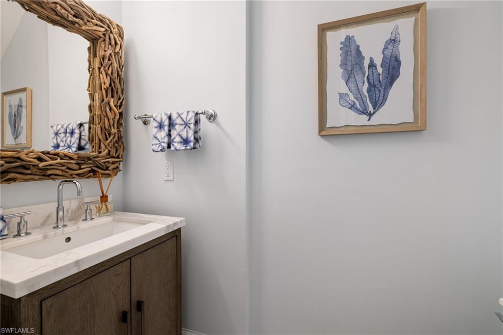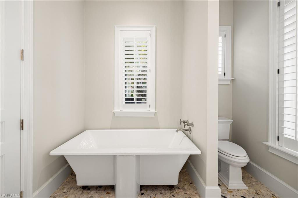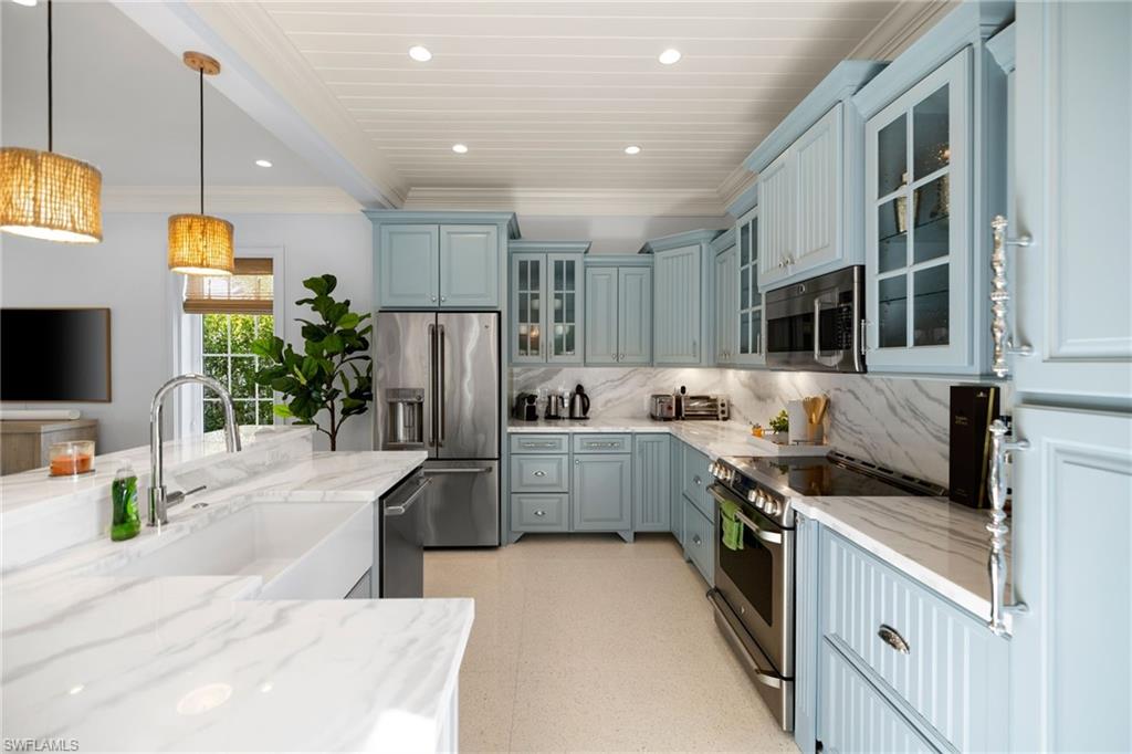 This stylishly updated, fully furnished lakefront beach cottage in Olde Naples offers a bright and open first floor with new terrazzo marble floors, large windows, and contemporary furnishings. The primary bedroom on the first floor features new hardwood floors, a Samsung Art Screen TV, an Avocado organic mattress, and views of the garden, pool, and lake. The spa-like primary bathroom includes a soaking tub, double vanity with marble countertops, new bathroom hardware, elegant lighting, mirrors, and a newly tiled shower with dual high-pressure shower heads. The fully stocked kitchen is equipped with new marble countertops and backsplash, a new dishwasher, ample storage, and a farmhouse sink with a new Insinkerator. The dining area seats six, and the large first-floor laundry room has a new washer and dryer. A powder half bath on the first floor features a new vanity with a marble top. Upstairs, the two bedrooms have vaulted ceilings and can accommodate five people. The east-facing room has a queen bed, while the larger room, facing the backyard, has a king bed and a twin daybed. Both rooms have Samsung Art Screen TVs and generous closet storage. The backyard boasts a heated pool with ambient lighting, a screened-in lanai, a new BBQ gas grill, and a firepit. With views of the lake, the home is just steps away from the beach, the new Four Seasons complex, and a golf course. This property has excellent rental income potential year-round.
