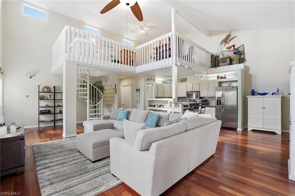 Waterfront duplex offering island living at its finest, ideally located on a quiet cul-de-sac street on the highly desirable south end of Fort Myers Beach. This beautifully maintained, high-elevation property features two spacious residences, each just under 2,000 square feet, with two bedrooms, two baths, and a versatile loft, creating exceptional flexibility for full-time living, seasonal enjoyment, or income-producing use. Zoned for WEEKLY rentals. Set along a peaceful lake with lush tropical landscaping, the property enjoys a rare sense of privacy with no neighboring homes on one side, bordered instead by the beautifully maintained church property. Tranquil water views are enjoyed from the living areas, dining spaces, decks, backyard, and patios, where a lighted fountain provides soothing ambiance both day and night. Palm trees, tropical flowers, and abundant coastal wildlife—including pelicans, osprey, and roseate spoonbills—enhance the serene island setting. Each side of the duplex offers private exterior access, while an interior adjoining door allows the property to function as a single four-bedroom, four-bath residence when desired—an ideal configuration for extended families, larger groups, or flexible rental arrangements. Interiors are filled with natural light and feature open floor plans with two-story foyers, creating a bright, welcoming atmosphere. Fully equipped kitchens offer ample counter space, breakfast bars, and dedicated dining areas designed for gathering and entertaining. The property is being sold fully turnkey and extensively stocked, including well-appointed kitchens, furnishings, beach chairs, carts, games, and more—allowing for immediate enjoyment or rental readiness. Outdoor living is a standout feature, with covered patios, expansive lawn areas, grilling spaces, and peaceful waterfront surroundings. Extensive parking includes covered parking for four vehicles, plus additional space accommodating up to eight more, along with outdoor storage areas. Additional highlights include a NEW metal roof (2023) and proximity to one of the nicest beach accesses on the island, just one block away, featuring a new Mobi-Mat and upgraded entrance for easy access to the sugar-sand shoreline and Gulf waters. Well suited as a full-time residence, seasonal retreat, or income-producing investment, this waterfront duplex offers privacy, flexibility, and a prime south island location near beaches, dining, shopping, and island amenities—an exceptional opportunity to enjoy the Fort Myers Beach lifestyle.