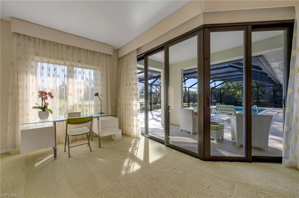 Located within the South Pennyroyal enclave of Pelican Landing, this thoughtfully appointed residence offers an effortless blend of generous living spaces and serene surroundings. A soaring ceiling height and a well-conceived layout create a bright, open feel throughout the home, while expansive sight lines reveal tranquil lake views, frequent visits from wading birds, and views across Hurricane #2 on the golf course—enjoyed from much of the interior. Guest accommodations are impressively scaled, offering comfort and privacy comparable to the primary suite. The owner’s retreat functions as a private sanctuary, featuring a spa-inspired bath with a soaking tub positioned to overlook a peaceful Zen garden. At the heart of the home, the kitchen balances breezy coastal character with elevated design, highlighted by distinctive cabinetry and a well-appointed appliance package suited for both everyday living and entertaining. The dining area comfortably hosts larger gatherings, while wide sliders extend the living space outdoors, creating a seamless transition to a screened lanai designed as a private, resort-style retreat with a pool, spillover spa, and generous lounging areas overlooking tranquil lake and golf course views. Substantial updates include a new range and microwave installed in December 2025, followed by a new water heater and pool heater added in Fall 2024. The home also features a freshly painted exterior and new lanai cage screening completed in 2023, along with a Miele dishwasher and LG French-door refrigerator installed in Fall 2021, providing modern convenience and added peace of mind. Residents of Pelican Landing enjoy an exceptional amenity package, including access to a private Gulf-front beach park, a 34-acre waterfront park, sailing and canoeing on Spring Creek, tennis and pickleball, a modern fitness center, and scenic walking and biking paths. Offering a rare combination of thoughtful updates, generous proportions, and access to Pelican Landing’s signature amenities, this South Pennyroyal residence presents an exceptional opportunity to enjoy refined Southwest Florida living in one of the area’s most desirable communities.
