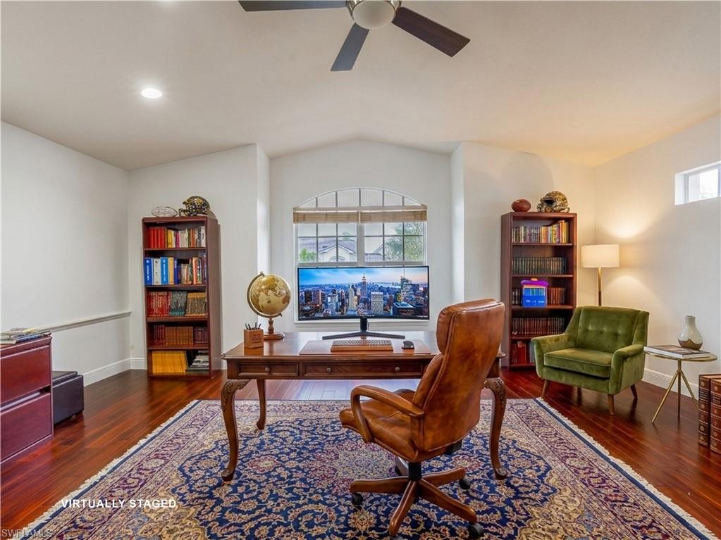 One or more photo(s) has been virtually staged, AI generated or rendered. Step into the resort lifestyle you've been dreaming of here at Clubside in the Strand. This beautifully maintained coach home comes with its own private elevator. 2136 sqft encompasses two bedrooms, two baths, a den, and a bonus room for you to make your own. The floorplan's open concept is highlighted by vaulted ceilings and dark wood floors. Freshly painted walls are illuminated by natural light. Embrace each morning with views over the lakes and golf course. Large windows in the breakfast area bring the outdoors in for a calm and natural feeling. Social memberships offer something for everyone! Residents can enjoy the luxurious Club at the Strand, which includes a state of the art fitness center, tennis, pickleball, bocce, croquet, basket, and more. The option Golf Membership grants access to the 27 hole course - perfect for players of all skill levels. Experience the best of resort style living in Naples!