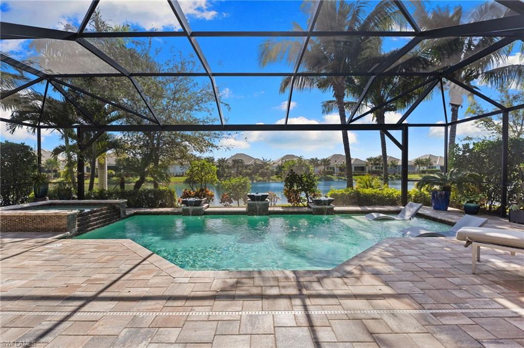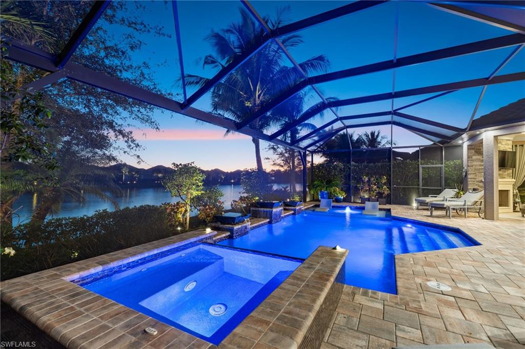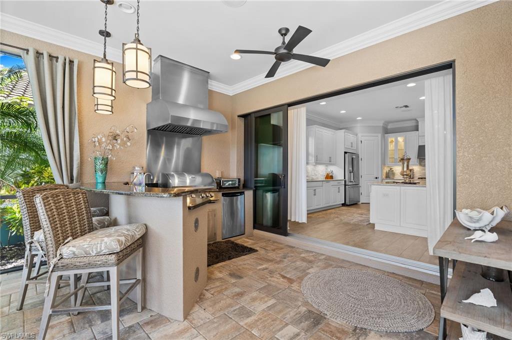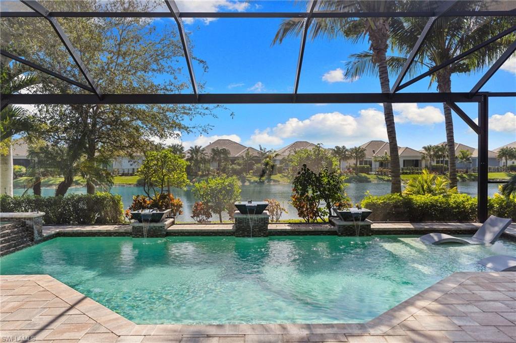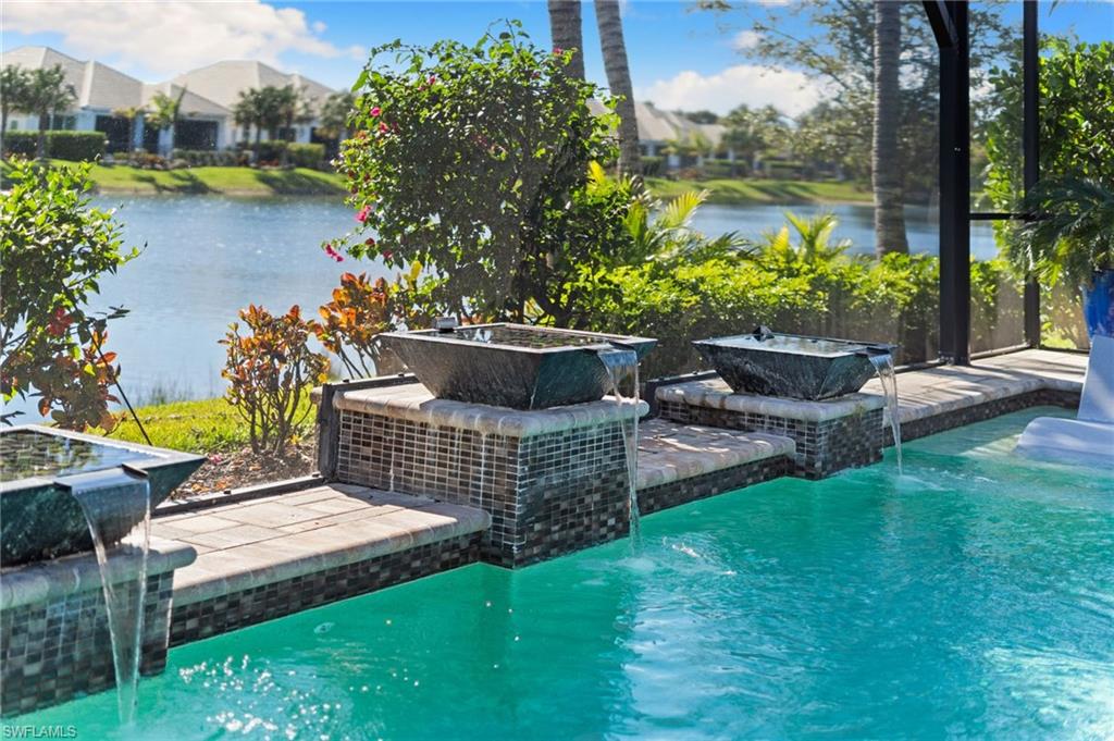 Experience a truly one-of-a-kind, turnkey artist-inspired residence in the prestigious enclave of Oyster Harbor at Fiddler’s Creek. Dramatic lighting has been thoughtfully designed to showcase art throughout the home, while custom accent walls, ceilings, and bathrooms elevate every space with creativity and sophistication. This stunning 3-bedroom plus den, 3-bath home offers rich architectural details including extensive custom woodworking, tray ceilings, plantation shutters, and layered accent lighting. The designer kitchen features custom white cabinetry with accent lighting, quartz countertops, premium appliances, and an icemaker—perfect for effortless entertaining. The adjacent dining area highlights a dramatic enclosed wine wall with a striking stone backdrop, while the living room impresses with a custom feature wall and expansive sliding doors that open seamlessly to the lanai. The private owner’s suite showcases a spectacular custom walk-in closet and spa-inspired bath. Outdoors, the resort-style lanai provides an extraordinary setting for relaxation and entertaining with a heated pool and spa, water kettles, a natural gas stone fireplace, outdoor kitchen with gas grill, panoramic screen enclosure, and beautifully upgraded landscape and pool lighting overlooking tranquil waterfront views. Significant enhancements include professionally designed landscaping and an extensive exterior lighting package that creates a stunning evening ambiance. Modern upgrades provide peace of mind with impact doors and windows, camera system, whole-home sound system, and water softener. Notable features include a fully air-conditioned two-car garage with custom cabinetry, a tile roof, and meticulous attention to detail throughout. Residents enjoy the world-class amenities of Fiddler’s Creek, including the 54,000-square-foot Club & Spa with two on-site restaurants, resort pools, fitness center, and tennis, pickleball, and bocce courts. Optional golf, beach, and boating memberships complete the luxury lifestyle. Ideally located just minutes from Marco Island’s beaches and only 15 minutes to downtown Naples and Fifth Avenue South.