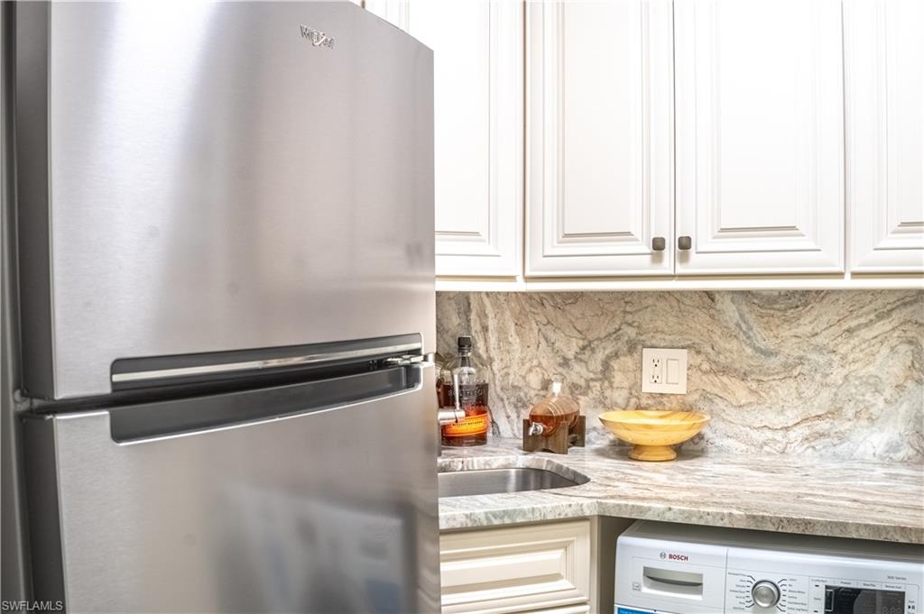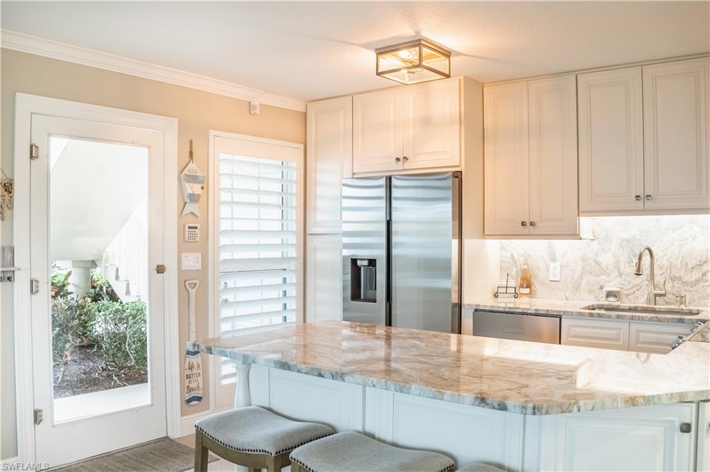 DON'T MISS THIS RARE OPPORTUNITY, Out of 100 total units in Ville De Marco, this is one of only 8 double units and the only double unit currently for sale that offers unprecedented wide-water views of the Marco River FROM EVERY ROOM! Fully remodeled from the most discriminating owners, every detail has been accounted for to allow maximum lighting, exceptional wide water views, thoughtful utilization of all available space, and top of the line upgrades. Remodel incorporates hurricane doors, windows and sliders; custom kitchen cabinets; upgraded appliances, including an induction stove and built-in air fryer; master bedroom features a walk-in closet; first bathroom features a jacuzzi tub; second bathroom has full rain head/body spray shower heads; full water filtration system; floor-to-ceiling pantry; plus plantation shutters and custom crown molding throughout. The unique layout includes a full laundry room with wet bar and a second full-size refrigerator and Bosch washer and dryer. The walk-out patio is spacious, inviting, and provides extraordinary wide water views of the Marco River. The community offers boat slips available for lease, a fishing pier, and a water-front clubhouse, all for your enjoyment. Unit location is on the quiet side of the complex, away from night-time restaurant music and noise, but still within walking distance to all restaurants in the area—AN IMPORTANT QUALITY OF LIFE POINT NOT TO BE OVERLOOKED! Experience the MILLION DOLLAR VIEW from a unit that has all the convenience of a condo but lives like a water-front home.