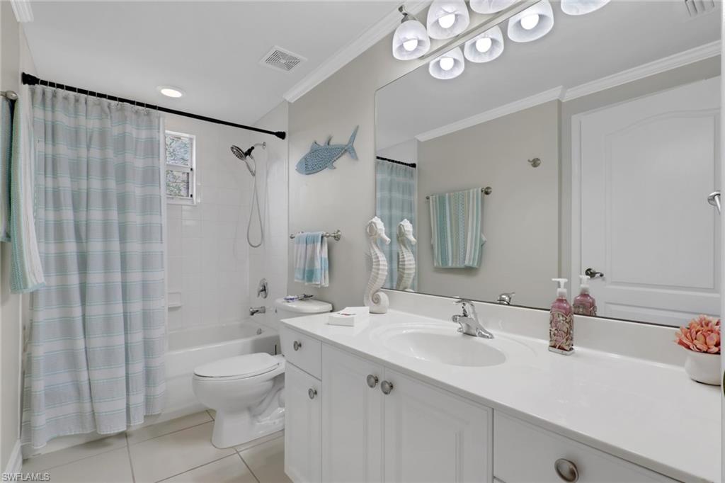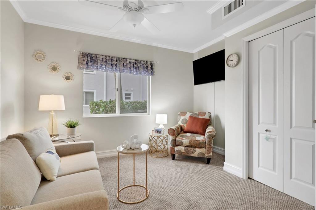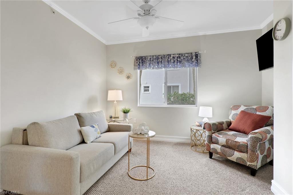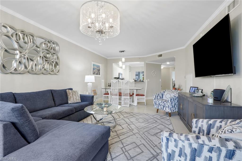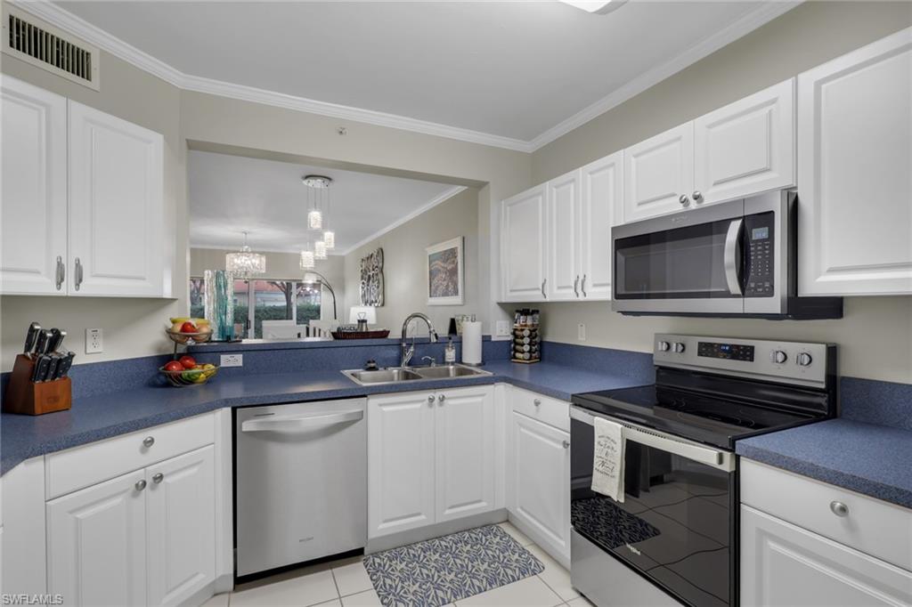 This impeccably maintained first-floor, 3-bedroom condo is being sold TURNKEY!! This open-concept condo has 1431 Sq. Ft. and feels spacious and airy from the moment you enter. There is a large kitchen with option for an eat-in breakfast area and a large pantry. The light-bright kitchen has ample counter/cupboard space with white cabinetry and stainless-steel appliances which are only 3 years old. The spacious primary bedroom has a double sink vanity, large walk-in-closet, and ensuite bath. There is a guest bedroom and guest bath as well as a third bedroom that could be utilized for an office or den. There is elegant crown molding throughout, and the entire condo has recently been painted. There is abundant light throughout this end-unit with the extra windows! Nestled in a quiet neighborhood, Blue Heron offers beautiful grounds, a sparkling community pool and clubhouse, as well as a plethora of social activities. The low condo fees in Blue Heron covers cable, water and so much more. The condo association painted the exterior of all buildings and replaced the roofs in 2023. Both annual and seasonal rentals are allowed, making this a great investment property. Blue Heron is conveniently located one mile from Berkshire Commons with dining, shopping, grocery stores and banking. It is a short drive to downtown Naples and the white sand beaches, fine dining, shopping and golf.