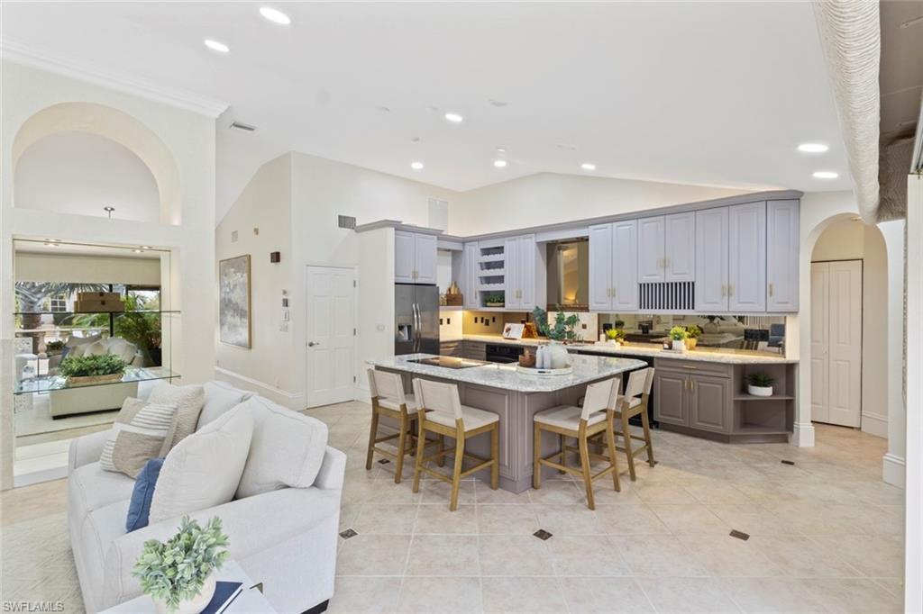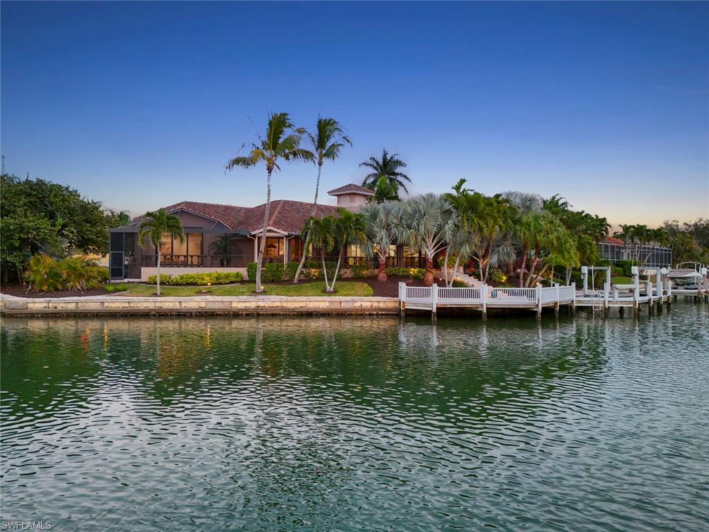 Set on a rare, oversized tip lot, this Marco Island residence offers long, sweeping bay and canal views with indirect Gulf access—and just one bridge between you and open water. With a southwest exposure, the home is perfectly positioned to catch the glow of afternoon light and enjoy unforgettable sunsets that unfold across the water. Offering nearly 3,500 square feet of living space, the home has been thoughtfully expanded over time, creating a distinctive footprint rarely found on Marco Island. The layout includes three bedrooms, a dedicated office or den, four full bathrooms, and a private sun room off the primary suite, allowing the home to live generously while maintaining separation and privacy. Walls of new impact glass sliders line the rear of the home, blurring the line between indoors and out while placing the view front and center throughout the main living areas. The updated kitchen opens seamlessly to the living and dining spaces, designed for both everyday living and effortless entertaining. The primary suite is an expansive retreat, featuring a private sun room and tranquil water views—an ideal setting for morning coffee or quiet evenings. Pocket doors throughout the home add architectural intention, while a custom front door sets a refined tone upon arrival. Outdoor living is exceptional. A vast covered and screened lanai wraps the rear of the home and is accessible from every waterfront-facing room, centered around a heated in-ground pool. Mature, intentionally planted trees along the water’s edge create a sense of remarkable privacy, allowing the setting to feel both open and secluded. A private dock provides easy access to Marco Island’s waterways and the Gulf beyond. Additional features include automatic shutters, new impact glass sliders, remote-controlled blinds in the primary suite, and no HOA restrictions—enhancing both comfort and freedom. Just two blocks from Tigertail Beach, the home offers the rare ability to enjoy both boating and one of Marco Island’s most beloved beaches within moments. A rare opportunity offering sweeping water views, near-Gulf boating access, and close proximity to Tigertail Beach.