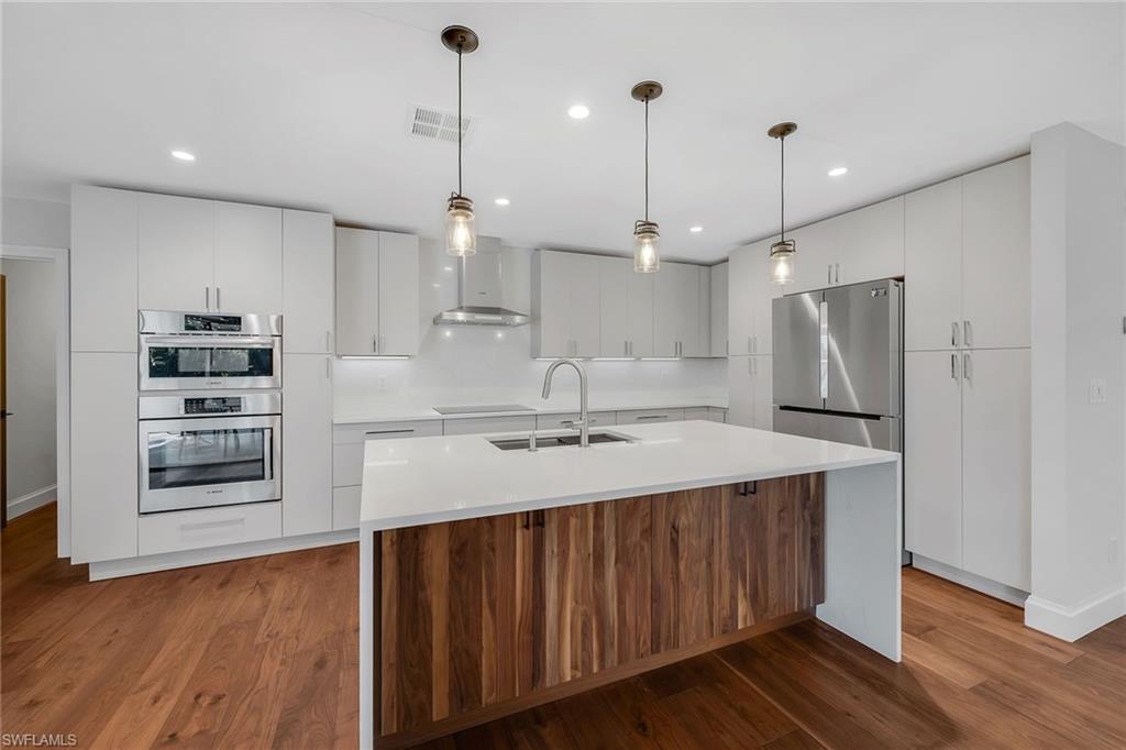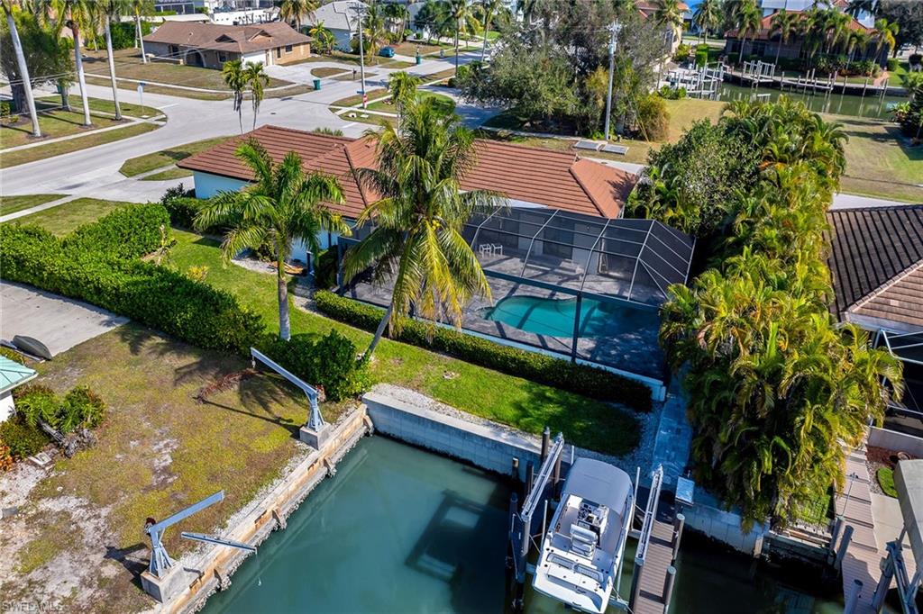 Beautifully transformed and thoughtfully redesigned, this exceptional waterfront residence offers walnut wood flooring throughout, impact-resistant windows and doors, a newer seawall and dock, direct Gulf access, and long, sweeping canal views from its desired southern exposure. Set on a prime waterfront homesite, the property captures abundant natural light and tranquil water vistas, creating a refined yet relaxed coastal atmosphere ideal for Marco Island living. This home features three bedrooms, three baths and a two-car garage, with volume ceilings and recessed lighting enhancing the open, airy interior. Walnut wood floors flow throughout the living spaces and bedrooms, complementing the home’s clean lines and timeless design. The living room opens seamlessly to the screened lanai, framing long water views and reinforcing an effortless indoor-outdoor lifestyle. The kitchen is well-appointed with stainless steel Bosch appliances, including a dishwasher, range, microwave and French-door refrigerator with icemaker, along with a breakfast area that offers direct access to the lanai, ideal for casual dining with a waterfront backdrop. The primary suite is a spacious retreat with lanai access, a walk-in closet featuring custom wood shelving, and a beautifully finished en-suite bath with dual sink vanity and full-width mirrors, a walk-in shower and built-in cabinetry. A generous guest suite includes a walk-in closet and private en-suite bath with a tub-shower combination, while the third bedroom offers its own walk-in closet and ceiling fan, ideal for guests or flexible use. Outdoor living is highlighted by a panorama screened lanai with tile flooring, ceiling fan and convenient pool bath, providing an inviting space for relaxing or entertaining. The well-equipped laundry room includes front-load washer and dryer with overhead and built-in storage cabinetry for added convenience. Recent appliance updates include a Bosch electric oven and hood and Bosch French-door refrigerator in 2021, along with a Bosch dishwasher in 2022. Positioned on the water, this residence combines modern upgrades, classic architectural appeal and enhanced boating infrastructure, offering a rare opportunity to enjoy refined waterfront living with timeless style.