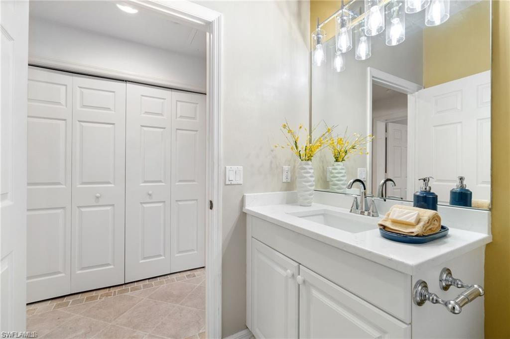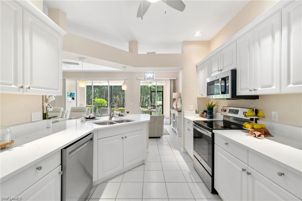 GOLF MEMBERSHIP INCLUDED ($50,000 VALUE)! Hunters Ridge is a private golf and country club, not a bundled community only 420 golf members. No Chelsea system and our golf member enthusiast can play the course as often as they like! Updated first floor coach home offering 2 bedrooms plus a flexible den area suitable for an office or similar use. Approximately $42,000 in recent improvements include new kitchen with stainless appliances (2023), white quartz countertops in the kitchen and bathrooms, new bath tile, updated furnishings, and a Tempur-Pedic mattress in the primary bedroom (2024). Electric hurricane shutters on the lanai provide added protection, security and convenience. The private lanai overlooks the lake and golf course, offering a quiet and relaxing outdoor setting. Large one car garage with ample space for your car, golf cart and extra storage. Located on a quiet cul-de-sac in the highly desirable Grand Pines neighborhood, with its own private pool overlooking the 18th fairway, this property is a rare opportunity for luxury living in a peaceful and sought-after community. Hunters Ridge has a welcoming and relaxed atmosphere with a wide range of social activities. Located just 6 miles from Barefoot Beach Preserve, it offers easy access to premier shopping, dining, entertainment, and RSW Airport. Within the community, residents enjoy an 18-hole championship golf course, state-of-the-art golf simulators, a spacious resort style pool with food and beverage service, tennis courts, pickleball courts, and much more. The clubhouse features both elegant dining and a casual grill room. Adding to the lifestyle appeal, a major renovation is currently underway. The Activity and Fitness Center is being transformed into a modern, updated Community Center with expanded fitness and wellness amenities an exciting enhancement that will elevate daily living, increase home values, and truly bring resort style wellness to your doorstep.