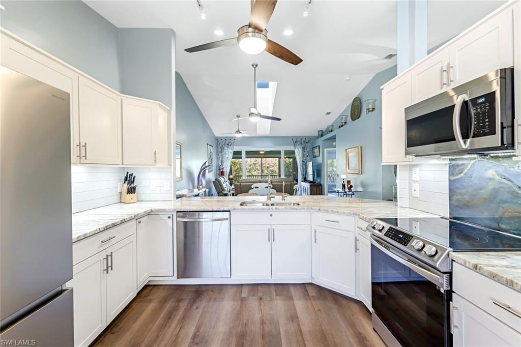 Nestled in the desirable gated community of Retreat west of 41, this exquisite lakefront property offers unparalleled living with enhanced security and proximity to Delnor Wiggins State Park as well as Vanderbilt Beach. Showcasing spectacular views of the pristine lake and surrounding preserve area, the property invites you to enjoy the local wildlife and a scenic walking path just outside your door. The completely renovated kitchen is a chef's dream, featuring custom backsplashes, granite countertops, stainless steel appliances, and convenient pull-out shelves in all lower cabinets. Enjoy new LVP flooring throughout the home and the added convenience of an EV plug in the garage. The updated unit includes a newly installed AC and an inviting all-seasons room for year round use and enjoyment, ensuring comfort and style in every space. Enjoy natural light pouring in from the sky light as well as vaulted ceilings. Updated master and guest bathrooms, spacious bedrooms as well as ample storage can all be found in this well appointed unit offered with furnishings being negotiable. The community offers lush landscaping, a heated pool, tennis courts and miles of walking/biking paths. Located just minutes from the beach, dining, and shopping, this property embodies both tranquility and convenience, perfectly situated west of 41 and designed for an exceptional lifestyle. Sold with a 1 year home warranty for the new buyer at closing.