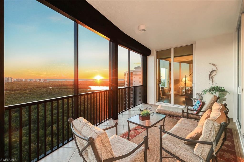 Experience luxury living in the heart of Naples with this stunning waterfront property that offers breathtaking 17th-floor views of Turkey Bay and the Gulf, where you can watch birds meander through the sky over the preserve, dolphins play in the bay and see endless sunsets over the gulf. The residence boasts a seamless blend of elegance and functionality, featuring a private elevator entry, updated flooring throughout, custom window treatments, and exquisite custom paint applications. The spacious kitchen is a chef's delight, equipped with stainless steel appliances, granite countertops, and rich wood cabinetry. The master bath is a sanctuary, featuring new tile, a frameless shower, rich wood cabinetry, dual sinks, and a luxurious jetted tub. This unit is unique to others offering extended ceiling height, wrap around lanai views, an oversized two-car private garage with a spacious storage room located directly behind it, perfect for a workbench or housing water toys. Residents enjoy exclusive access to the Private Amenity Center for Nevis and Montego Towers, offering a resort-style pool with spa, a fitness room, an entertainment room, and a cabana with a fireplace, along with two guest suites for overflow visitors and on-site management. Located just miles from the pristine white sand beaches of Delnor-Wiggins and Vanderbilt, and minutes from Mercado's upscale shopping and dining, this property combines luxury, convenience, views and unparalleled comfort. offered furnished and sold with a 1 year home warranty to the new buyer at closing. Tarpon Cove Yacht & Tennis Club is optional. This offers a resort style pool with tiki bar, dining options, tennis, fitness center, pro shop and beach shuttle service by boat. Inquire with list agent for more details.