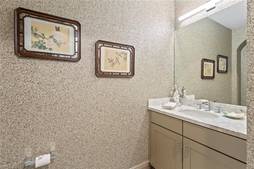This penthouse style condo brings together a relaxed, sophisticated style with high end comfort. With top tier upgrades including designer wallpaper, fresh paint, and new light fixtures, the home feels exactly like an Architectural Digest model. The gourmet kitchen is built for entertaining and features quartz counters, a gas cooktop, and a custom bar with a wine and beverage center. All three bedrooms include their own private baths and walk-in closets with custom built-ins. Modern touches like battery powered motorized shades and contemporary French doors finish the space beautifully. The zero corner impact sliders slide completely open to a large lanai with great views of the 8th and 17th greens on the Tiburon Gold course. This is the only building in Esperanza where you get both southern sun all day and western sunset views in the evening. Unlike any other unit, this home is tucked into a screen of tropical palms, creating a secluded oasis that maximizes your sense of privacy. Located on a quiet cul-de-sac it offers a level of peace you usually only find in a house. It also comes with two assigned garage spots and a storage unit in the building. All within the world-class Ritz-Carlton Golf Resort community.