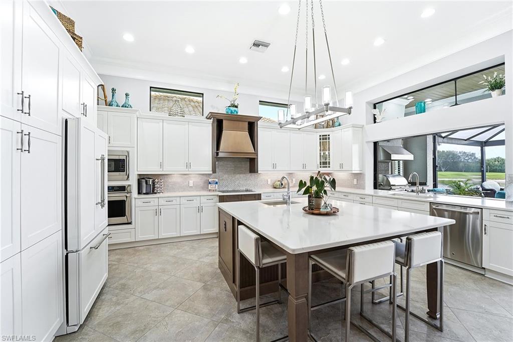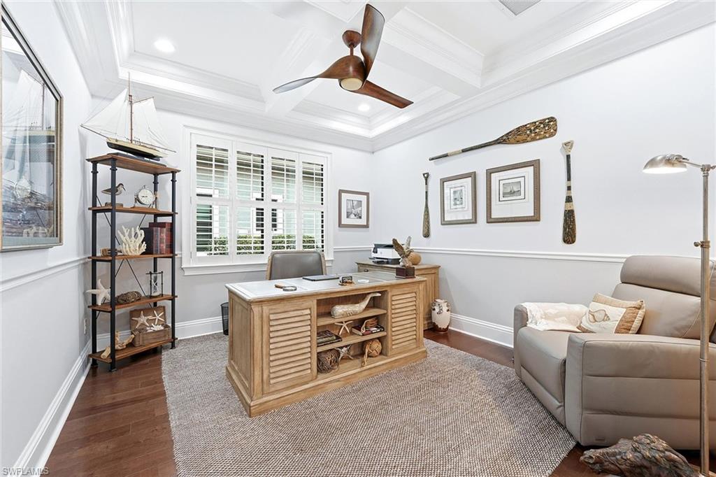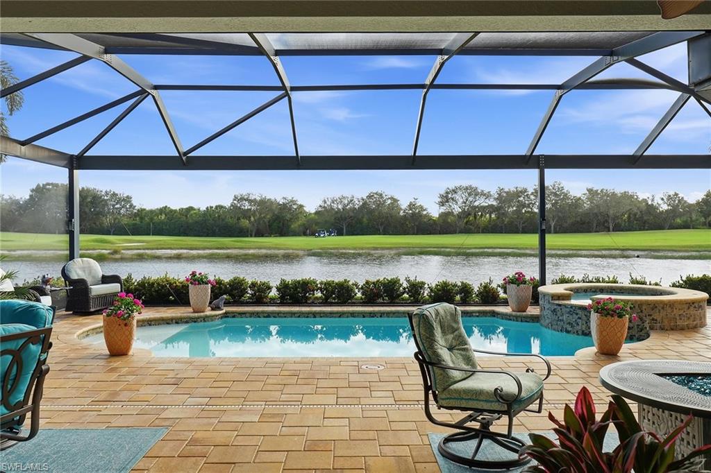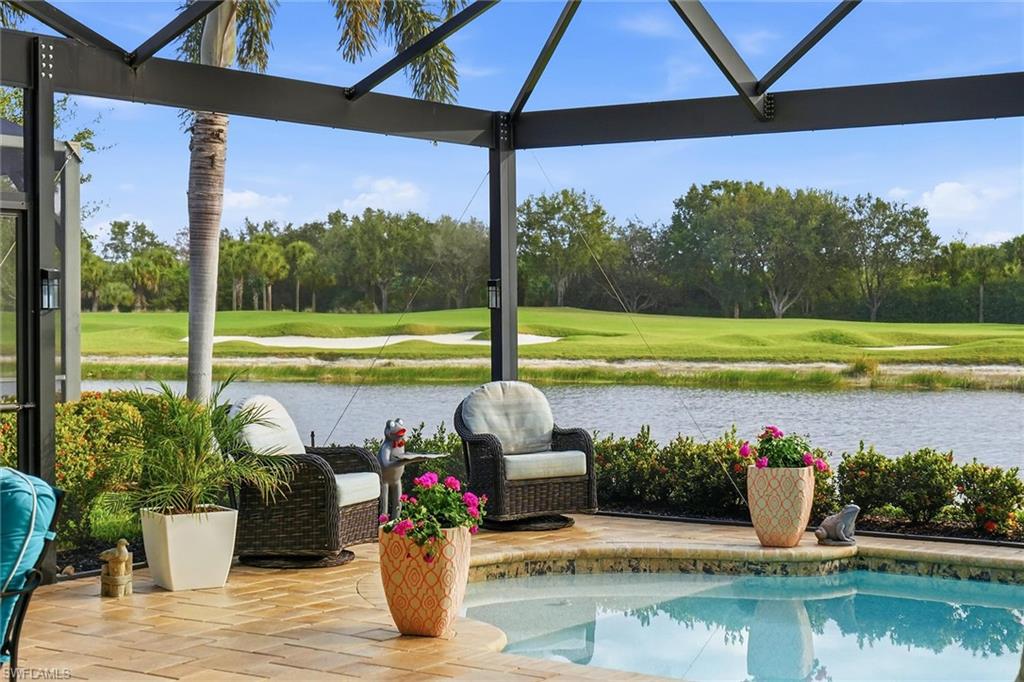 Impeccably maintained and move-in ready, this exceptional residence in the prestigious TwinEagles community includes immediate deeded golf membership and showcases one of the desirable wide lake and golf course views in the neighborhood. Offering two bedrooms plus a den and 2.5 baths across 2,642 square feet, the flexible floor plan allows for easy conversion of the den into a third bedroom. In addition, the fully air-conditioned attached third-car garage presents a unique opportunity to create a bonus room, office or guest suite if desired. The home is filled with natural light and refined craftsmanship, featuring custom cabinetry, decorative and tray ceilings, crown molding, detailed millwork and custom door casings throughout. Every detail reflects quality construction and thoughtful design. The outdoor living space is exceptional, featuring a beautiful pool and expansive screened lanai with a built-in outdoor kitchen. Wide, uninterrupted lake and golf course views create a stunning backdrop for entertaining or relaxing in a peaceful, resort-style setting. Thoughtfully updated and meticulously cared for, this bright and welcoming home is impeccable in condition and ready for immediate enjoyment. TwinEagles offers world-class amenities including two championship golf courses, clubhouse dining, resort-style pool, fitness center, tennis, pickleball, bocce and an active social calendar, all within a beautifully landscaped, gated Naples community.