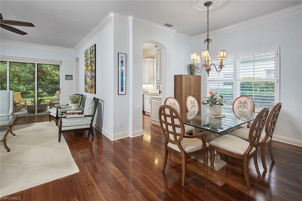 This charming Catalina model garden home with three bedrooms, two full baths and two-car attached garage, is in quiet Vistana Villas, a private enclave of just 64 homes in The Vineyards. Comfortable, flexible floor plan with large open great room area, split bedrooms and French doors to a den with a closet. The galley kitchen with light cabinets, backsplash and stainless steel appliances has a cozy breakfast nook. Beautiful Brazilian hardwood flooring in main living areas, plantation shutters throughout, crown molding, remodeled bathrooms and newer lighting. Primary bedroom suite is spacious with large windows and lanai access, double dual closets, separate granite counters and sinks, seamless shower and corner soaking tub. Guest bedroom has direct guest bath access with marble counter, upgraded cabinet and seamless shower. The primary suite, breakfast nook and wide lanai have secluded, mature tropical preserve views. Separate formal dining with large open great room. Electric vehicle charging in garage. The Vineyards offers optional golf and social memberships, not mandatory, offering exceptional amenities including two 18-hole golf courses, multiple dining options, pools, tennis, pickleball courts and wellness center with spa. The north Vineyards location is convenient to the white sandy beaches, many medical facilities and shopping at Mercato, Waterside Shops and 5th Avenue!