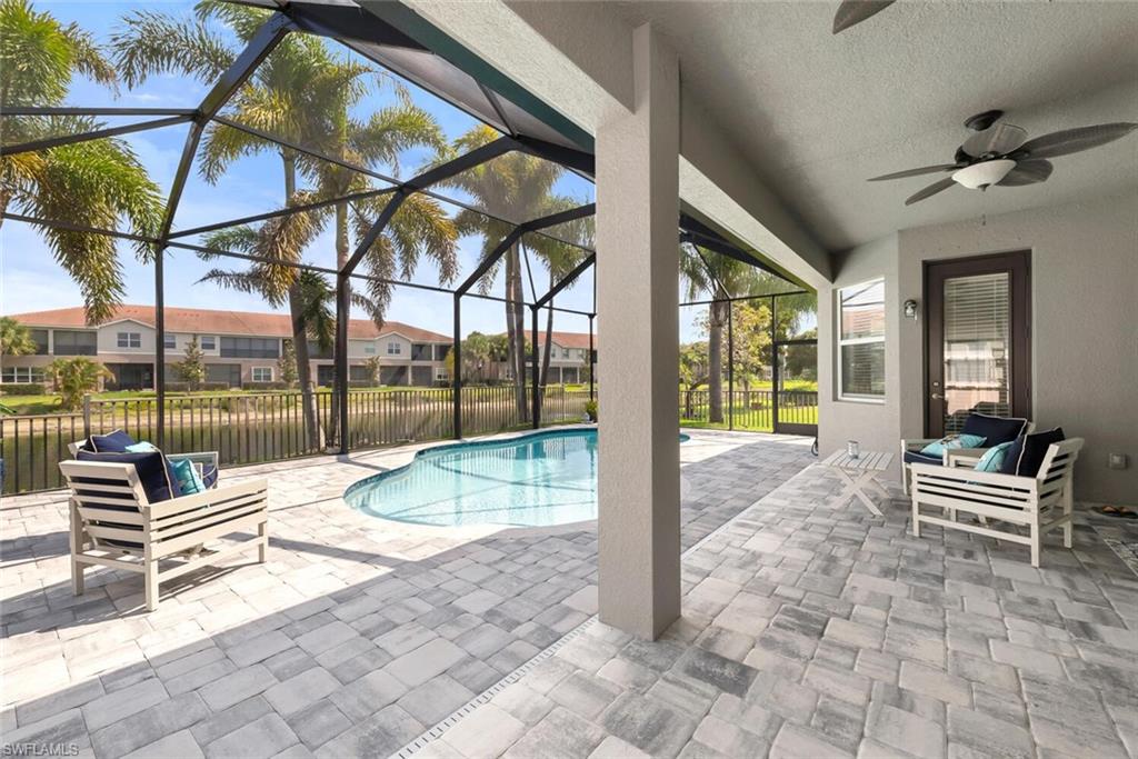Stunning lakefront pool home in Marbella Lakes featuring over $250,000 in designer upgrades, expansive living spaces, and one of the most desirable views in the community. This beautifully renovated 4-bedroom + loft/den, 4-bathroom residence offers refined luxury, exceptional comfort, and a flexible floor plan designed for modern family living in the heart of Naples. From the moment you enter, the home immediately impresses with soaring 14-foot tray ceilings, elegant crown molding throughout, and wide-plank luxury vinyl flooring that adds warmth and sophistication to the bright open spaces. Expansive windows and sliding glass doors invite natural light into every room while framing tranquil lake views that create a peaceful, resort-like atmosphere. At the center of the home is a beautifully redesigned chef’s kitchen, thoughtfully crafted for both entertaining and everyday living. Featuring white shaker solid-wood cabinetry, Level 5 quartz countertops, premium Monogram appliances, a walk-in pantry, and an impressive 8-foot island, this space naturally becomes the gathering place for family and friends. The primary suite offers a private retreat overlooking the lake, complete with a coffered ceiling, direct access to the pool area, and a luxurious spa-inspired bathroom featuring dual quartz vanities, a soaking tub, and a glass barn-door walk-in shower. Generously sized guest bedrooms provide exceptional comfort and flexibility for family and visitors. The upstairs loft/den creates additional versatile space and can easily be converted into a 5th bedroom, office, media room, or guest suite, making the home adaptable to a variety of lifestyles. Home Highlights • Newly updated baths and modern kitchen with premium finishes • Oversized bedrooms offering exceptional space and natural light • Upstairs loft easily convertible into a 5th bedroom, office, or guest suite • Open and inviting living areas perfect for entertaining • Bright, airy interiors with peaceful lake views throughout • Screened lanai overlooking the water • Newly resurfaced heated saltwater pool with expansive paver deck Step outside to experience true Florida indoor-outdoor living. The spacious screened lanai features a resurfaced heated saltwater pool surrounded by an expansive paver deck, all overlooking a wide, tranquil lake view. Whether enjoying quiet mornings, hosting sunset gatherings, or relaxing poolside, this outdoor space offers the perfect private retreat. Additional premium upgrades include a whole-home water filtration system and a garage finished with high-end SwissTrax flooring, reflecting the meticulous attention to detail throughout the property. Come experience lakefront luxury, effortless comfort, and the Naples lifestyle at its finest.