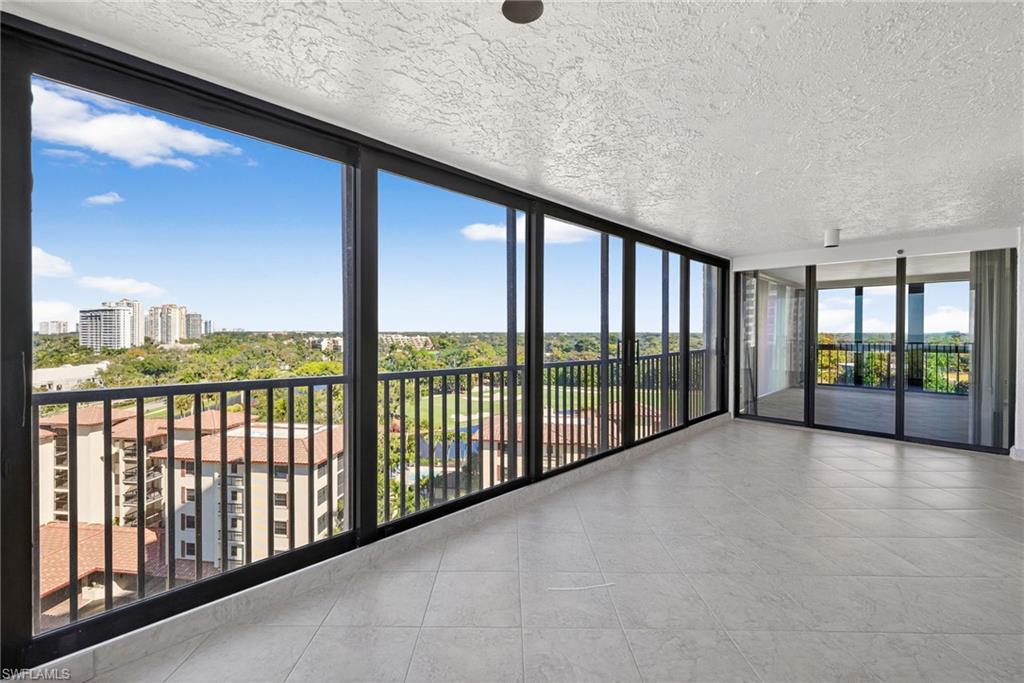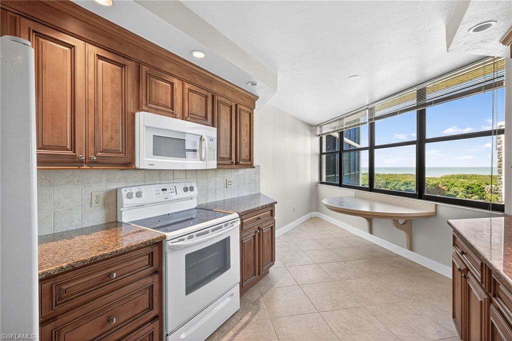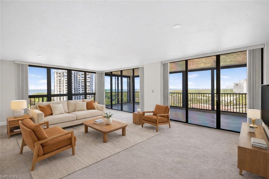 Welcome to this highly coveted corner end unit on the 8th floor, offering breathtaking 270-degree wrap-around views of Clam Pass, the beach, the gulf, stunning sunsets, as well as a lake and golf course. Nestled within the prestigious Chateaumere community in Pelican Bay, this exquisitely furnished condo embodies paradise in the sky. With two bedrooms and two bathrooms, the open-concept layout invites a seamless flow from one room to the next, enhancing comfort and ease. The living area is bathed in natural light thanks to large impact-resistant windows and sliding glass doors, showcasing extraordinary panoramic vistas. The eat-in kitchen offers full views of the gulf and beach, perfect for dining with a view. The spacious Master Suite is a tranquil retreat, boasting views of the gulf, golf course, and lake, and is complemented by an en-suite bathroom with a double vanity and a walk-in shower. The guest bedroom presents stunning views of the golf course and lake, coupled with the beauty of vibrant, colorful sunrises. Chateaumere Royale offers residents access to exceptional amenities, including three swimming pools, a fitness center, two guest suites, bike storage, and a community room with a full kitchen. As part of Pelican Bay, residents enjoy tram services to two private beach clubs complete with chairs and kayaks, two exclusive restaurants open for lunch and dinner, 18 tennis courts, another fitness center, and even yoga sessions on the beach. Situated on nearly ten acres, Chateaumere is conveniently located less than two miles from the Artis Fine Arts Theatre and the Waterside Shops, featuring fine dining and shopping options. It is also centrally located near Mercato, Whole Foods, Fresh Market, and more, with easy access to downtown Naples, known for its superb dining, shopping, and beaches.