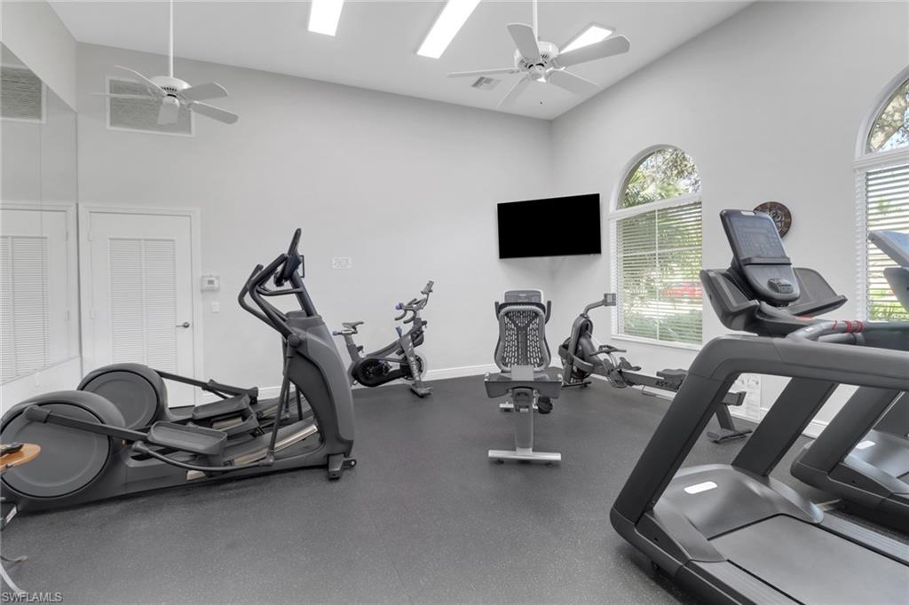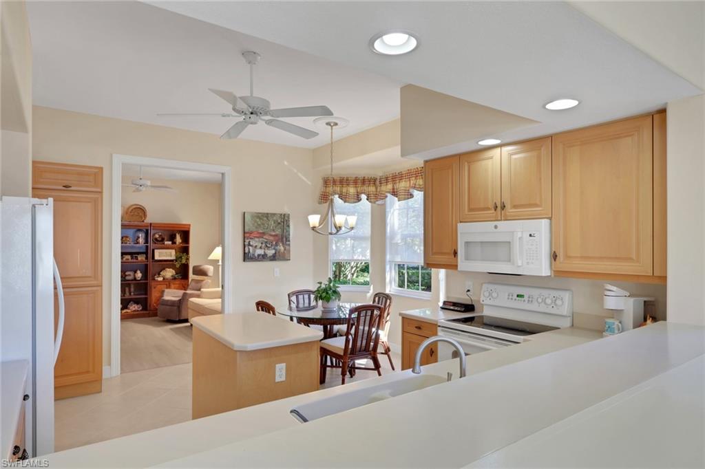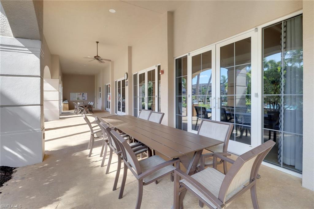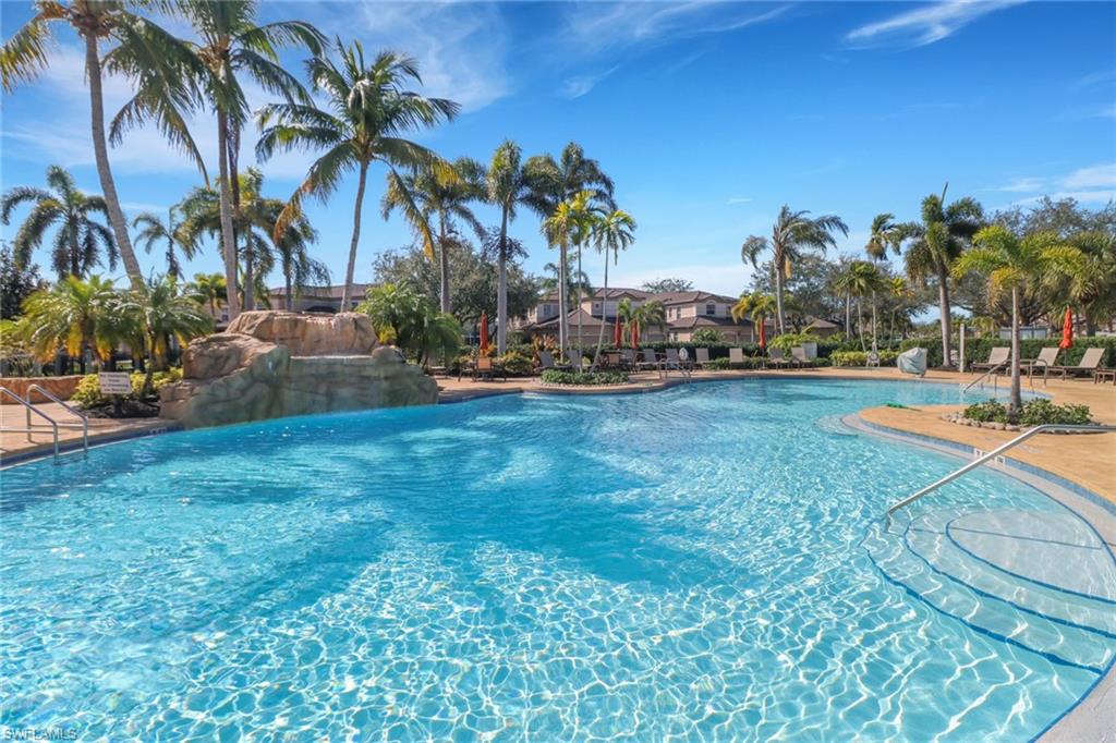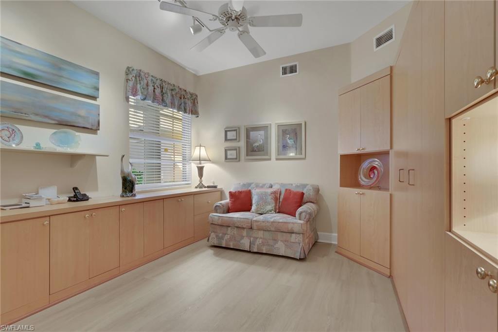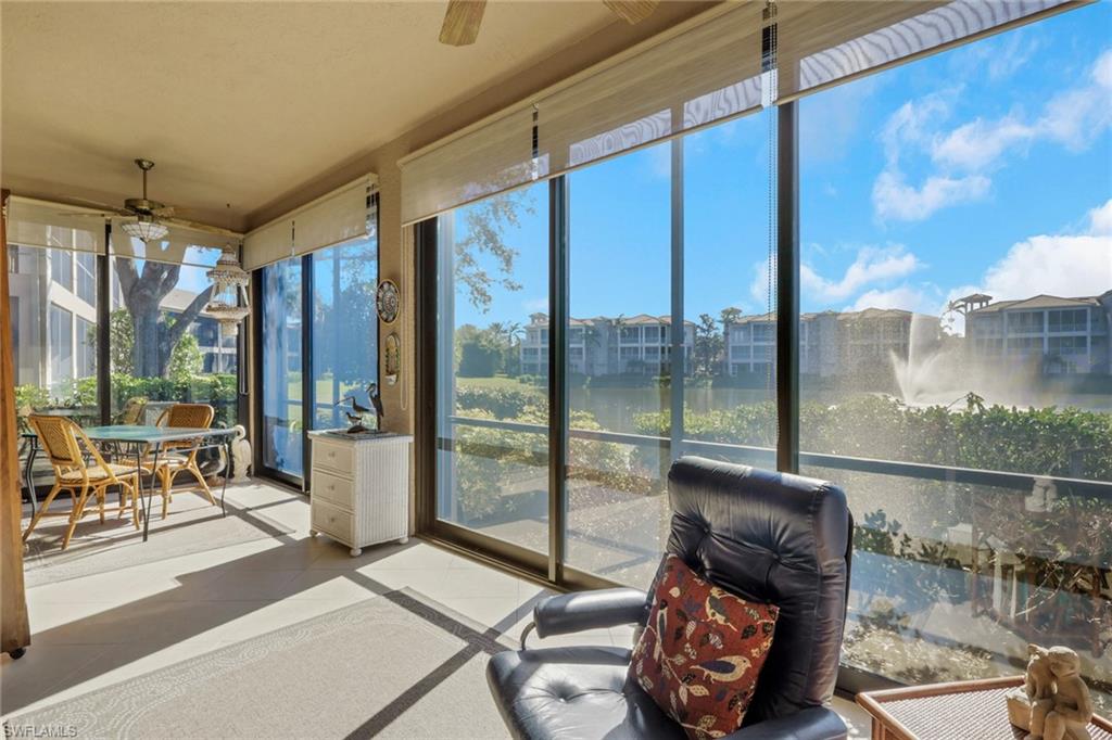 A gorgeous lake and fountain view can be enjoyed from your expansive, all-weather lanai in this ground floor end unit. The lanai is south facing and enclosed with storm glass sliders and tile floor, creating an outdoor living/dining space that is usable rain or shine. The split floor plan features two bedrooms plus den/two full bathrooms. The guest bedroom has custom built-in storage, Murphy bed, and luxury vinyl flooring-heightening best use of the space. This one owner unit has been meticulously maintained and features newer A/C (2021) and New Hot Water Heater (2026). An active lifestyle is fully complemented by the community’s newly re-modeled resort-style community clubhouse with fitness center, library, full kitchen, and pool area featuring three rock waterfalls and three gas grills! Regency Reserve in Vineyards - where luxury living meets every-day comfort!
