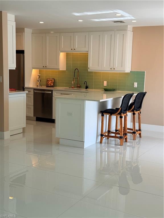 A hidden gem with waterfront dock just over a mile from 5th Ave.This totally renovated 4 unit, 1 story condo corner unit lives as as a private home.Walk into an open foyer that could be a breakfast area. The white tiles throughout is absolutely stunning.The new Kitchen is open with new LG Appliances, a pot filler over stove and gold accents on white cabinets and beautiful backsplash.The New open floor plan is wonderful for dining and living areas to relax or entertain. Walk onto private lanai which is total screened, an extension of your home it can be used for barbecuing, or entertaining. Enjoy a morning coffee, sip a glass of wine, enjoy a meal or sun bathe in the Florida sun. The new impact windows stream sun into the two bedrooms 2baths to complete your home which is ready for you to decorate and make your own. There is a boat dock with access to the gulf. It has an electro boat lift running water and a fish cleaning station for your convince. Walk to Naples Bay Resort , Tin City, and Fifth Ave with world class shopping and dining with over 25 restaurants. The beach is a stroll down 5th Ave with its famous sugar sand and tranquil waters. Explore all that Naples has of offer to your wonderful place to call home.