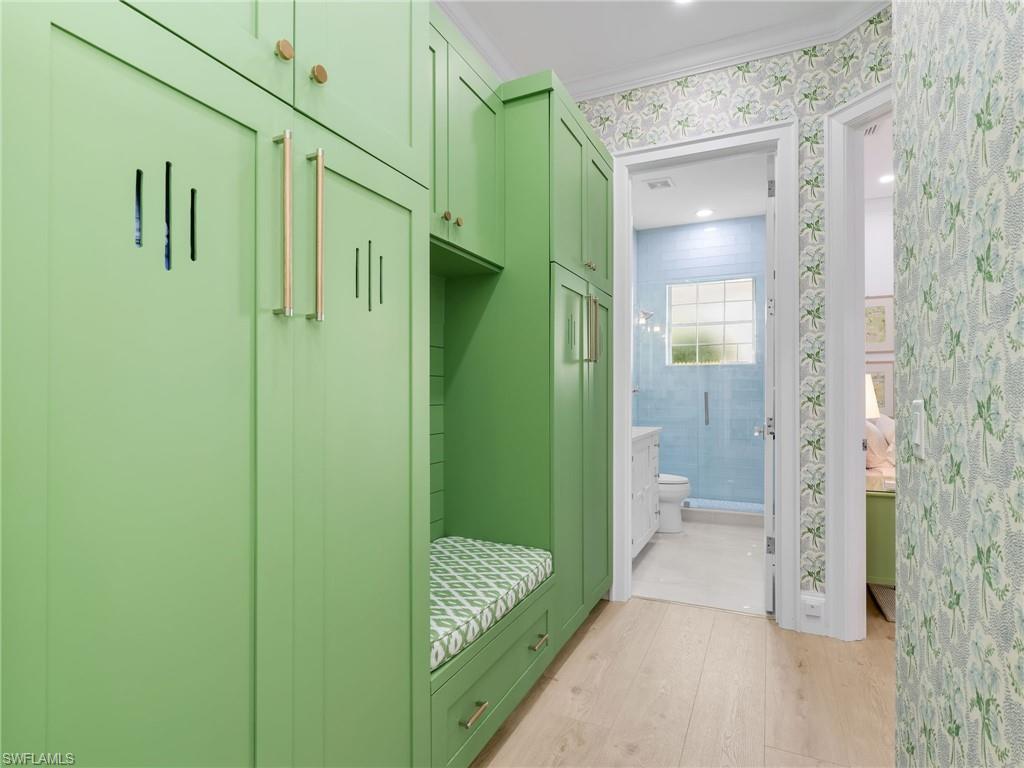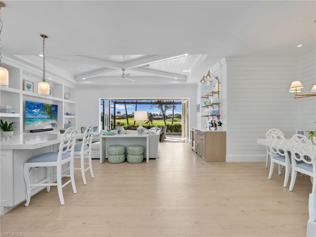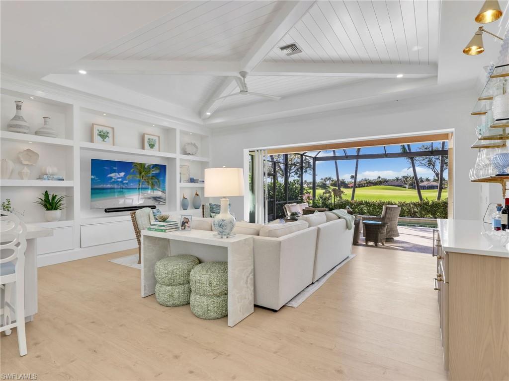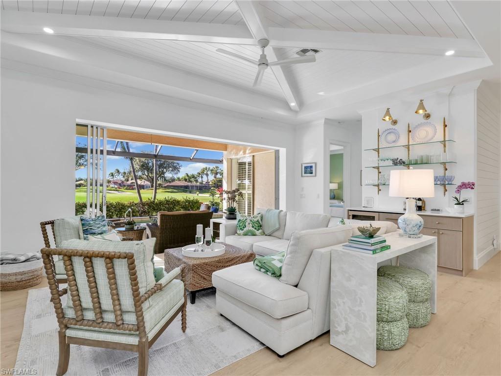 Fully renovated Interior and thoughtfully reimagined, this coastal contemporary, Western Exposure residence with Spectacular Sunsets evokes a luxurious beach house retreat—sun-drenched, serene, and impeccably curated. Sand-colored wood flooring flows throughout, creating a warm, inviting foundation, while architectural “fifth wall” details—coffered ceilings, shiplap accents, tongue-and-groove finishes—and layered textures add depth and visual interest at every turn. Pocketing sliders dissolve the boundary between indoors and out, filling the home with natural light and framing sweeping golf course views. Designer lighting throughout further enhances each space, highlighting the home’s refined finishes. The kitchen is both striking and functional, showcasing two refrigerator drawers, custom ceiling-height cabinetry, stylish backsplash that extends seamlessly up the wall, and finishes that feel elevated yet welcoming. Every room shines as its own piece of living art, thoughtfully designed with a surfside-inspired motif and cohesive coastal color palette. A custom built-in mudroom blends beauty with everyday practicality, while the den offers added flexibility with a Queen Murphy bed—ideal for guests or multi-use living. The primary suite is a tranquil retreat, accented by a grass-cloth feature wall and complemented by an elegant ensuite bath. Outdoor living is a true highlight, featuring a lagoon-style pool that creates a resort-like atmosphere and a picture-frame screen enclosure preserving uninterrupted views of the greens. With custom cabinetry, designer finishes throughout, and a floor plan completely reimagined for modern living, this remarkable residence embodies quiet luxury—timeless, welcoming, and straight out of the pages of a design magazine.