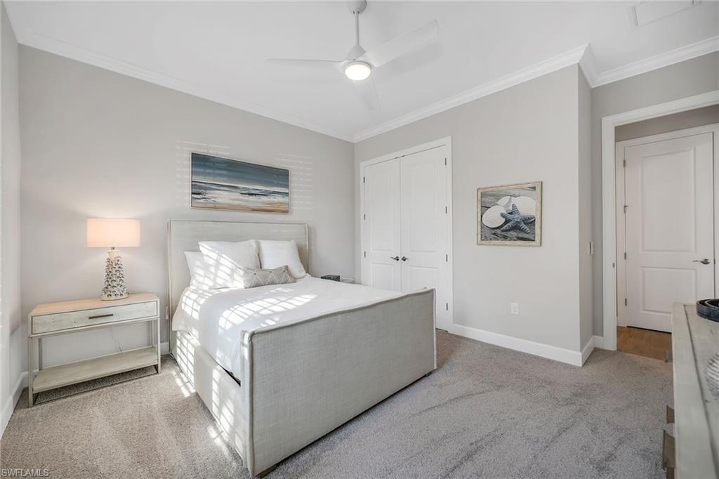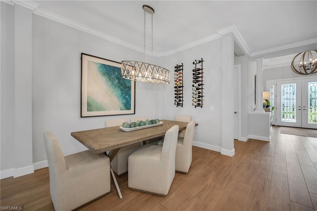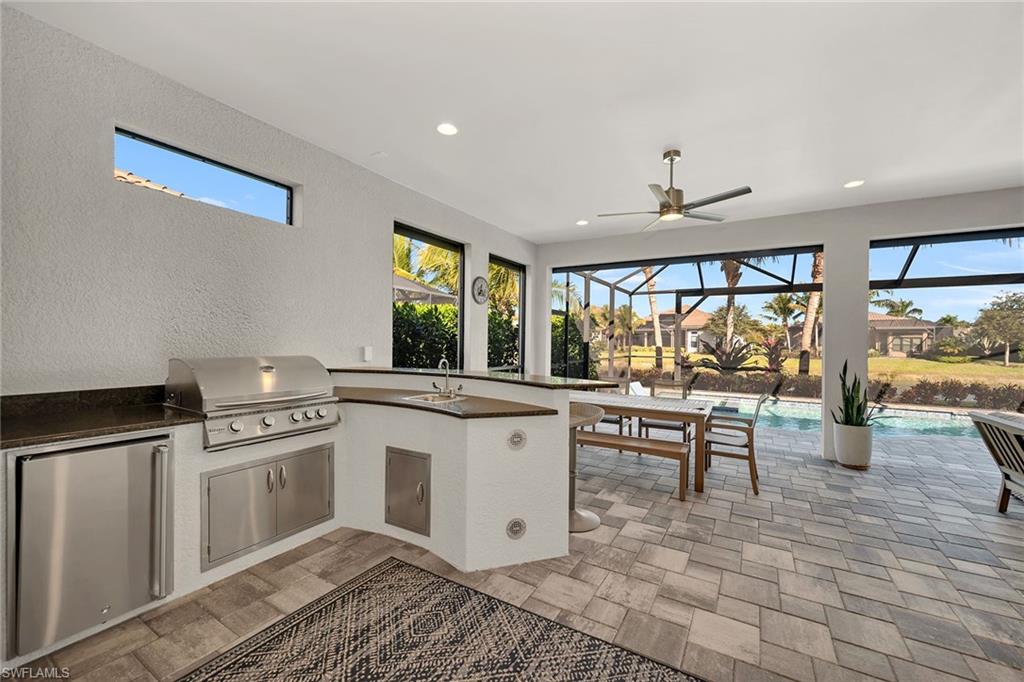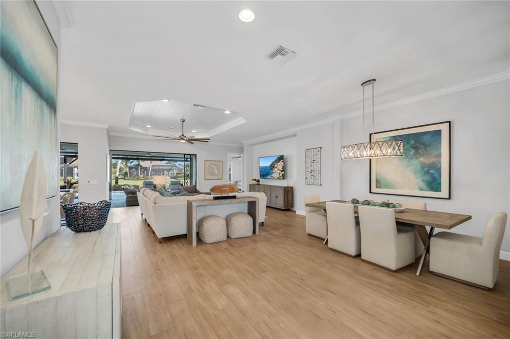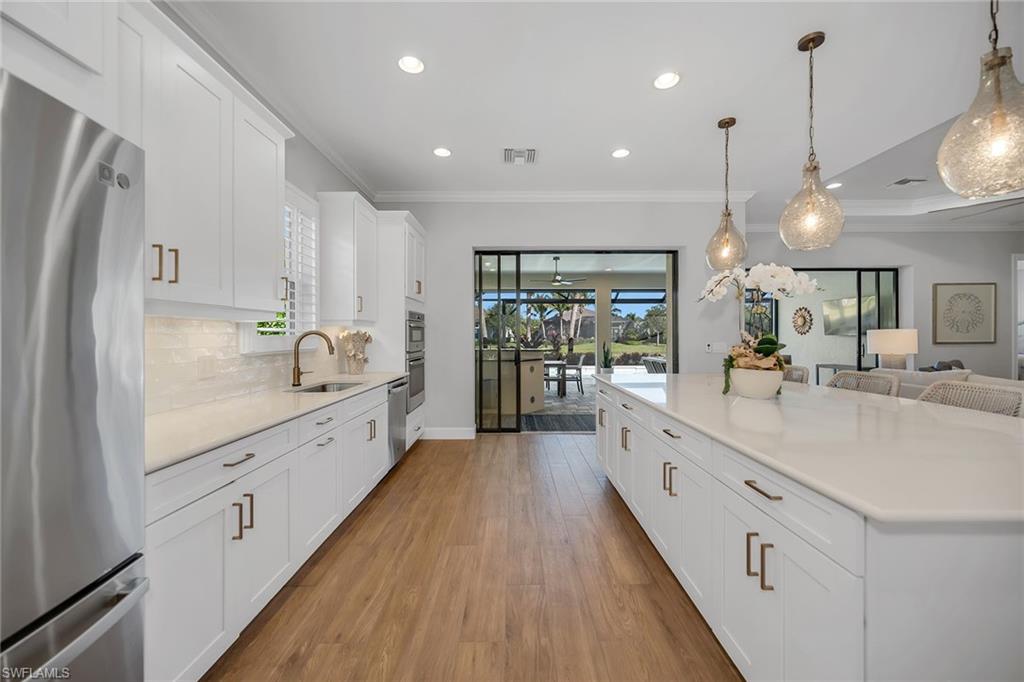 Enjoy refined living in this beautifully furnished, extensively upgraded residence, where tranquil water views, custom lighting, and designer details create a light-filled retreat with seamless indoor-outdoor living. The thoughtfully designed floor plan offers three bedrooms plus a den, three full baths, and a two-car garage. Wood-look porcelain tile flows throughout the main living areas, complemented by crown molding, recessed lighting, and custom architectural accents. Large windows and glass sliders invite abundant natural light, enhancing the home’s bright, airy ambiance. The welcoming foyer features double French doors with decorative glass, sidelights, and a tray ceiling. The open kitchen is stylish and functional, showcasing white cabinetry with under-cabinet lighting, quartz countertops, a tile backsplash and a walk-in pantry. Stainless steel appliances include a gas cooktop with hood, wall oven, microwave, dishwasher and refrigerator with icemaker. A spacious island with bar seating and pendant lighting anchors the kitchen, with easy lanai access and seamless flow to adjacent dining area. The living room is a centerpiece, highlighted by a tray ceiling with shiplap detail, a shiplap accent wall, modern ceiling fan and custom lighting. Expansive glass sliders open to the lanai, seamlessly blending indoor comfort with outdoor enjoyment. The covered outdoor living area features recessed lighting, dual ceiling fans and a panoramic screen enclosure overlooking the lake, along with a fully equipped outdoor kitchen with built-in barbecue grill, sink and mini refrigerator, ideal for effortless entertaining and alfresco dining. A heated pool and spa with sun shelf and loungers complete this private resort-style retreat, complemented by storm shutters for added peace of mind. The owner’s suite is a serene sanctuary with lake views, white plantation shutters and double-door entry to a spa-inspired bath. The en-suite bath offers a dual-sink vanity with makeup counter, quartz surfaces, full-width mirrors and a walk-in shower with multiple shower heads, floor-to-ceiling tile and privacy windows. A large walk-in closet with custom California Closets-style built-ins completes the retreat. Two guest bedrooms also feature plantation shutters; one enjoys an en-suite bath with a glass-enclosed walk-in shower, while the other is adjacent to a bath with a shower-tub combination accessible from the hallway. A versatile den with a shiplap accent wall serves beautifully as an office or study. The custom laundry room includes built-in cabinetry, quartz counter space, a utility sink, and GE washer and dryer. The garage is enhanced with added insulation and air conditioning for added comfort and functionality. Residents enjoy an award-winning, gated community with a refreshed resort-style pool, updated Gator Grille and 10 new pickleball courts. Optional memberships, with no golf waitlist, provide access to golf, the marina and a private beach club.