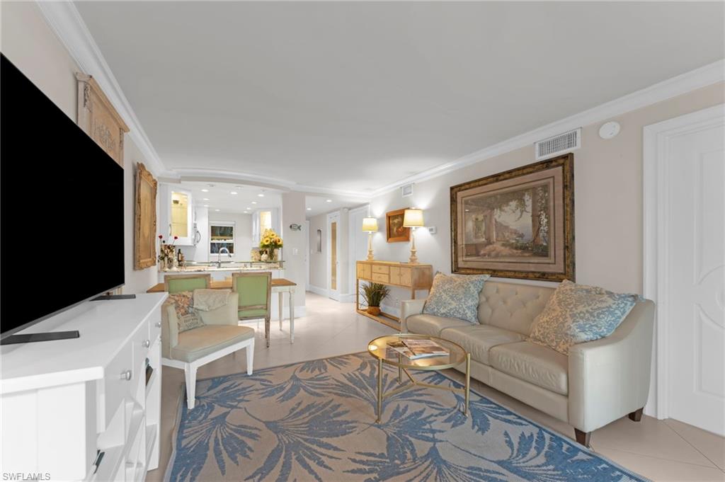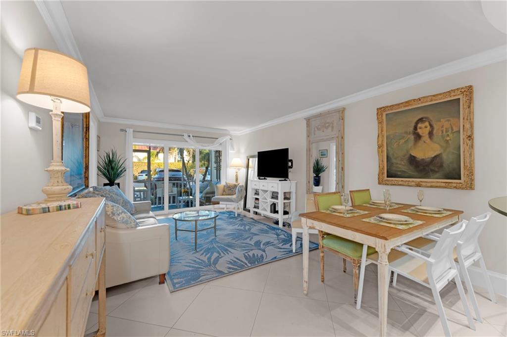 Once upon a time... this magical fairytale garden condo will take you to a dreamy place. Elegantly appointed with an open living dining room that is a perfect spot to relax after a day at the beach. The white tiled flooring and stunning crown molding have an elegant satin sheen The unique art deco solid wood doors give a decorator touch. In the kitchen, dramatic granite counters and breakfast bar pull it all together with a Fisher Paykel dishwasher and Bosch refrigerator. The primary bedroom featuring an ensuite bathroom with tub and shower, also has a large closet and is fit for a princess! The second bedroom with private ensuite bathroom is perfect for guests and also has a hidden stackable washer/dryer Screened lanai. AC 7 years and.....There is a Lovely private pool with grilling area! Never any hurricane damage. High elevation Come live the dream in the Golden Triangle, that special place between iconic 5th Ave., wonderful 3rd St. and the fabulous Gulf Walk to the Farmers Market, Art shows, Dining.