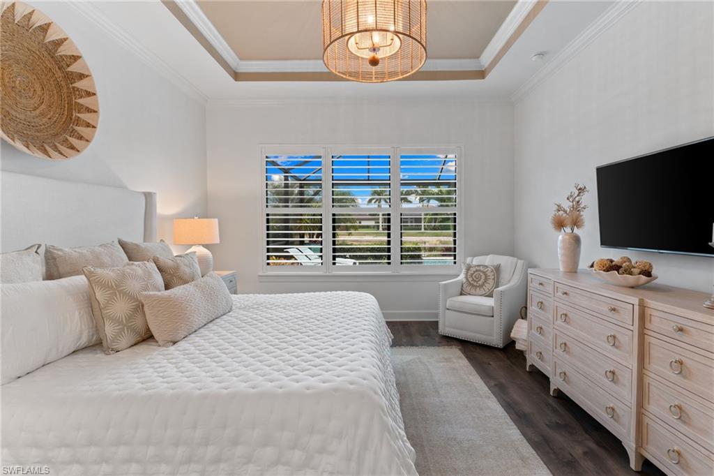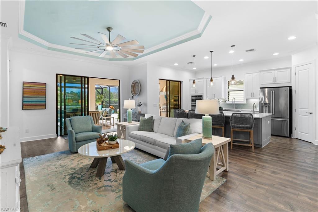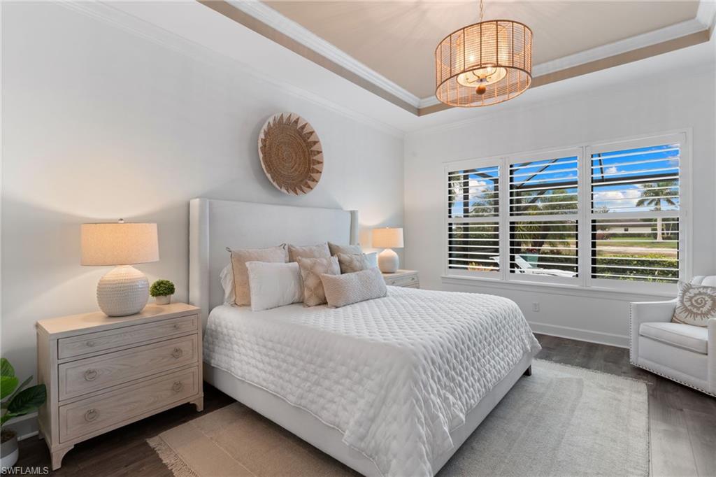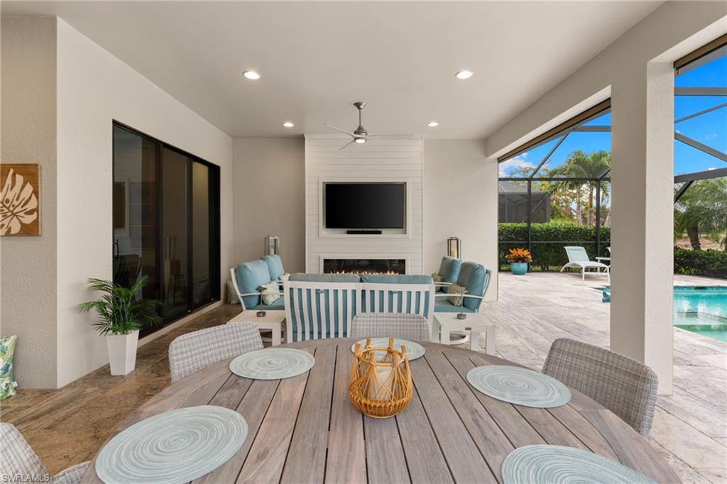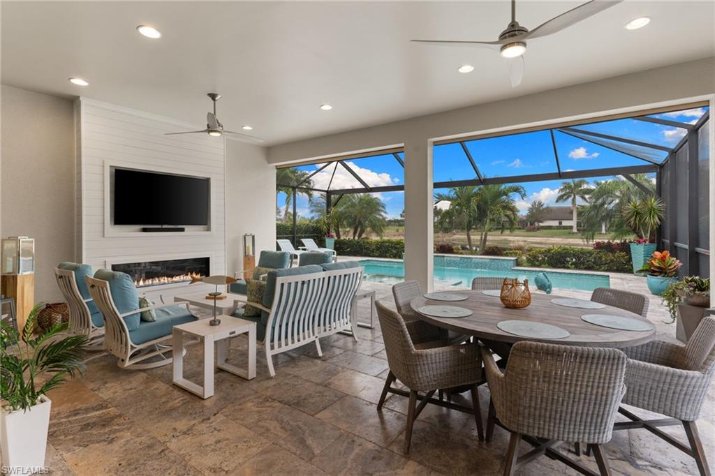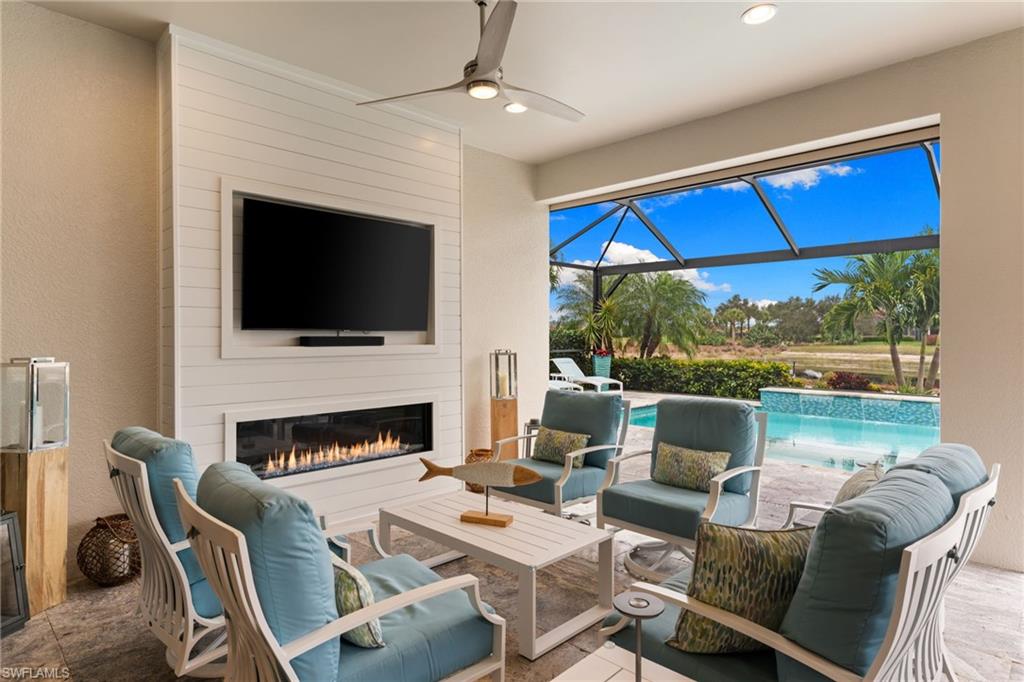 Welcome to 9334 Terresina Drive, your chance to own in the exclusive Esplanade Golf & Country Club of North Naples with a full-golf membership, deeded to your home. Every inch of this Lazio model has been meticulously maintained and upgraded, an exceptional opportunity to live a lifestyle that you have always dreamed of. A perfectly furnished ready-to-live, 3-bedroom, 3-bath residence with just under 2,300 square feet of open-concept living space - complemented by southern exposure, long lake views, and the pristine golf course. Stepping in, you are fully protected from all elements as natural light flows through the hurricane windows and wide open lanai. Unique to only this home the custom designs, accents, and furnishings are all included. The entire home showcases luxury: vinyl plank flooring throughout, crown molding, custom wall details, and elegant tray ceilings that add architectural interest to the main living areas and master suite. The heart of this home is the thoughtfully expansive kitchen, featuring premium shaker-style cabinetry, stunning Cambria quartz countertops, a gas cooktop with double wall oven, and all high-end stainless steel appliances. Each guest rooms includes it’s own, beautiful ensuite and the split layout allows for maximum privacy for you and your visitors. The outdoor living space is nothing short of spectacular - updated with beautiful travertine stone, a custom outdoor kitchen, and cozy seating around a built-in fireplace. Embrace the indoor-outdoor lifestyle by lowering the StormSmart electric screens and expanding your living area by opening the sliding doors. All this overlooking your pristine saltwater pool and spa - with all new pool equipment installed over the last three years. Professional landscaping with integrated lighting transforms the backyard into a private oasis, while the extra-wide driveway and epoxy-finished garage floor add both functionality and style. Outfitted with a Generac 24KW whole-house, natural gas generator for peace of mind. Kinetico whole-house water filtration and softening systems, impact windows throughout, plantation shutters grace all windows, a tankless gas hot-water heater, freshly painted inside (2024) and out (2023), ensuring a move-in ready experience that is seamless and worry-free. Best of all, your quarterly fee of just $3,743 covers full golf membership, landscaping maintenance, irrigation, and access to all of Esplanade's world-class amenities—including the resort pool with Bahama Bar, tennis, pickleball, bocce courts, a 14-mile network of trails, and the impressive 15,000-square-foot clubhouse with restaurant, wine-tasting room, and café. With exciting upgrades coming in 2026, including an air-conditioned indoor pickleball complex, this is your chance to secure a meticulously upgraded home in Naples' finest golf community.