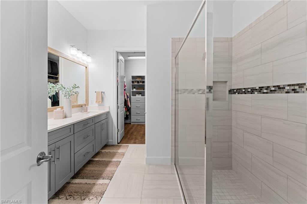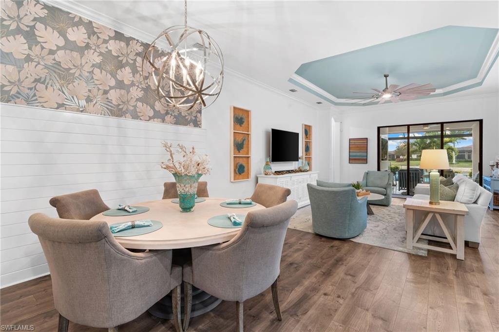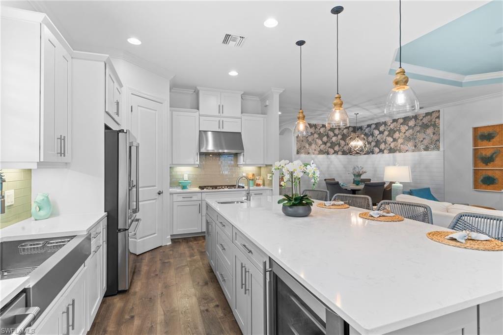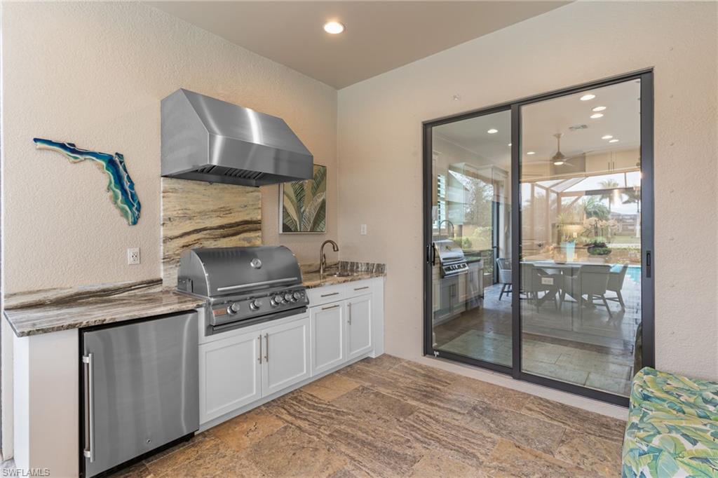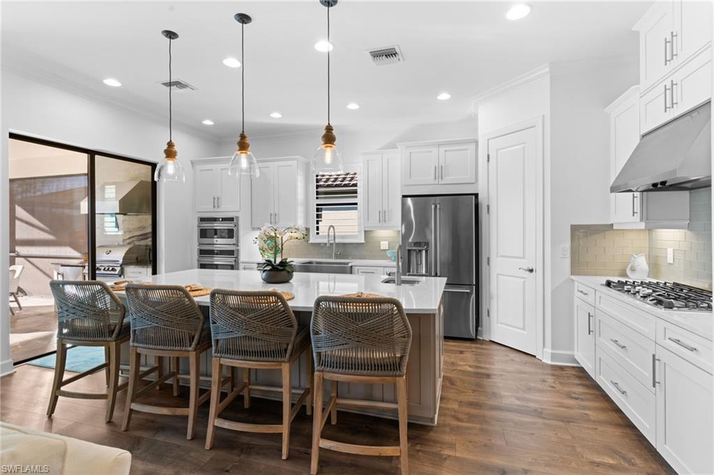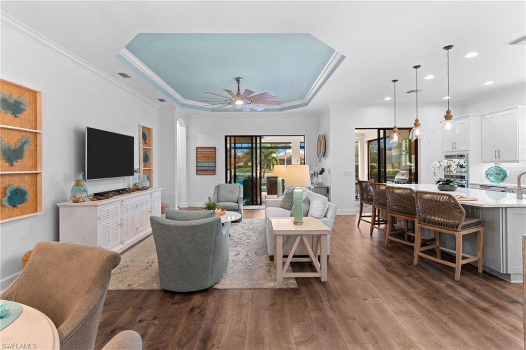 Welcome to 9334 Terresina Drive, your chance to own in the exclusive Esplanade Golf & Country Club of North Naples with a full-golf membership, deeded to your home. Every inch of this Lazio model has been meticulously maintained and upgraded, an exceptional opportunity to live a lifestyle that you have always dreamed of. A perfectly furnished ready-to-live, 3-bedroom, 3-bath residence with just under 2,300 square feet of open-concept living space - complemented by southern exposure, long lake views, and the pristine golf course. Stepping in, you are fully protected from all elements as natural light flows through the hurricane windows and wide open lanai. Unique to only this home the custom designs, accents, and furnishings are all included. The entire home showcases luxury: vinyl plank flooring throughout, crown molding, custom wall details, and elegant tray ceilings that add architectural interest to the main living areas and master suite. The heart of this home is the thoughtfully expansive kitchen, featuring premium shaker-style cabinetry, stunning Cambria quartz countertops, a gas cooktop with double wall oven, and all high-end stainless steel appliances. Each guest rooms includes it’s own, beautiful ensuite and the split layout allows for maximum privacy for you and your visitors. The outdoor living space is nothing short of spectacular - updated with beautiful travertine stone, a custom outdoor kitchen, and cozy seating around a built-in fireplace. Embrace the indoor-outdoor lifestyle by lowering the StormSmart electric screens and expanding your living area by opening the sliding doors. All this overlooking your pristine saltwater pool and spa - with all new pool equipment installed over the last three years. Professional landscaping with integrated lighting transforms the backyard into a private oasis, while the extra-wide driveway and epoxy-finished garage floor add both functionality and style. Outfitted with a Generac 24KW whole-house, natural gas generator for peace of mind. Kinetico whole-house water filtration and softening systems, impact windows throughout, plantation shutters grace all windows, a tankless gas hot-water heater, freshly painted inside (2024) and out (2023), ensuring a move-in ready experience that is seamless and worry-free. Best of all, your quarterly fee of just $3,743 covers full golf membership, landscaping maintenance, irrigation, and access to all of Esplanade's world-class amenities—including the resort pool with Bahama Bar, tennis, pickleball, bocce courts, a 14-mile network of trails, and the impressive 15,000-square-foot clubhouse with restaurant, wine-tasting room, and café. With exciting upgrades coming in 2026, including an air-conditioned indoor pickleball complex, this is your chance to secure a meticulously upgraded home in Naples' finest golf community.