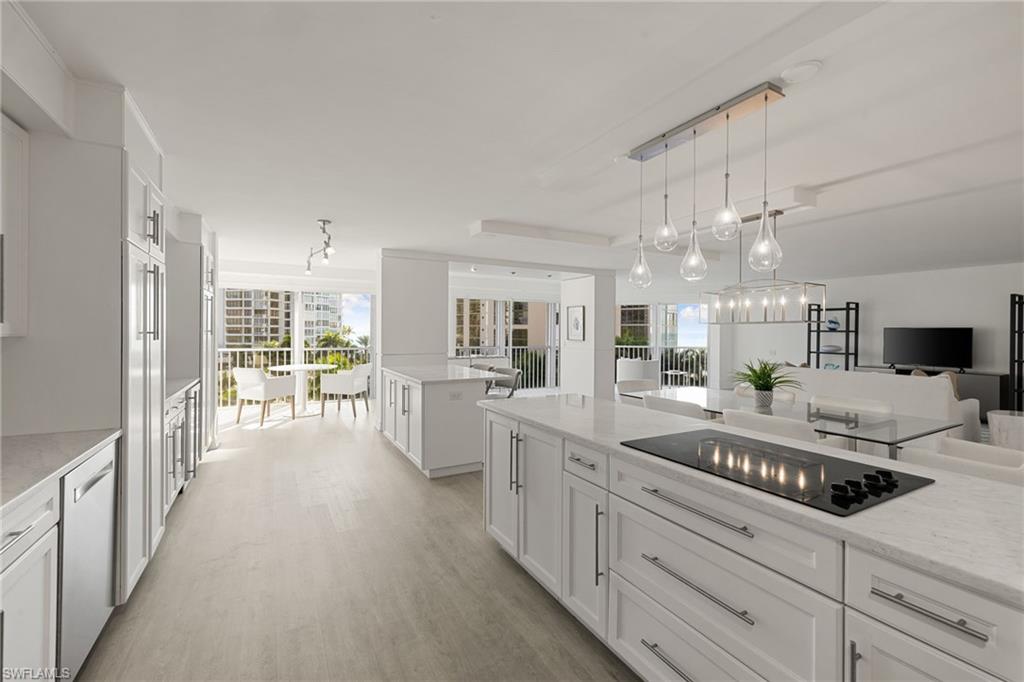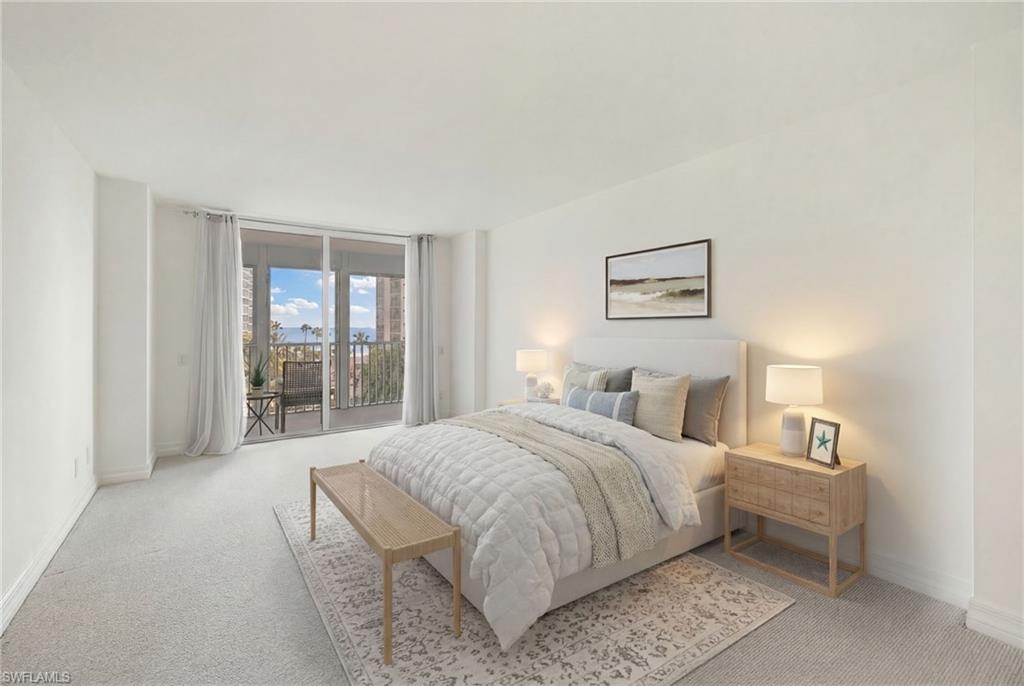 An opportunity to own a renovated sixth-floor residence on the prized south side of Monaco Beach Club, offering Gulf views from every room along with views of the lush landscaped grounds below. This spacious three-bedroom condominium features multiple private balconies and an expansive open-concept layout designed for comfortable living and entertaining. Walls of sliding glass doors fill the home with natural light and create seamless indoor-outdoor flow. The thoughtfully redesigned kitchen showcases white cabinetry, quartz countertops, stainless steel appliances, island seating, and a built-in beverage cooler, opening to generous dining and living areas. Light flooring and neutral coastal finishes create a bright, cohesive aesthetic throughout. The primary suite is privately positioned on one side of the residence and features its own balcony, generous closet space, and an updated bath. Two guest bedrooms are situated separately for privacy, with one offering private balcony access. Additional features include a dedicated laundry room, coat closet, and two separate storage closets. Residents enjoy direct beach access via a private boardwalk, a beachfront pool, fitness center, and 24-hour security. Ideally located across from Venetian Village for waterfront dining and shopping.