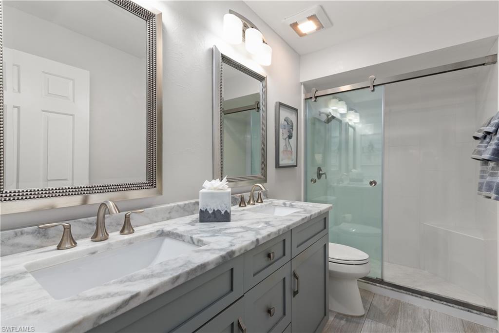 This one is a beauty!! Luxury meets gorgeous in this pristine move in ready villa. A spacious screened lanai entry leads to a WOW when you enter. A total remodel includes tasteful furnishings and even 3 flat screen tvs,positioned and installed. 2 bedroom/2 bath with current bedroom being used as an office but easily conveys back to a bedroom. All the work is done here with top of the line porcelain tile throughout, an open kitchen with a direct view and no obstructing cabinets.. The kitchen has new cabinetry , granite counter tops, gentle closing cabinets and an open view to the residential backyard and patio. A permitted glass enclosed addition /family room adds more space for a bar or flex room with Motorola shades, impact windows plus a manual hurricane shutter for the sliders that add value and hurricane protection. Both bathrooms have been impeccably and completely remodeled . The master bath has double granite sinks and walk in shower, tub combination in the guest. The spacious closeted have been remodeled and yet another bonus! ~ Boca Ciega Manor is a private and quaint community with a heated pool spa, sauna and rest rooms, just a stroll away . Concrete block structure on all the buildings and a detached large carport with extra storage just a bike ride or quick drive to the popular 5th Ave boutique shops and restaurants and the beach. Escape to your retreat in this beautiful private villa. Schedule your showing today!!