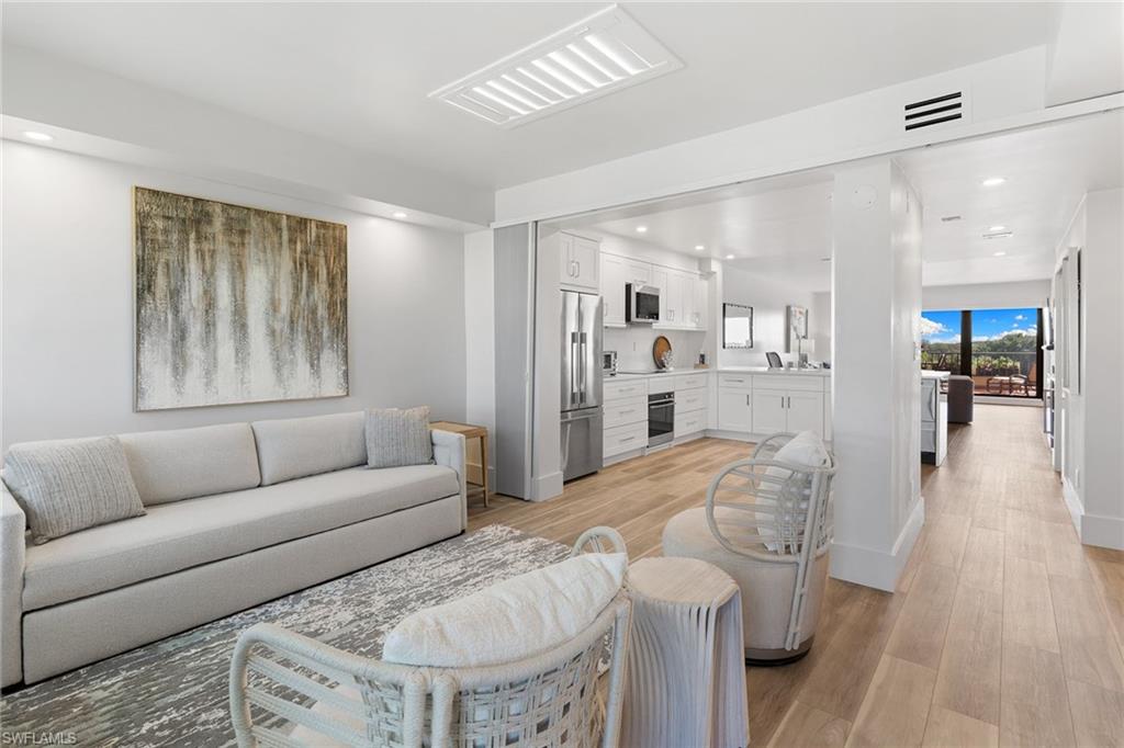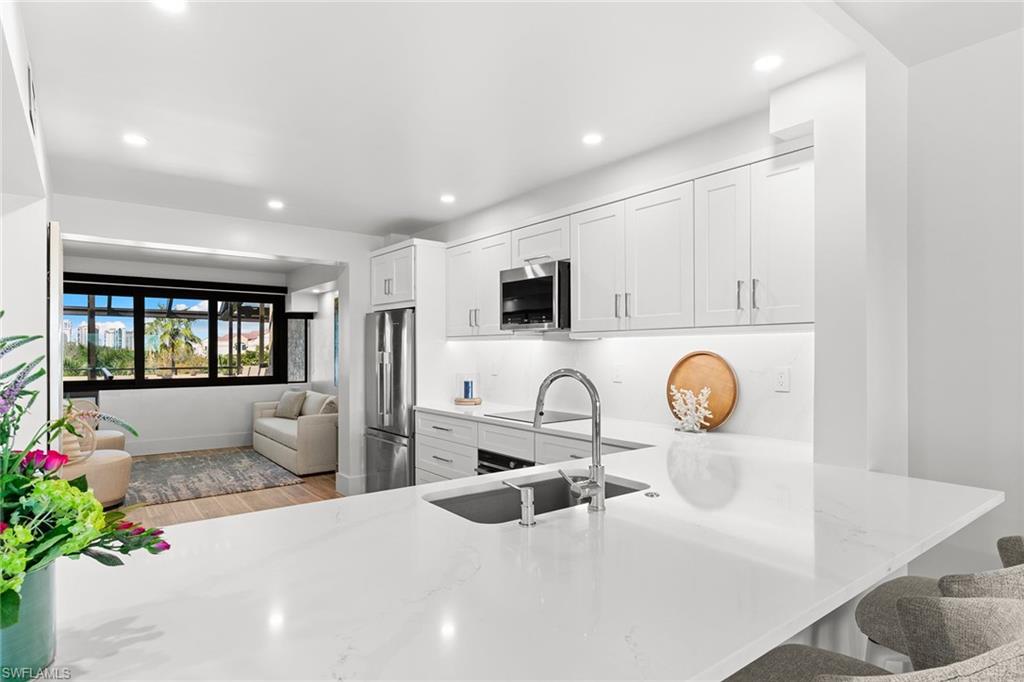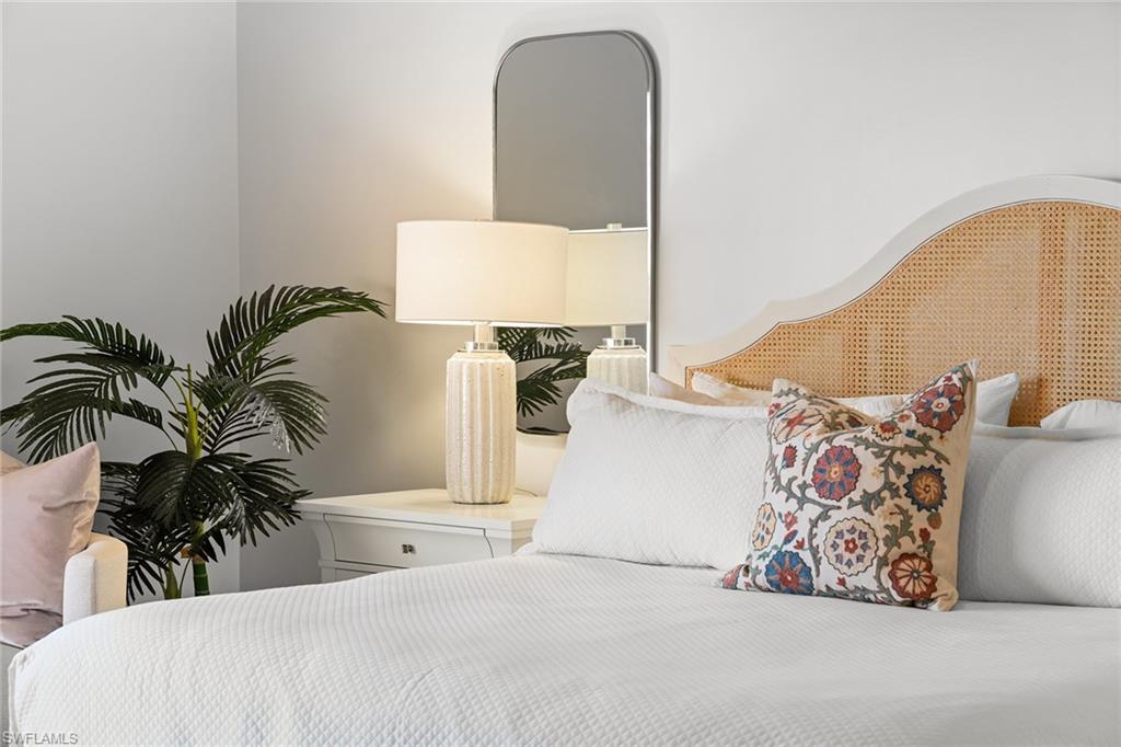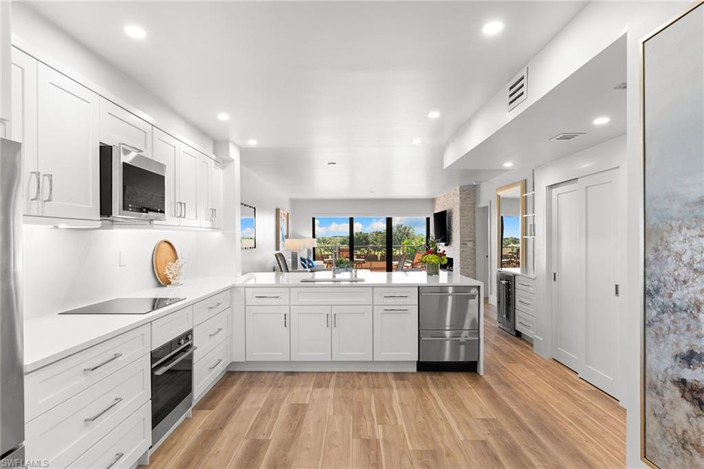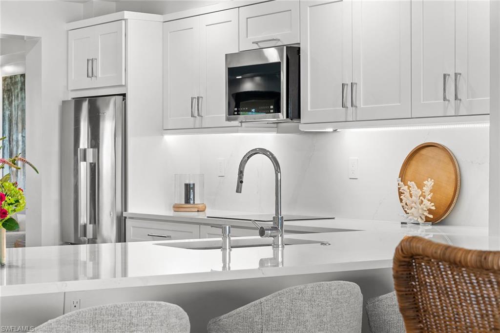 This turnkey Penthouse suite is an extraordinary residence inside the pristine Hyde Park community - coveted for incredible lake and golf course views, year-round panoramic sunsets, and ideally located near the Commons beach tram for direct access to Pelican Bay’s world-class amenities. Newly renovated by a luxury builder and furnished by Clive Daniel, walls were removed and ceilings raised to provide maximal space and function for modern living. This unit lives like a three bedroom condo - two spacious bedrooms and ensuite baths plus a comfortable den that easily converts into an optional third bedroom for extra guests. The centerpiece gourmet kitchen features custom white shaker cabinets and a breakfast bar with quartz countertops and premium Fisher & Paykel appliances. A separate dining and living room area is flanked by a modern vapor fireplace and custom beverage bar with built-in wine cooler - ensuring optimal entertaining. Your eyes will be drawn to the massive balcony terrace offering endless views which span the Gulf, fully embracing the essence of coastal luxury living. Completed with thoughtful consideration to every important detail - hurricane impact windows and doors, recessed lighting, seamless electric shades, pex plumbing, Kohler fixtures, premium decorative tiles, flooring, carpeting, custom closets and on. A large storage room and designated parking near the elevator complete everything you need to move right in and begin living your very best life today.