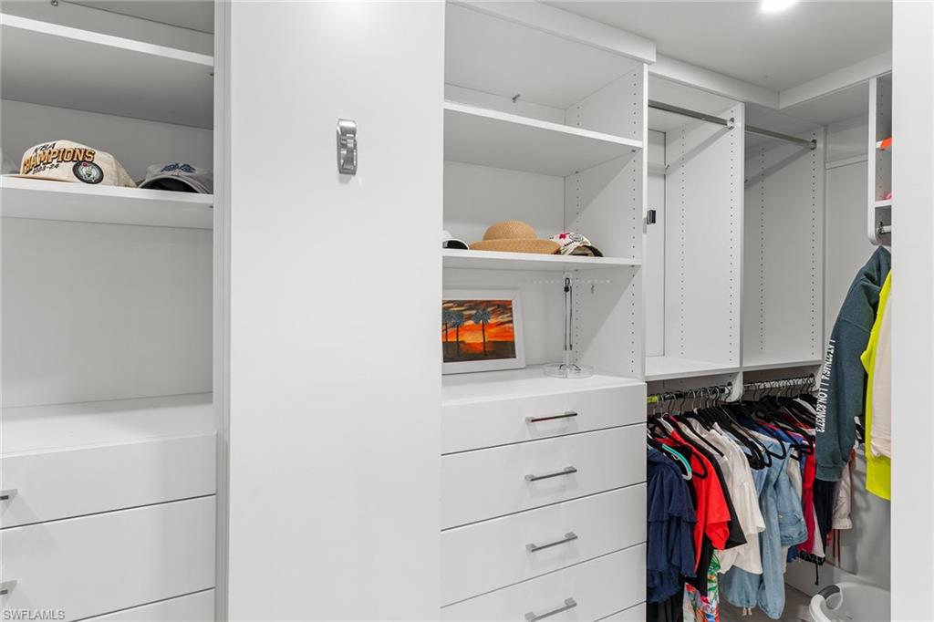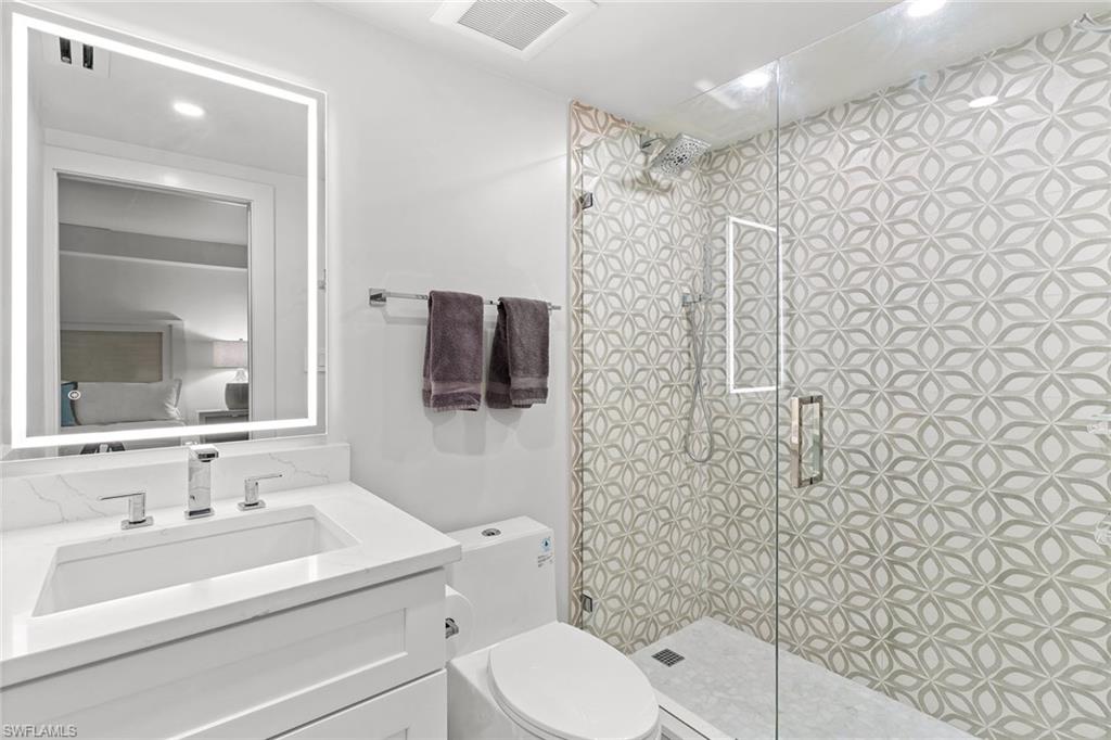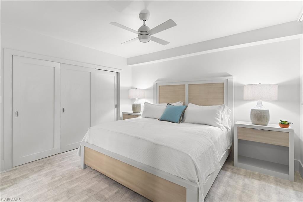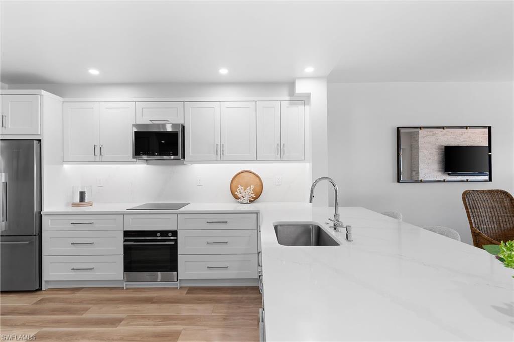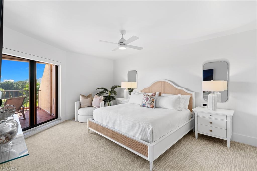 This turnkey Penthouse suite is an extraordinary residence inside the pristine Hyde Park community - coveted for incredible lake and golf course views, year-round panoramic sunsets, and ideally located near the Commons beach tram for direct access to Pelican Bay’s world-class amenities. Newly renovated by a luxury builder and furnished by Clive Daniel, walls were removed and ceilings raised to provide maximal space and function for modern living. This unit lives like a three bedroom condo - two spacious bedrooms and ensuite baths plus a comfortable den that easily converts into an optional third bedroom for extra guests. The centerpiece gourmet kitchen features custom white shaker cabinets and a breakfast bar with quartz countertops and premium Fisher & Paykel appliances. A separate dining and living room area is flanked by a modern vapor fireplace and custom beverage bar with built-in wine cooler - ensuring optimal entertaining. Your eyes will be drawn to the massive balcony terrace offering endless views which span the Gulf, fully embracing the essence of coastal luxury living. Completed with thoughtful consideration to every important detail - hurricane impact windows and doors, recessed lighting, seamless electric shades, pex plumbing, Kohler fixtures, premium decorative tiles, flooring, carpeting, custom closets and on. A large storage room and designated parking near the elevator complete everything you need to move right in and begin living your very best life today.