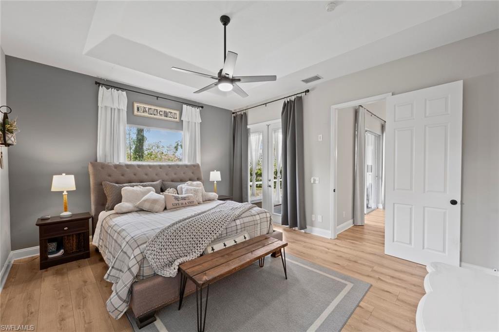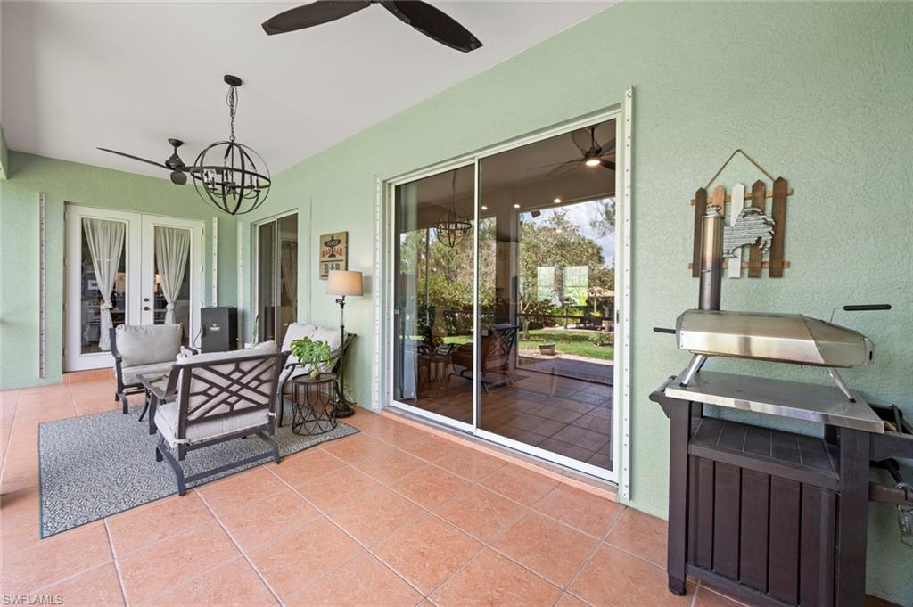 Set behind a private gate on a beautifully landscaped and fully fenced lot, this impeccably maintained Golden Gate Estates residence blends designer interiors with resort-caliber outdoor living. From the moment you arrive, the home’s stylish curb appeal, screened entry, and lush grounds—highlighted by a striking Hong Kong orchid, in your backyard entertaining space-set the tone for the quality found throughout. Inside, the home has been thoughtfully updated and shows like a model. Light wood-look vinyl plank flooring and new baseboards flow seamlessly throughout the living spaces, creating a cohesive, modern feel. The designer kitchen serves as the heart of the home, featuring upgraded cabinetry, large single-level counters, a dramatic waterfall island, full-height quartz backsplash, stainless steel appliances, and a convenient pantry—perfect for both everyday living and entertaining. Elegant wainscoting, curated light fixtures, and high-end ceiling fans add a custom touch throughout the main living areas. The bright primary suite is a true retreat, offering abundant natural light and French Doors to the screened rear lanai. The ensuite bath has been tastefully refreshed with new tile flooring, updated cabinetry, dual sinks, a walk-in shower, and a separate soaking tub accented by an elegant light fixture. A spacious walk-in closet completes the suite. Guest accommodations are equally well designed, with a private guest suite featuring charming wainscoting, a large guest bath, and a versatile third bedroom that functions beautifully as a home office or den. This space enjoys views of the expansive backyard, direct lanai access. A barn door allows the guest quarters to be separated from the main living area for added privacy. Outdoor living continues to make this property truly shine. The screened rear lanai extends the indoor living space outdoors, while an extended paver patio and covered pergola create an ideal setting for relaxing or entertaining. Enjoy Banana, avocado, and lychee trees as well as fruiting monsterras. Mature privacy hedges provide seclusion, and a storage shed with a tractor ramp adds functionality. Beyond the back gate, additional cleared land offers endless possibilities—perfect and ready for a shop, pasture, or toy storage. Additional features include a new high-efficiency A/C with maintenance and warranty package, full-home reverse osmosis system, solar attic fan, monitored security system with outdoor cameras, dedicated laundry area with sink, newer washer and dryer, and a garage equipped with ceiling-mounted storage, built-in cabinetry, and a window A/C unit. A full-yard irrigation system with app-enabled controls and quarterly pest control ensure ease of ownership. Ideally located in a peaceful, acreage-style setting while remaining close to shopping, dining, schools, and major roadways—with Naples’ beaches and amenities just a short drive away—this home offers the perfect balance of privacy, comfort, and modern living.