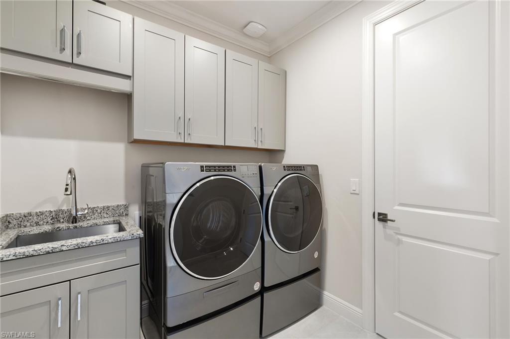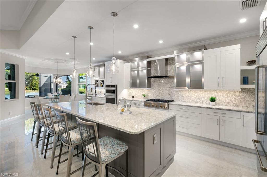 Welcome to an extraordinary residence in the Estate Collection of Azure at Hacienda Lakes, where refined design meets resort-style living. This Serino Expanded floor plan by Toll Brothers is one of the most highly upgraded homes ever built in the community, featuring nearly $650,000+ in builder and post-closing enhancements and offered furnished with designer furnishings by Robb & Stucky Interiors, along with select artwork from Galleries, for immediate enjoyment. From the moment you arrive, the home’s curb appeal is undeniable—Glacier paver driveway, upgraded architectural elevations, custom exterior lighting, and meticulously redesigned landscaping set the tone for what lies within. Step through upgraded entry doors into a light-filled interior defined by coffered and tray ceilings, custom trim work, solid core doors, and crown molding throughout. The heart of the home is a stunning expanded gourmet kitchen, thoughtfully designed for both everyday living and entertaining. Highlights include Sub-Zero built-in refrigeration, upgraded JennAir kitchen appliances, quartz countertops, an oversized island, custom cabinetry exceeding $100,000 in value, and a designer dry bar with wine refrigeration. The open layout flows seamlessly into the great room, where expansive sliders frame tranquil water views and lead to the outdoor living area. The luxurious primary suite is a true retreat, featuring an expanded spa-inspired bath with a freestanding soaking tub, custom tiled shower, granite countertops, upgraded fixtures, and a Toto Neorest washlet toilet. Every bedroom is enhanced with custom closet systems, wood flooring, and high-end finishes. Designed for elevated Florida living, the outdoor space rivals a private resort. The custom pool and spa showcase fire and water bowls, sun shelf with bubblers, river rock detailing, Stonescapes interior finish, marble coping, saltwater system, and full automation. An expanded covered lanai with cypress ceilings, outdoor kitchen, and no-see-um screened enclosure creates the perfect setting for year-round entertaining. Additional upgrades include a full-house Generac generator (2025), whole-home audio and smart systems, extensive low-voltage and lighting enhancements, built-in garage storage, enhanced security, and hurricane-ready features throughout. Located in the highly sought-after Azure at Hacienda Lakes, residents enjoy resort amenities including a clubhouse, pool, fitness center, tennis and pickleball, all just minutes from downtown Naples, Marco Island, and world-class beaches. This is not just a home—it is a statement of quality, craftsmanship, and lifestyle, offering a rare opportunity to own one of Azure’s finest residences.