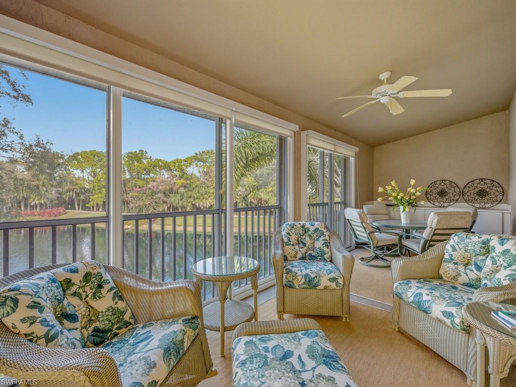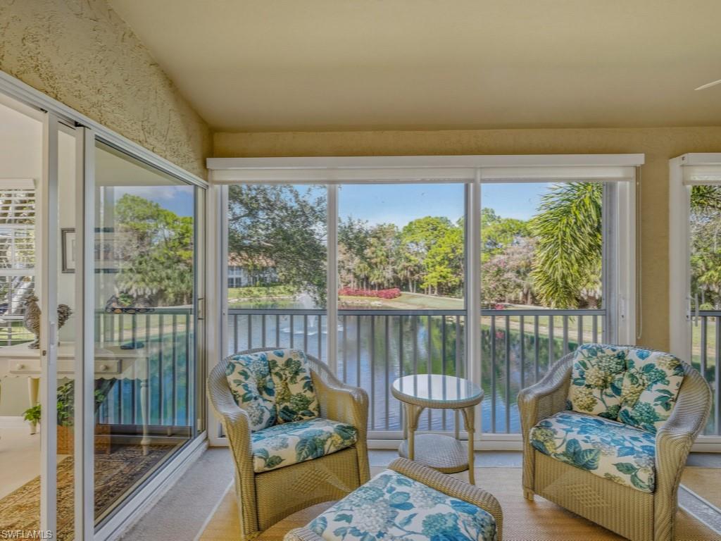 Enjoy tranquil lake, fountain, and preserve views from your enclosed lanai. This beautifully maintained second-floor condo offers vaulted ceilings, custom built-in shelving in den, a glassed-in lanai, and a level of peaceful ambiance that few units can offer. No overhead noise transfer from people walking above, and this building is situated nicely in a location that faces away from all surrounding roadways. Lovely and bright. A perfect second home or even year-round residence. The roofs in Cypress Cove were replaced in 2019, and the neighborhood was recently painted in 2022. Cypress Cove is a financially stable neighborhood within The Strand. Enjoy an active country club lifestyle, complete with 3 beautifully maintained 9-hole golf courses, tennis, pickleball, all new state of the art fitness center, an impressive pool with lap lanes, newer bocce courts, as well as a recently added croquet center and Island Bar for residents to enjoy. The recently renovated main clubhouse next door to the Jr. Olympic pool houses two upscale restaurants: Fine dining on the upper level, and the Tavern 59 restaurant opens into botanical garden/outdoor wedding venue location. The Strand is conveniently located within close proximity to many dining/shopping options, and the famous sugar sand beaches of the Gulf are just a straight shot down Immokalee Rd.