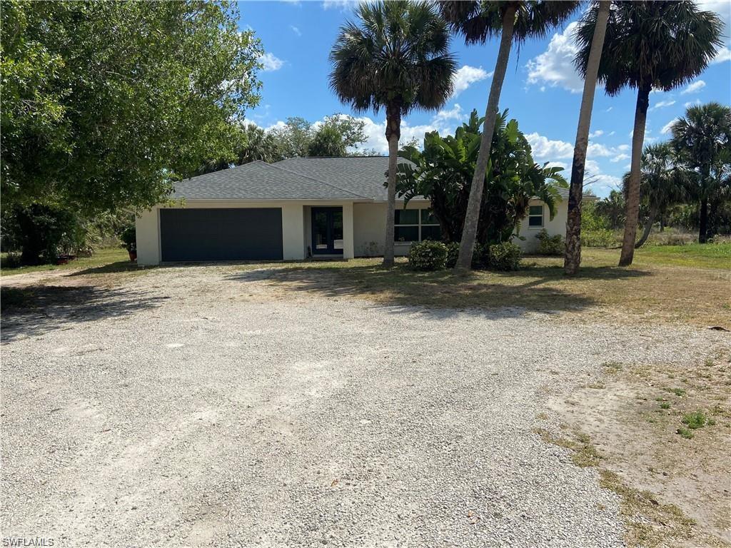 Get ready to be impressed by this beautifully revamped home, nestled on almost 3 acres of 100% upland. The layout is open and airy, with ample-sized rooms, including both a living area and a cozy family room. Throughout the home, you'll find striking 20" x 20" porcelain titles, brand-new wood cabinetry in the kitchen, and stunning natural quartzite countertops. The home features elegant crown molding, large 6" baseboards, and sleek custom floating vanities in both bathrooms. Additional perks include a modern bioethanol fireplace, hurricane-grade windows and doors, and much more! The expansive, tiled, screened-in lanai is built with strong aluminum columns and framework. Plus, there's a roomy two-car garage and an indoor utility area. This is a must see, showcasing all the upgrades with pride! MOTIVATED SELLER!! CONTRIBUTING TOWARDS BUYERS CLOSING COSTS!!!! ENTIRE HOME REVERSE OSMOSIS, ROOF 2019, AC 2023