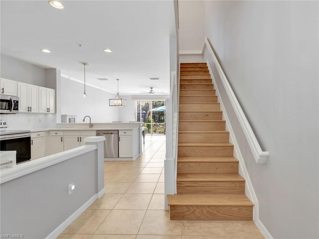 Welcome to this beautifully updated townhome in the desirable Milano community of North Naples, offering serene lake and fountain views with relaxing waterfall sounds from the Great Room and screened lanai. The lanai features Shellstone flooring, creating the perfect space to unwind while enjoying the peaceful water setting. The kitchen has been thoughtfully upgraded and features newer stainless steel appliances, quartz countertops, a subway tile backsplash, and under-cabinet LED lighting, blending modern style with everyday functionality. The home boasts 12-foot ceilings on the first floor and vaulted ceilings on the second floor, enhancing the open, airy feel throughout. Additional interior highlights include crown molding in the living room, updated light fixtures, neutral paint, new door hardware throughout, and a solid oak staircase. Some bedrooms feature COREtec flooring, while the spacious primary suite offers a large walk-in closet, abundant natural light, and stunning lake views. Upstairs bathrooms have updated faucets, and the first-floor bath includes a new Birch Lane vanity and mirror. Recent upgrades also include a large, efficient Lennox HVAC system with digital thermostats, newer washer and dryer, a 5-year-old water heater, sprinkler system, Ring doorbell, and keyless digital front door entry. Enjoy the convenience of a private attached single car garage with ceiling shelving, a 3/4 horsepower garage door opener, and hurricane shutters stored in the garage. Milano offers fantastic amenities including tennis courts, basketball courts, a community pool, and spa, all within This North Naples location offers the perfect blend of everyday convenience and coastal living. Just minutes to Mercato for shopping, dining, live entertainment, and nightlife, plus easy access to Seed to Table, a popular gourmet grocery, café, and social destination. Enjoy nearby fitness and wellness options, golf courses, parks, and a wide variety of upscale and casual dining. Outdoor recreation is abundant, with kayaking, paddleboarding, and nature preserves close by. When it’s time to unwind, you’re only minutes from Delnor-Wiggins Pass State Park, Vanderbilt Beach, and Barefoot Beach Preserve, known for soft white sand, shelling, and stunning Gulf sunsets. With quick access to I-75 and Southwest Florida International Airport, this location delivers the best of the Naples lifestyle.