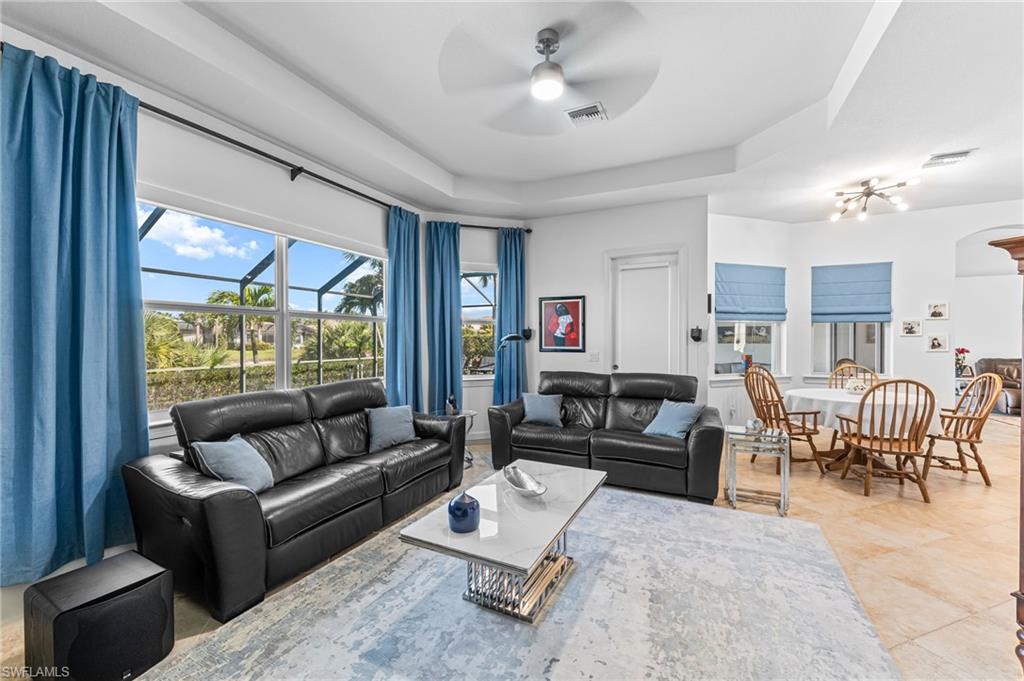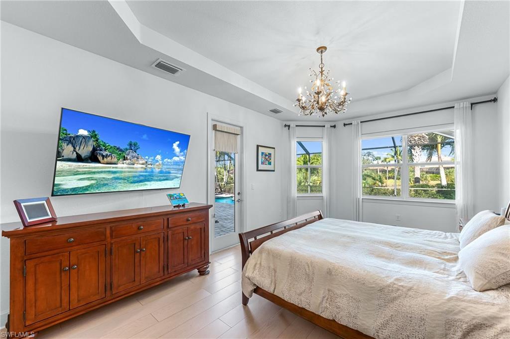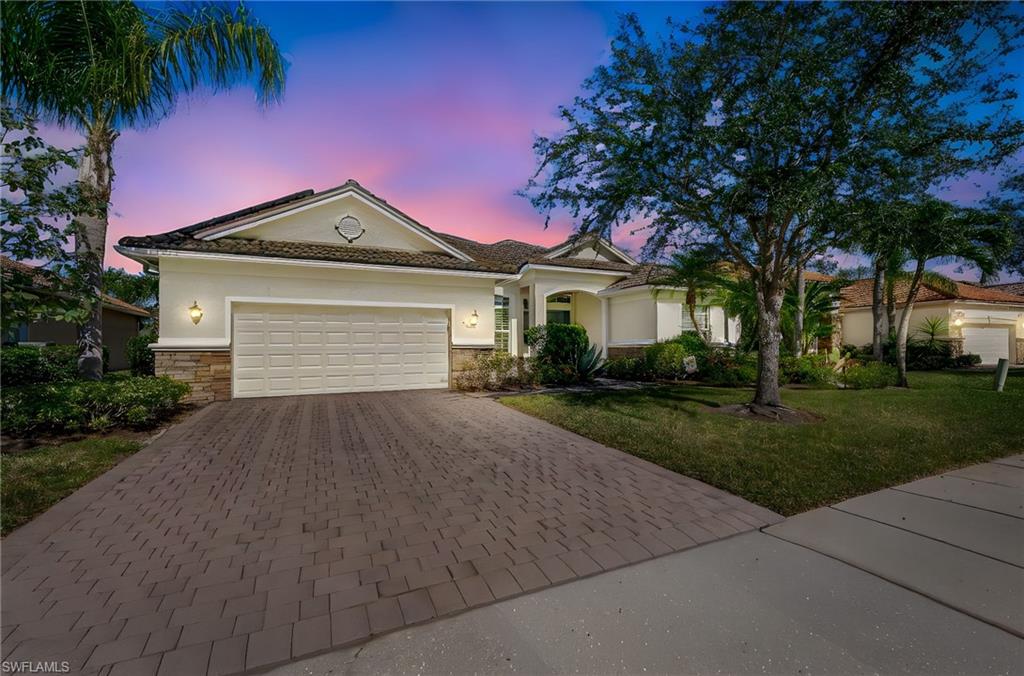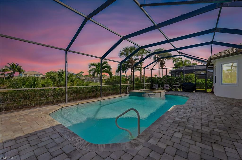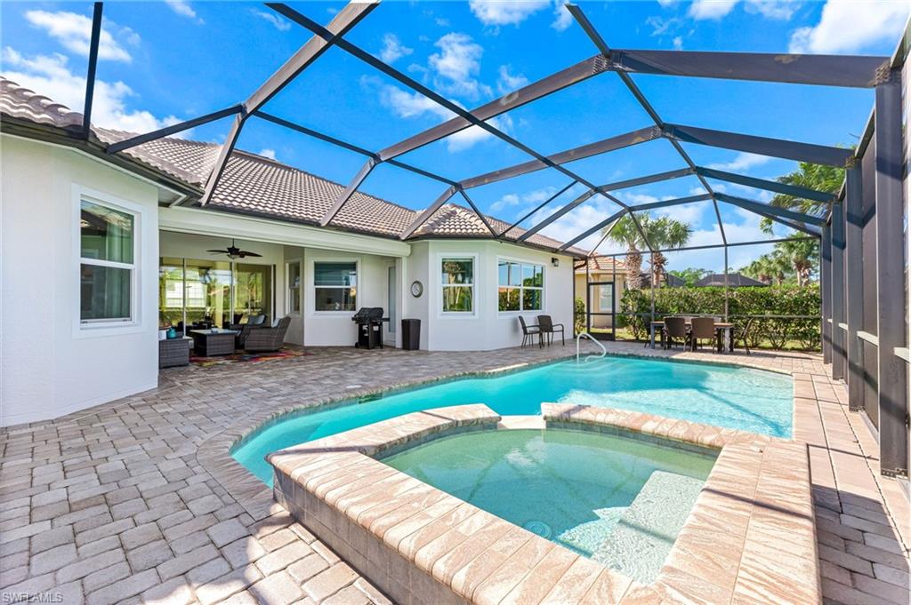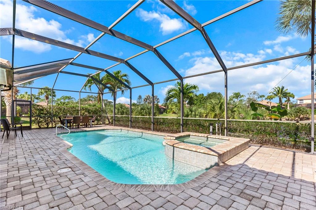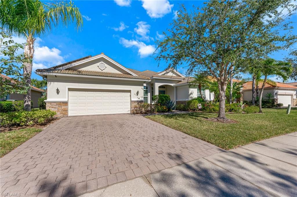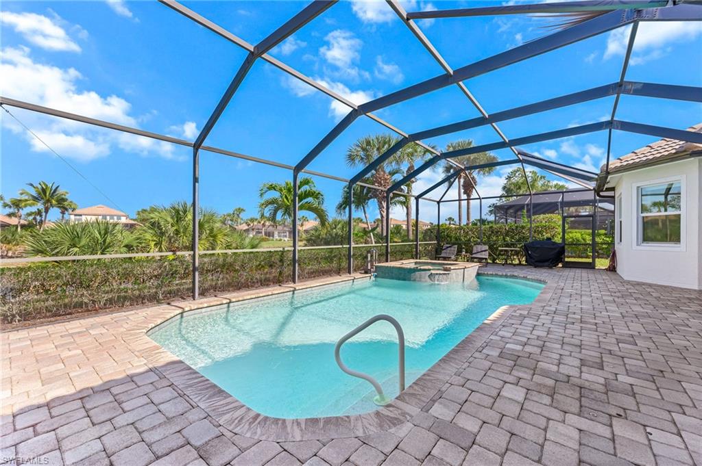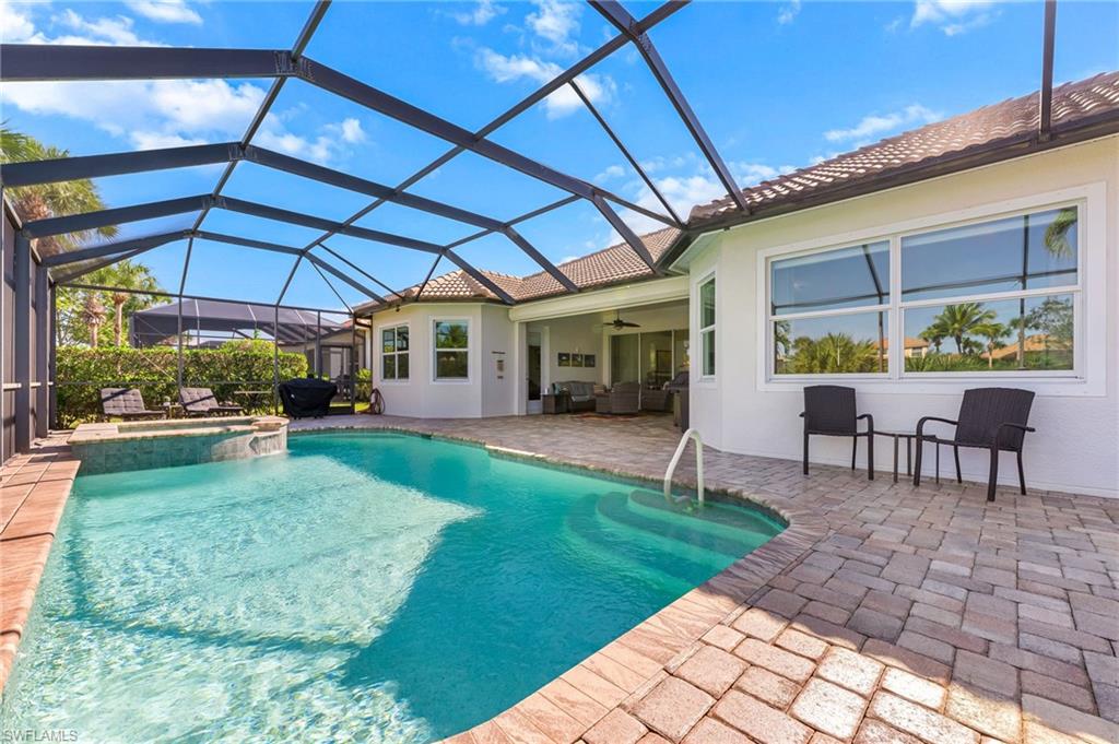 Beautifully maintained Franklin floor plan with tranquil lake views, and exceptional privacy on a spacious corner lot. bright southern exposure residence in the desirable Madison Park community. This home offers a split-bedroom layout, a versatile den and a newer HVAC system for added peace of mind. Seamless connection to expansive outdoor living spaces overlooking the sparkling pool, spa and serene water views. A French door entry with a transom window introduces the inviting interior, where diagonal tile flooring, volume and tray ceilings, crown molding, recessed lighting, arched walkways, and thoughtfully placed ceiling fans enhance the home’s warm and open feel. The kitchen features wood cabinetry, granite countertops, a mosaic tile backsplash above the range, black appliances, including a range, microwave, refrigerator with ice maker, and a new dishwasher, along with an adjacent dining area framed by large windows overlooking the pool/spa. The living room offers pocket sliders that expand the space onto the lanai, ideal for everyday relaxation or entertaining. The owner’s suite is a serene retreat with wood flooring, white plantation shutters, lanai access, three walk-in closets with built-ins, and an elegant en-suite bath featuring dual granite vanities with a makeup counter, a full-width mirror, a walk-in shower with a bench, a privacy window for natural light and a separate jetted soaking tub. Two additional guest spaces offer versatility: one guest bedroom with wood flooring, plantation shutters, and an adjacent bath with a tub-shower combo, and a second guest bedroom with double-door entry and plantation shutters. The den, also with double-door entry, wood flooring and an arched transom window, provides the ideal flex space for an office or hobby room. Outdoor living is a highlight, with a spacious covered lanai featuring dual ceiling fans, along with a separate screened enclosure that includes a Heliocol Solar heated pool with a new heater, a spa and a waterfall feature. Lake views and electric storm shutters add convenience and peace of mind. Madison Park’s prime location offers quick access to shopping, dining, downtown 5th Avenue, Marco Island and world-renowned beaches of Naples. The community features six lakes, abundant natural preserves, and opportunities for fishing and birdwatching. Low HOA fees include lawn and landscape maintenance, making this an ideal choice for those seeking convenience and an active Naples lifestyle in a beautifully maintained, welcoming community. Pay only $25.16 monthly energy cost total with 48 Solar Panel system with a 30kw Backup Battery. Newly installed Hurricane Impact Windows with 2 Electric Shutters and Electric water Heater.