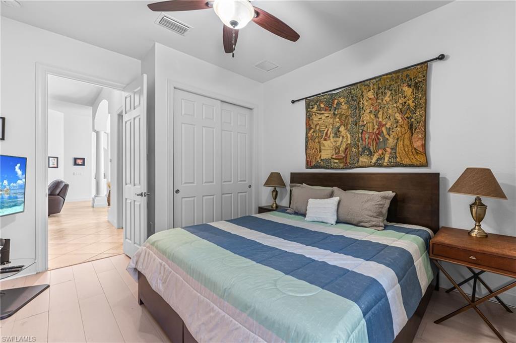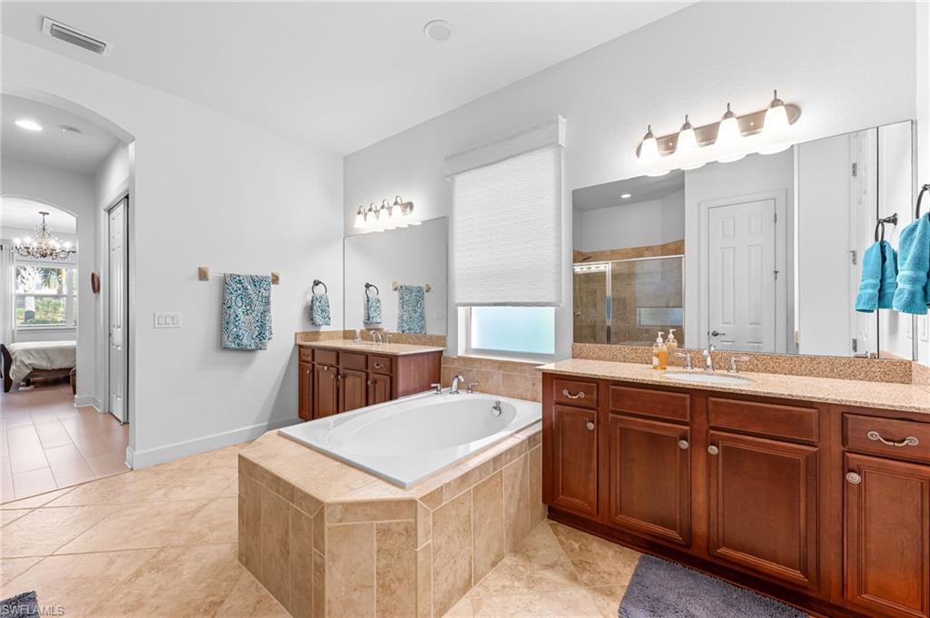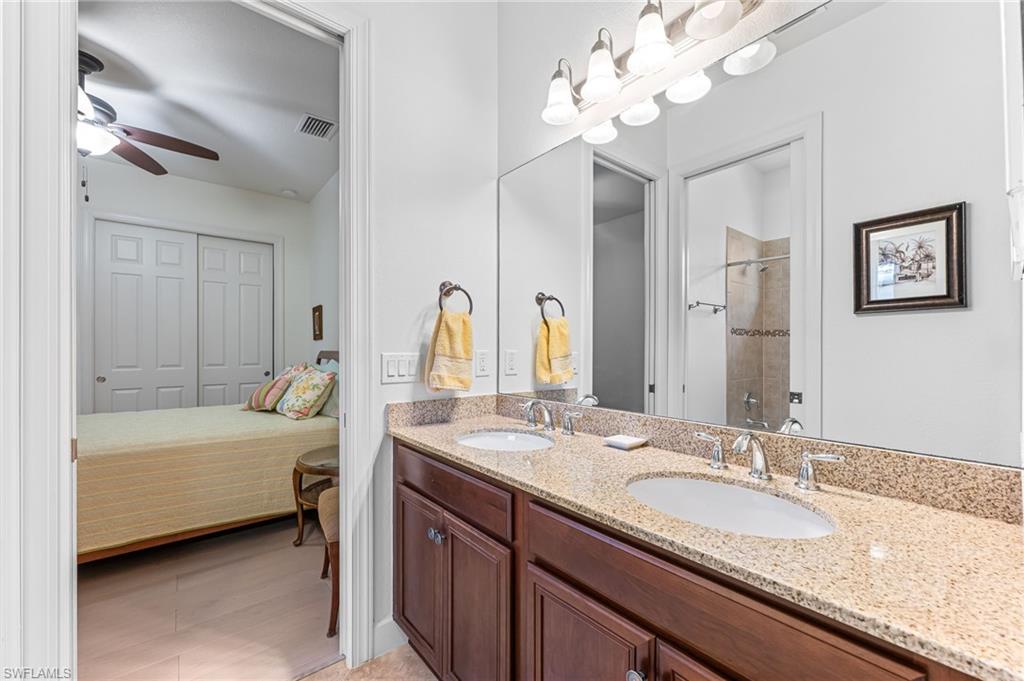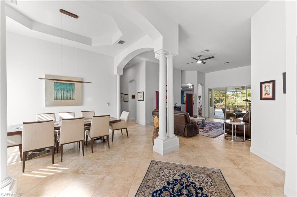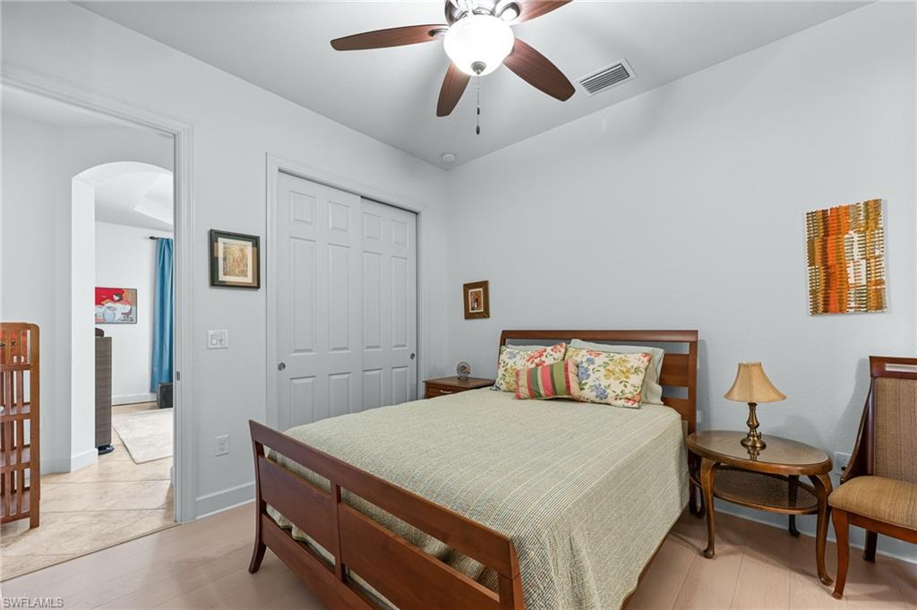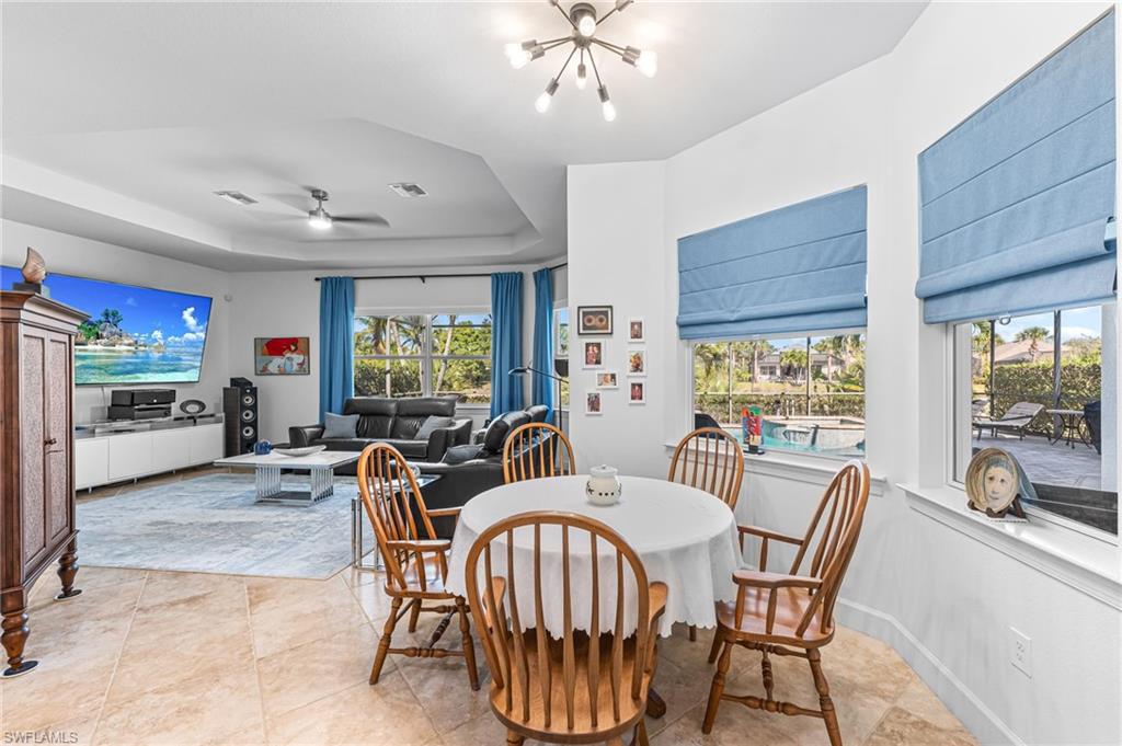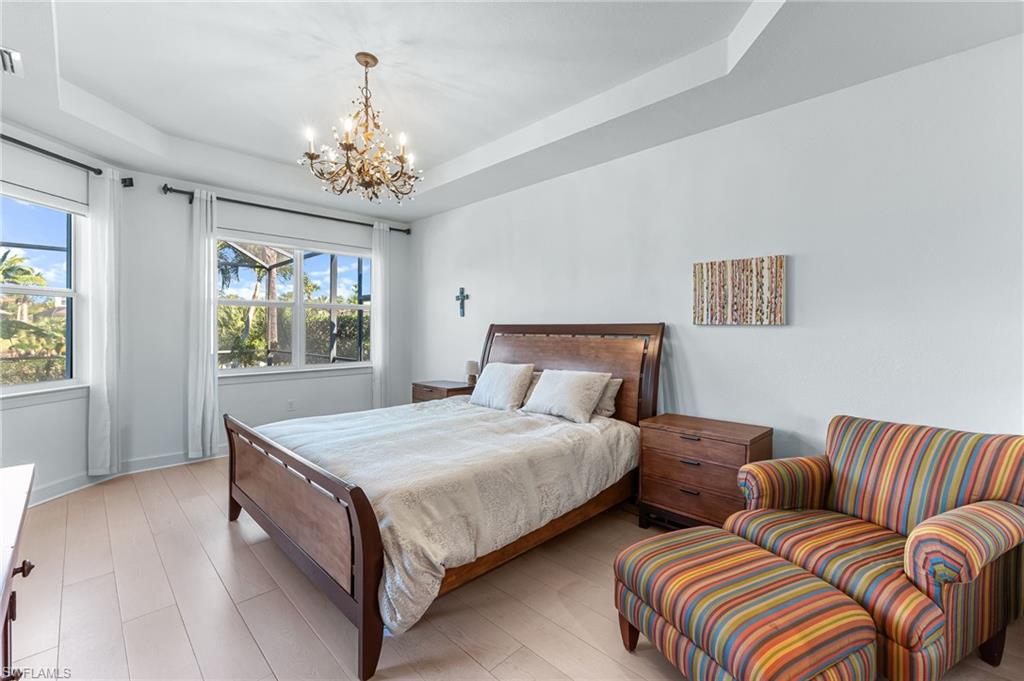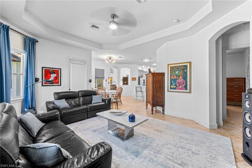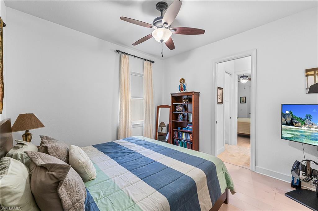 Beautifully maintained Franklin floor plan with tranquil lake views, and exceptional privacy on a spacious corner lot. bright southern exposure residence in the desirable Madison Park community. This home offers a split-bedroom layout, a versatile den and a newer HVAC system for added peace of mind. Seamless connection to expansive outdoor living spaces overlooking the sparkling pool, spa and serene water views. A French door entry with a transom window introduces the inviting interior, where diagonal tile flooring, volume and tray ceilings, crown molding, recessed lighting, arched walkways, and thoughtfully placed ceiling fans enhance the home’s warm and open feel. The kitchen features wood cabinetry, granite countertops, a mosaic tile backsplash above the range, black appliances, including a range, microwave, refrigerator with ice maker, and a new dishwasher, along with an adjacent dining area framed by large windows overlooking the pool/spa. The living room offers pocket sliders that expand the space onto the lanai, ideal for everyday relaxation or entertaining. The owner’s suite is a serene retreat with wood flooring, white plantation shutters, lanai access, three walk-in closets with built-ins, and an elegant en-suite bath featuring dual granite vanities with a makeup counter, a full-width mirror, a walk-in shower with a bench, a privacy window for natural light and a separate jetted soaking tub. Two additional guest spaces offer versatility: one guest bedroom with wood flooring, plantation shutters, and an adjacent bath with a tub-shower combo, and a second guest bedroom with double-door entry and plantation shutters. The den, also with double-door entry, wood flooring and an arched transom window, provides the ideal flex space for an office or hobby room. Outdoor living is a highlight, with a spacious covered lanai featuring dual ceiling fans, along with a separate screened enclosure that includes a Heliocol Solar heated pool with a new heater, a spa and a waterfall feature. Lake views and electric storm shutters add convenience and peace of mind. Madison Park’s prime location offers quick access to shopping, dining, downtown 5th Avenue, Marco Island and world-renowned beaches of Naples. The community features six lakes, abundant natural preserves, and opportunities for fishing and birdwatching. Low HOA fees include lawn and landscape maintenance, making this an ideal choice for those seeking convenience and an active Naples lifestyle in a beautifully maintained, welcoming community. Pay only $25.16 monthly energy cost total with 48 Solar Panel system with a 30kw Backup Battery. Newly installed Hurricane Impact Windows with 2 Electric Shutters and Electric water Heater.