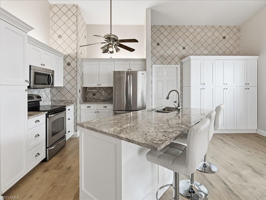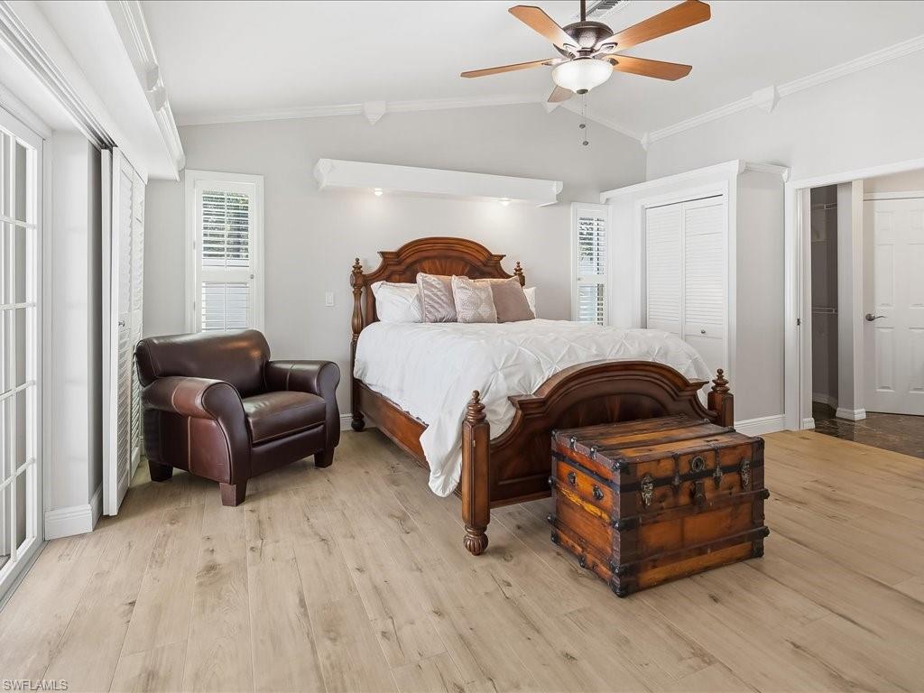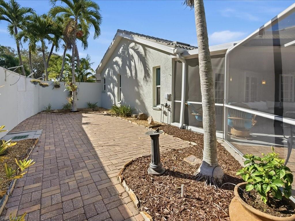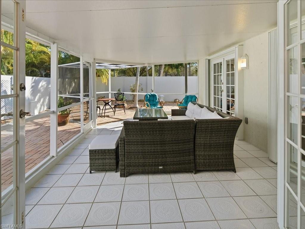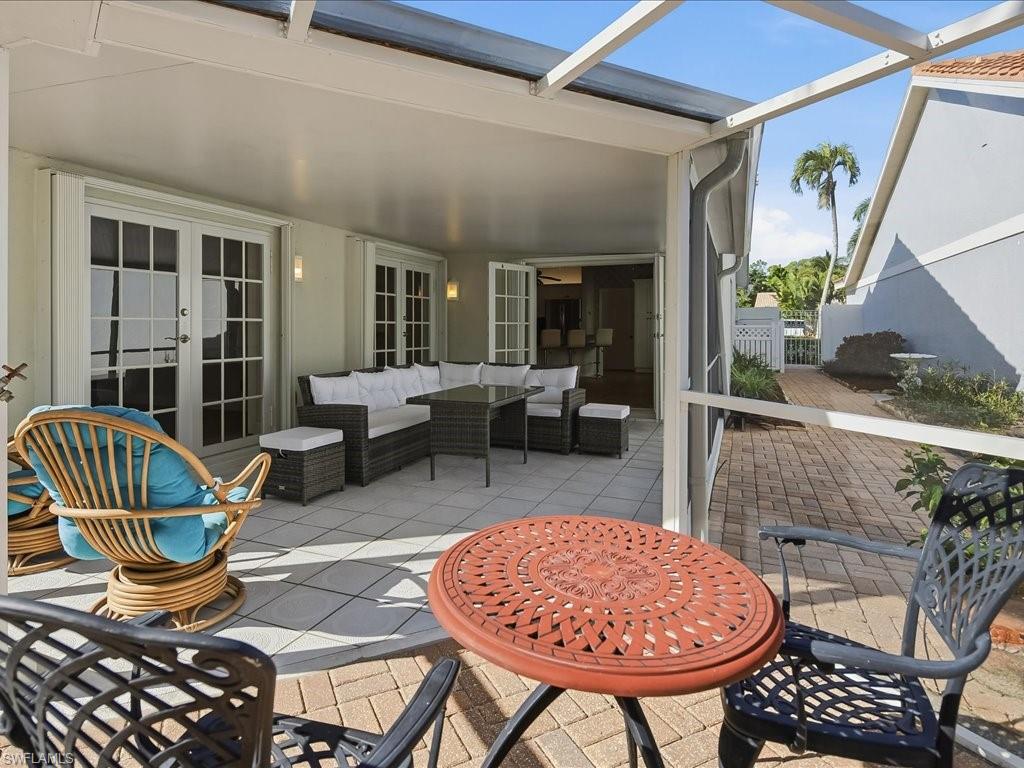Welcome to this move-in-ready, single-family home centrally located to the best Naples has to offer. The home has soaring ceilings, skylights and bay windows providing an abundance of natural light. It has been updated with hurricane impact glass windows, plank wood-style tile flooring, custom kitchen cabinets with modern granite counters and newer stainless appliances, a tasteful wet bar, HVAC (2024), washer (2025), newer tile roof (2017) and plantation shutters throughout. The home has an oversized 2 car garage with extra storage, washer/dryer and utility sink, and a central vacuum system. This garden home opens with six French doors to an expansive outdoor area including a screened in lanai as well as back and side outdoor space fully enclosed by privacy walls. The home lives like a full three-bedroom home plus a flexible Den space. A short drive to Historic Downtown Naples and the Gulf Beaches with Shopping and Restaurants, close access to Schools, a quick access outside the community to the 3 mile paved Rich King Greenway for beautiful and safe biking or walking. Note: Internet, Cable, Lawn Maintenance, access to the community pool, tennis & pickleball courts are included in the Low HOA fees. This hidden gem of a community offers the best of the Coastal Naples lifestyle - a great investment opportunity!