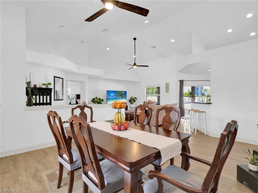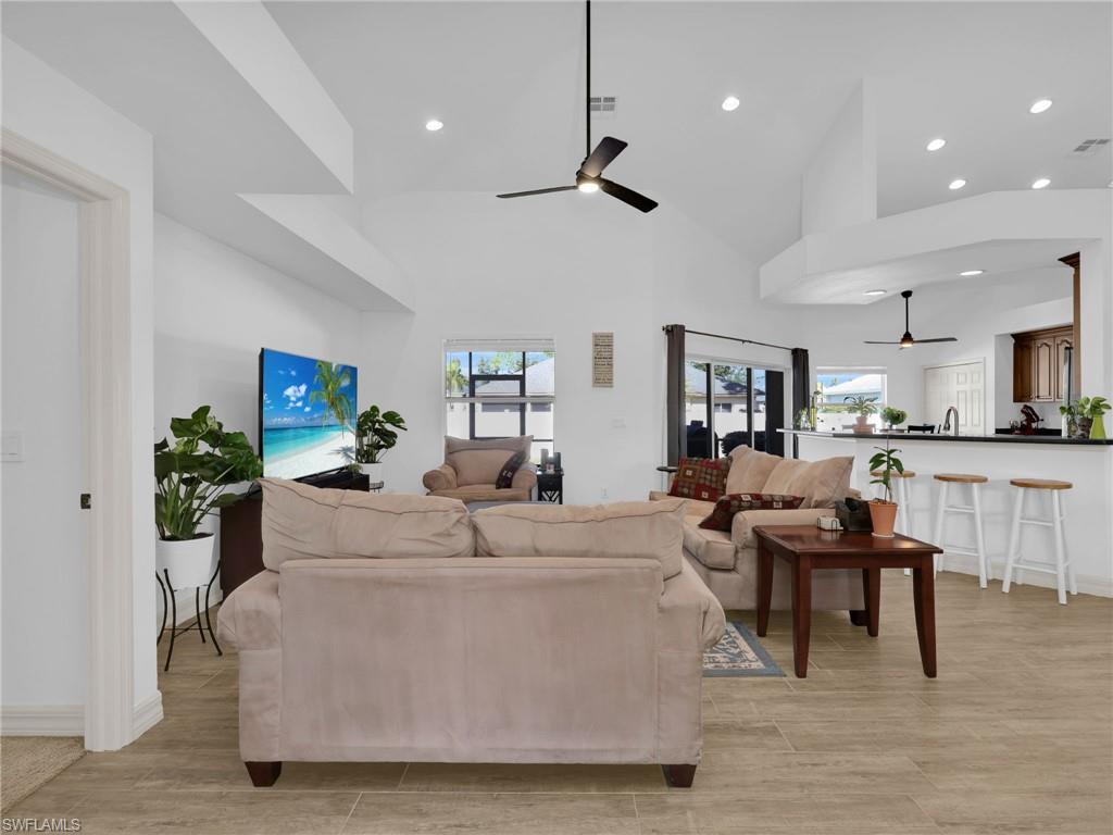 This custom-built 3-bedroom, 2-bath concrete block home sits on a spacious quarter-acre lot with no restrictions, offering flexibility and room to truly live. The open-concept design features soaring 14’ vaulted ceilings in the great room and kitchen, 9’ ceilings throughout, and a tray ceiling in the primary suite. Recent upgrades include a new garage door (2025), new tile flooring (2025), new kitchen refrigerator (2025), new garage refrigerator (2025), new water heater (2024), new roof (2023), new lanai framing and screen (2023), new microwave (2023), new dishwasher (2022), new A/C (2021), and a new double oven (2021). Additional highlights include impact glass windows and sliding glass doors, solid core interior doors, marble window sills, upgraded 5” baseboards, an under-sink water filtration system, an oversized garage, tiled lanai, and an oversized front porch with gazebo—ideal for entertaining or relaxing. Conveniently located just minutes from vibrant downtown Bonita Springs, with a short drive to the beach, I-75, and RSW International Airport, this home combines quality construction, thoughtful updates, and an unbeatable location.