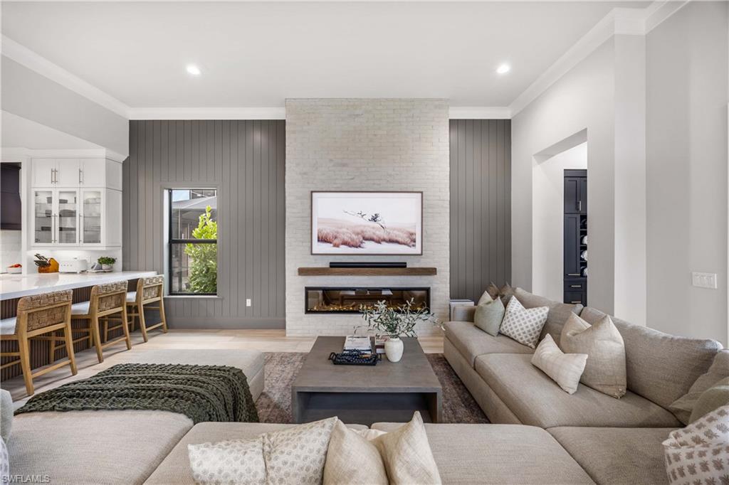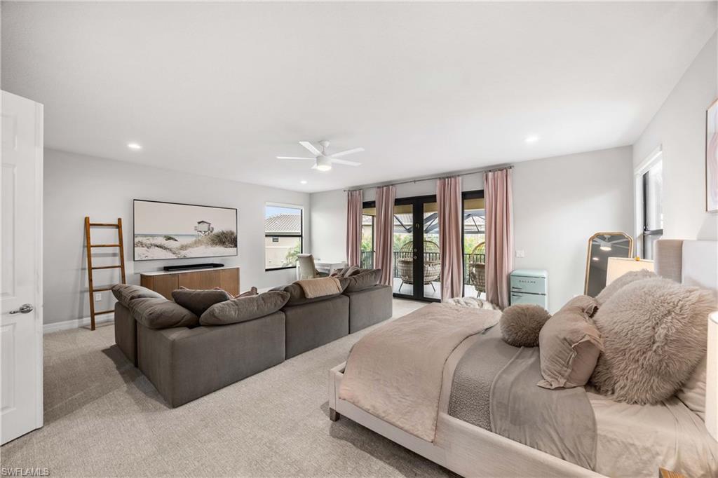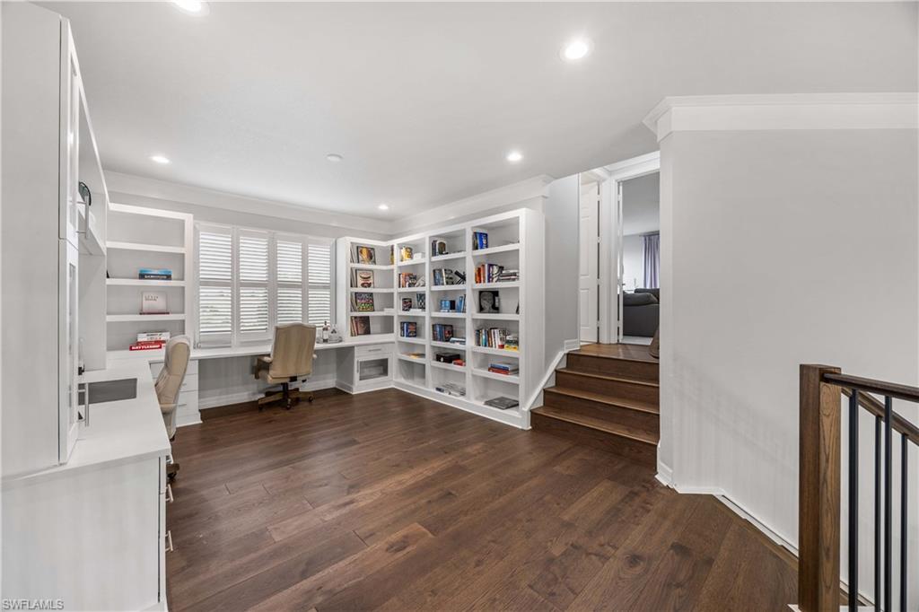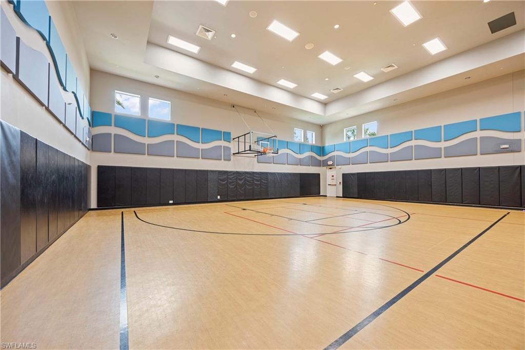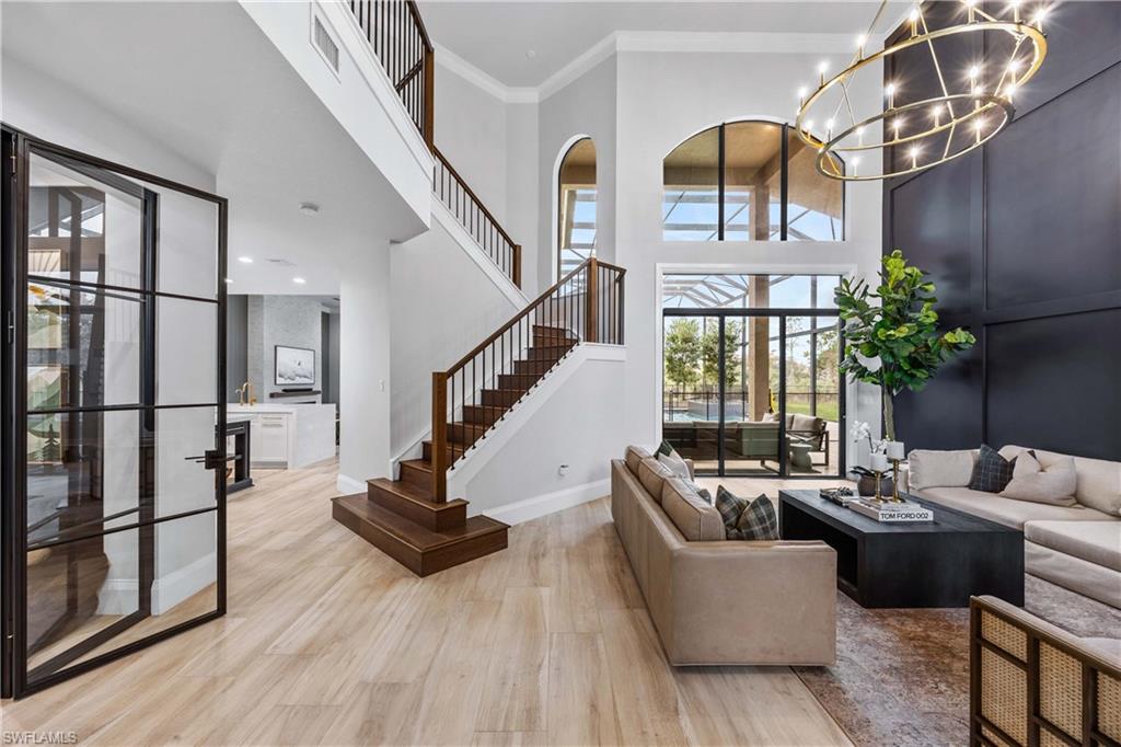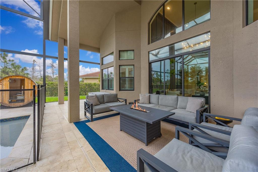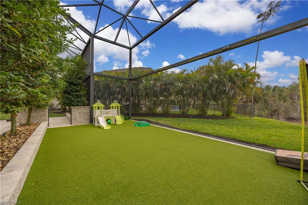 Set on one of the largest and most coveted pie-shaped lots in Riverstone, this exceptional residence delivers a level of privacy, scale, and customization rarely found—tucked at the end of a quiet cul-de-sac and fully transformed with high-end modern finishes throughout. This Dubonnet Grande floor plan is a true standout, offering five bedrooms, two dedicated offices, a spacious game room, formal living area, and a versatile downstairs playroom or formal dining space, along with a three-car garage. The interior has been fully renovated and thoughtfully curated, featuring statement wall detailing, a sleek fireplace, striking new front doors, wood-look tile downstairs, hardwood floors upstairs, and plush carpet in the bedrooms. Every space feels intentional, contemporary, and move-in ready. Step outside to what is arguably the home’s most extraordinary feature: a massive, double-story panoramic screen enclosure—nearly unheard of in scale—creating a private resort-style environment across both levels. The outdoor living area includes a pool and spa, an indoor screened basketball zone, and a unique in-screen soccer turf field framed by lush Japanese blueberry trees with integrated irrigation. The fully fenced backyard adds another layer of space and privacy rarely available in the community. Additional upgrades include a custom wood sauna, electric car charger, and extensive electrical enhancements. Located within the gated, amenity-rich enclave of Riverstone, residents enjoy a state-of-the-art fitness center, resort pool, pickleball and tennis courts, playground, splash pad, and impressively low HOA fees for such an extensive lifestyle offering. Homes of this caliber—on lots of this size, with this level of renovation and outdoor infrastructure—seldom come to market in Naples. This is a rare opportunity to own one of the community’s most distinctive and thoughtfully upgraded residences.