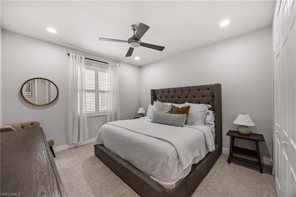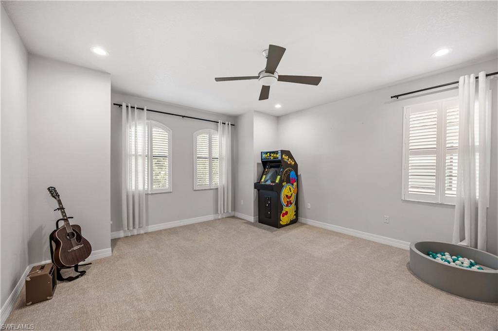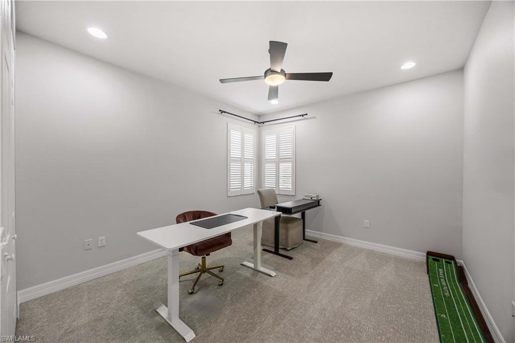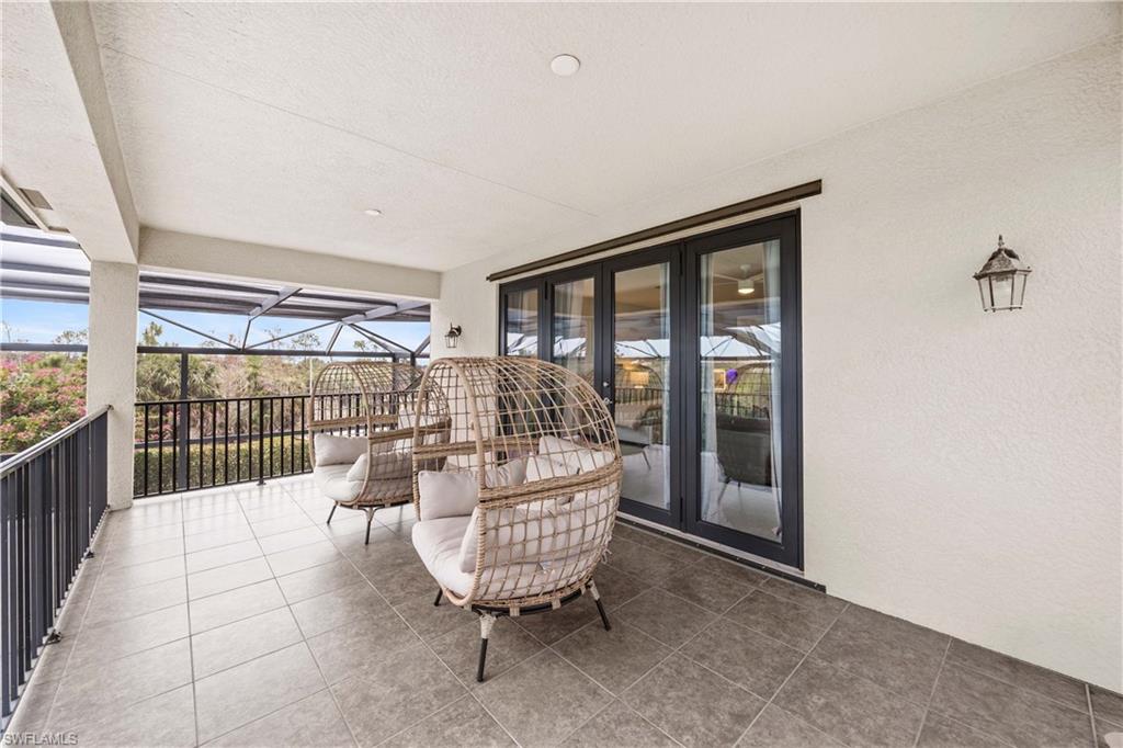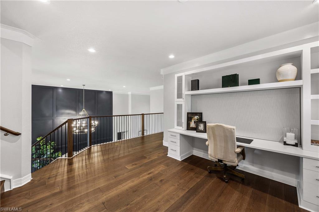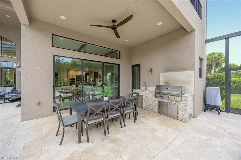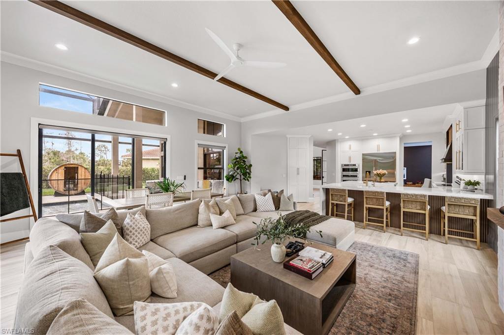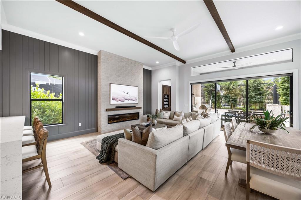 Set on one of the largest and most coveted pie-shaped lots in Riverstone, this exceptional residence delivers a level of privacy, scale, and customization rarely found—tucked at the end of a quiet cul-de-sac and fully transformed with high-end modern finishes throughout. This Dubonnet Grande floor plan is a true standout, offering five bedrooms, two dedicated offices, a spacious game room, formal living area, and a versatile downstairs playroom or formal dining space, along with a three-car garage. The interior has been fully renovated and thoughtfully curated, featuring statement wall detailing, a sleek fireplace, striking new front doors, wood-look tile downstairs, hardwood floors upstairs, and plush carpet in the bedrooms. Every space feels intentional, contemporary, and move-in ready. Step outside to what is arguably the home’s most extraordinary feature: a massive, double-story panoramic screen enclosure—nearly unheard of in scale—creating a private resort-style environment across both levels. The outdoor living area includes a pool and spa, an indoor screened basketball zone, and a unique in-screen soccer turf field framed by lush Japanese blueberry trees with integrated irrigation. The fully fenced backyard adds another layer of space and privacy rarely available in the community. Additional upgrades include a custom wood sauna, electric car charger, and extensive electrical enhancements. Located within the gated, amenity-rich enclave of Riverstone, residents enjoy a state-of-the-art fitness center, resort pool, pickleball and tennis courts, playground, splash pad, and impressively low HOA fees for such an extensive lifestyle offering. Homes of this caliber—on lots of this size, with this level of renovation and outdoor infrastructure—seldom come to market in Naples. This is a rare opportunity to own one of the community’s most distinctive and thoughtfully upgraded residences.