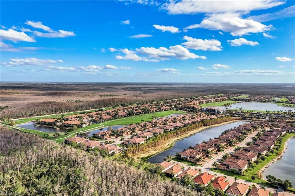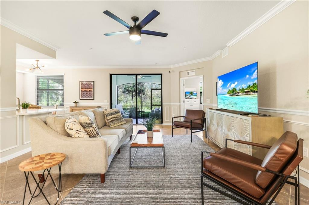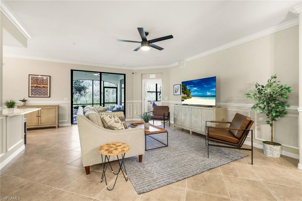 SOCIAL MEMBERSHIP INCLUDED! Step into this beautifully appointed first-floor corner coach home, featuring three spacious bedrooms, two full baths, and a two-car attached garage. The moment you enter, you’ll appreciate the exquisite details—crown molding, elegant wainscoting, and diagonally laid tile flooring. The open Great Room floor plan is perfect for entertaining, while the kitchen is discreetly tucked behind a wall to keep your living spaces neat and inviting. The primary suite serves as a private retreat with dual walk-in closets and a luxurious bathroom featuring an oversized soaking tub, separate shower, and dual vanities. A split-bedroom design ensures privacy for guests with two additional bedrooms and a full bath. Enjoy casual meals or game nights in the charming breakfast nook, and host more formal gatherings in the defined dining area of the Great Room. Unwind on the spacious screened lanai overlooking tranquil wooded views for ultimate privacy. Tucked away on a quiet cul-de-sac, this home offers a peaceful setting to embrace the SWFL lifestyle. Residents have access to an amenity-rich center with a lagoon-style pool featuring a waterfall and lap lanes, poolside cabanas and café, a state-of-the-art fitness center, the U-Topia full-service spa and sauna, and a stunning clubhouse offering fine dining, game rooms, and meeting spaces.